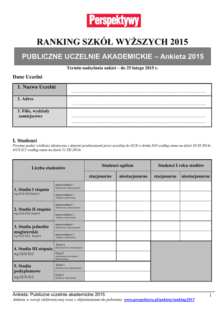 RANKING SZKÓŁ WYŻSZYCH 2015 PUBLICZNE UCZELNIE AKADEMICKIE – Ankieta 2015 Termin nadsyłania ankiet – do 25 lutego 2015 r. Dane Uczelni 1. Nazwa Uczelni ................................................................................................................................................................ 2. Adres ……........................................................................................................................................................ 3. Filie, wydziały zamiejscowe ................................................................................................................................................................ ................................................................................................................................................................ I. Studenci Prosimy podać wielkości identyczne z danymi przekazanymi przez uczelnię do GUS w druku S10 według stanu na dzień 30 XI 2014r. GUS S12 według stanu na dzień 31 XII 2014r. Liczba studentów Studenci ogółem stacjonarne niestacjonarne Studenci I roku studiów stacjonarne niestacjonarne sprawozdanie 1 1. Studia I stopnia wg GUS S10 Dział 4 studenci bez cudzoziemców sprawozdanie 2 studenci cudzoziemcy sprawozdanie 1 2. Studia II stopnia wg GUS S10, Dział 4 studenci bez cudzoziemców sprawozdanie 2 studenci cudzoziemcy 3. Studia jednolite magisterskie sprawozdanie 1 studenci bez cudzoziemców wg GUS S10, Dział 4 sprawozdanie 2 4. Studia III stopnia doktoranci bez cudzoziemców wg GUS S12 Dział 5 5. Studia podyplomowe słuchacze bez cudzoziemców wg GUS S12 słuchacze cudzoziemcy studenci cudzoziemcy Dział 4 cudzoziemcy na studiach doktoranckich Dział 1 Dział 2 Ankieta: Publiczne uczelnie akademickie 2015 Ankieta w wersji elektronicznej wraz z objaśnieniami do pobrania: www.perspektywy.pl/ankiety/ranking2015 1 II. Kadra naukowa W tabeli II.1 prosimy podać wielkości identyczne z danymi przekazanymi do GUS w druku S12 według stanu na dzień 31 XII 2014 oraz za rok 2013 – według stanu na dzień 31XII 2013 II.1 Nauczyciele akademiccy wg GUS S12 Dział 9 Według GUS za rok 2013 stanu na 31 XII 2013 Wyszczególnienie Ogółem (02+03+07+09+11+13+15+16+17+ 18+19) 01 Zwyczajny 02 Nadzwyczajny 03 Profesor (wiersze 04+05+06) w tym z tytułem prof. 04 w tym ze st. dr hab. 05 w tym ze stopniem dr 06 Wizytujący z pełnozatrud. zatrudnieni w pełnozatrud. niepełnozatrud. podst. miejscu pracy Według GUS za rok 2014 stanu na 31 XII 2014 pełnozatrud. z pełnozatrud. zatrudnieni w podst. miejscu pracy niepełnozatrud. 07 w tym ze stopniem dr 08 09 Docent w tym ze stopniem dr hab. 10 11 Adiunkt w tym ze stopniem dr hab. 12 Asystent 13 w tym ze stopniem dr Pozostali (wiersze 15+16+17+18+19) 14 x Uwaga! Głównym źródłem danych o zatrudnieniu osób z tytułami i stopniami naukowymi będzie baza POLON. Z tego względu prosimy o aktualizację danych w bazach POLON w nieprzekraczalnym terminie 20 lutego br.! II.2 Tytuły i stopnie naukowe Nadane *1) przez uczelnię Stopień doktora hab. Rok Tytuł profesora nadania wnioskowany przez uprawnione jednostki uczelni i nadany przez Prezydenta RP nadany przez uprawnione jednostki uczelni Stopień doktora nadany przez uprawnione jednostki uczelni 2013 2014 Uzyskane *2) przez pracowników uczelni zatrudnionych w podstawowym miejscu pracy Tytuł profesora Stopień doktora hab. Stopień doktora nadany przez Prezydenta RP 2013 2014 *1) Prosimy o podanie liczby osób, którym Państwa uczelnia nadała stopień naukowy lub wnioskowała o nadanie tytułu prof. (zarówno swoim pracownikom, jak i innym osobom). *2)Uzyskane przez pracowników uczelni w 2014 roku zatrudnionych w podstawowym miejscu pracy. Prosimy o podanie liczby pracowników będących u Państwa zatrudnionych na etacie, którzy uzyskali tytuły i stopnie we własnej lub innej uczelni (nie bierze się pod uwagę pracowników zatrudnionych na umowę zlecenie, o dzieło itp.). Ankieta: Publiczne uczelnie akademickie 2015 Ankieta w wersji elektronicznej wraz z objaśnieniami do pobrania: www.perspektywy.pl/ankiety/ranking2015 2 Przykład: - osoba, która uzyskała stopień doktora nadany przez Państwa uczelnię i jest u Państwa zatrudniona na etacie, będzie wykazana w Nadanych i Uzyskanych; - osoba, która uzyskała stopień doktora nadany przez inną uczelnię, a jest u Państwa zatrudniona na etacie, będzie wykazana tylko w Uzyskanych. III. Działalność badawczo-rozwojowa W tabeli III.1 prosimy podać wielkości identyczne z danymi przekazanymi do GUS w druku PNT-01/s za rok sprawozdawczy 2013 – według sprawozdania z dnia 21.III.2014. III.1 Nakłady wewnętrzne na działalność B+R i źródła finansowania wg GUS PNT-01/s Dział 1 (sprawozdanie za rok 2013, z dnia 21.III.2014) – w tys. zł ze znakiem po przecinku Nakłady wewnętrzne faktycznie poniesione (bez amortyzacji środków trwałych) (wiersze 02+05) Nakłady bieżące ogółem Nakłady inwestycyjne na środki trwałe ogółem (wiersze 07+08+11) 01 02 06 z nakładów bieżących (wiersz 02) 1 Z nakładów wewnętrznych (bieżących i inwestycyjnych) przypada na środki otrzymane od: wiersze 19+21+22+23+24+25+34 rubryka 1 = wiersz 02, wiersze 19+21+22+23+24+25+34 rubryka 2 = wiersz 06 środki budżetu państwa (MNiSW, MRR, innych resortów, JST) w tym udział środków krajowych w projektach współfinansowanych ze środków UE 19 20 jednostek naukowych PAN i instytutów badawczych 21 krajowych szkół wyższych 22 krajowych przedsiębiorstw 23 krajowych prywatnych instytucji niedochodowych 24 środki pochodzące z zagranicy (wiersze 25+26+27+30): 25 Komisji Europejskiej 26 organizacji międzynarodowych 27 przedsiębiorstw (wiersze 28+29) 28 w tym z krajów UE z tego od z nakładów inwestycyjnych (wiersz 06) 2 29 szkół wyższych 30 zagranicznych instytucji rządowych 31 prywatnych instytucji niedochodowych 32 pozostałych podmiotów 33 środki własne 34 III.2 Zatrudnieni w działa