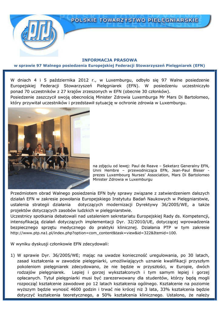 INFORMACJA PRASOWA w sprawie 97 Walnego posiedzenia Europejskiej Federacji Stowarzyszeń Pielęgniarek (EFN) W dniach 4 i 5 października 2012 r., w Luxemburgu, odbyło się 97 Walne posiedzenie Europejskiej Federacji Stowarzyszeń Pielęgniarek (EFN). W posiedzeniu uczestniczyło ponad 70 uczestników z 27 krajów zrzeszonych w EFN (obecnie 30 członków). Posiedzenie zaszczycił swoją obecnością Minister Zdrowia Luxemburga Mr Mars Di Bartolomeo, który przywitał uczestników i przedstawił sytuację w ochronie zdrowia w Luxemburgu. na zdjęciu od lewej: Paul de Reave – Seketarz Generalny EFN, Unni Hembre – przewodnicząca EFN, Jean-Paul Bleser prezes Luxembourg Nurses’ Association, Mars Di Bartolomeo Minister Zdrowia w Luxemburgu Przedmiotem obrad Walnego posiedzenia EFN były sprawy związane z zatwierdzeniem dalszych działań EFN w zakresie powołania Europejskiego Instytutu Badań Naukowych w Pielęgniarstwie, ustalenia strategii działania dotyczących modernizacji Dyrektywy 36/2005/WE, a także projektów dotyczących zasobów ludzkich w pielęgniarstwie. Uczestnicy spotkania debatowali nad ustaleniem sekretariatu Europejskiej Rady ds. Kompetencji, intensyfikacją działań dotyczących implementacji Dyr. 32/2010/UE, dotyczącej wprowadzenia bezpiecznego sprzętu medycznego do praktyki klinicznej. Działania PTP w tym zakresie http://www.ptp.na1.pl/index.php?option=com_content&task=view&id=322&Itemid=100. W wyniku dyskusji członkowie EFN zdecydowali: 1) W sprawie Dyr. 36/2005/WE; mając na uwadze konieczność uregulowania, po 30 latach, zasad kształcenia w zawodzie pielęgniarki, umożliwiających uznanie kwalifikacji przyszłym pokoleniom pielęgniarek zdecydowano, że nie będzie w przyszłości, w Europie, dwóch rodzajów pielęgniarek. Lepiej i gorzej wykształconych i tym samym lepiej i gorzej opłacanych. Tytuł pielęgniarki musi być zarezerwowany dla studentów, którzy będą mogli rozpocząć kształcenie zawodowe po 12 latach kształcenia ogólnego. Kształcenie na poziomie wyższym będzie wynosić 4600 godzin i trwać nie krócej niż 3 lata, 33% kształcenia będzie dotyczyć kształcenia teoretycznego, a 50% kształcenia klinicznego. Ustalono, że należy wprowadzić zmiany w załączniku nr V (zamiast przedmiotów, 6 kompetencji opracowanych przez powołany przez Zespół powołany przez EFN). W chwili obecnej Komisja proponuje wpisanie do Dyrektywy 3 kompetencji zamiast zmiany załącznika. Negocjacje trwają. W dniu 16.10.2012 r. odbędzie się spotkanie w PE w sprawie, kolejne głosowania nad poprawkami do Dyrektywy w dniu 6 listopada 2012 r.. Czy uda się osiągnąć wspólny dla pielęgniarek w Europie cel?, czy potrafimy mówić jednym głosem w tej ważnej dla nas sprawie ? to pokaże niedaleka przyszłość. EFN będzie gromadzić informacje o kompetencjach pielęgniarek w UE. 2) Zmiany w Konstytucji EFN. W związku z koniecznością zapewnienia stabilności funkcjonowania EFN podjęto starania dokonania zmian w Regulaminie wewnętrznym EFN, w wyniku dyskusji przyjęto zaproponowane zmiany. Konstytucja i Regulamin wewnętrzny EFN będzie opublikowany w dzienniku urzędowym w UE do końca tego roku. 3) Europejski Instytut Badań Naukowych w Pielęgniarstwie. Członkowie posiedzenia zdecydowali o kontynuowaniu prac nad tworzeniem Instytutu, którego celem będzie gromadzenie badań i wykorzystywanie ich w lobbyingu EFN. Kolejna rewizja prowadzonych działań będzie miała miejsce na 98 posiedzeniu EFN w kwietniu 2013 r. 4) Dyr. 32/2010/UE. Zgromadzenie zdecydowało, że celem ustalenia aktualnej sytuacji dotyczącej implementacji Dyrektywy do 11 stycznia będą zgromadzone raporty ze stowarzyszeń pielęgniarskich w sprawie. W Raporcie należy podać informacje o sytuacji w kraju i działaniu stowarzyszeń w tym zakresie. Przedstawiciel Hiszpańskiej Rady Pielęgniarek przedstawił także projekt e-learningowego programu kształcenia ustawicznego w zakresie zranień dla pielęgniarek. Zgromadzenie ustaliło, że nie może rekomendować jednego narzędzia, ponieważ istnieją już podobne narzędzia w innych krajach, zainteresowane nim organizacje mogą zwracać się bezpośrednio do właściciela praw do programu. 5) Podjęto decyzje o uruchomienia sekretariatu Europejskiej Rady ds. Kompetencji (European Skills Council) oraz przyjęto stanowisko w sprawie Europejskiej Rady ds. zatrudnienia i umiejętności dla pielęgniarek i pracowników opieki. Ustalono, że do stowarzyszeń pielęgniarskich będzie wysłana matryca kompetencji dla pielęgniarek z prośbą o uzupełnienie i przekazanie informacji do biura EFN do 15 listopada 2012 r. 6) Zrewidowano stanowisko EFN w sprawie zróżnicowania umiejętności w pielęgniarstwie (the EFN Position Statement on Skill Mix), odnośne stanowisko PTP http://www.ptp.na1.pl/pliki/pdf/PTP_stanowisko_umiejetnosci_i_kompetencje.pdf 7) Dyskutowano nad reprezentacją pielęgniarek w Biurze WHO oraz przedstawiono ustalenia w sprawie. 8) Ustalono, że dokument dotyczący kształcenia ustawicznego w UE (CPD) będzie dokumentem wewnętrznym, oczekuje się uaktualnienia informacji od organizacji, które jeszcze tego nie zrobiły (termin 26.09.2012 r.). 9) Jak zawsze swój raport z działań przedstawiło Europejskie Stowarzyszenie Studentów Pielęgniarstwa 2 W dniu 5 października 2012 r. odbyły się wybory uzupełniające do Zarządu EFN (raz na dwa lata uzupełniany, wymieniany jest częściowo skład Zarządu). W wyniku głosowania w skład Zarządu weszli: Branka Rimac (Chorwacja, Croatian Nurses Association) jako wiceprzewodnicząca, Peter Carter (Wielka Brytania, Royal College of Nursing) i Herdís Gunnarsdóttir (Islandia, Icelandic Nurses' Association), jako członkowie Zarządu. Obecny skład Zarządu EFN na zdjęciu od lewej: P. Carter, P. Théraulaz, S. Dicson, U. Hembre, P. De Reave, H. Gunnarsdóttir, D. Kilańska. Na zakończenie spotkania David Benton, Dyrektor Generalny Międzynarodowej Rady Pielę