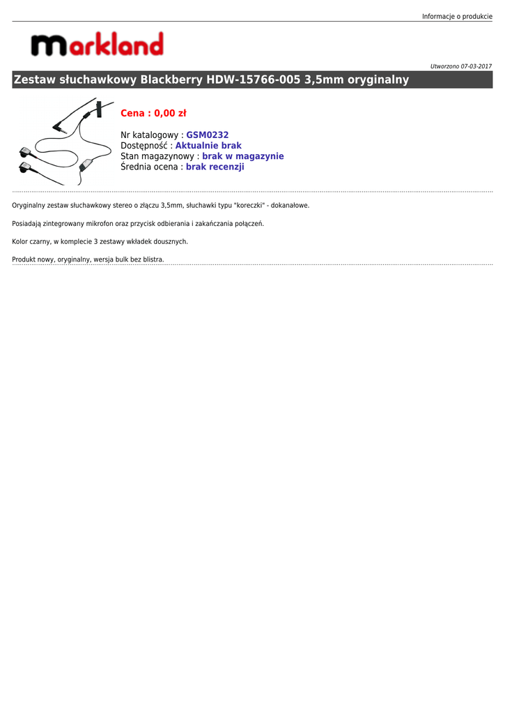 Informacje o produkcie Utworzono 07-03-2017 Zestaw słuchawkowy Blackberry HDW-15766-005 3,5mm oryginalny Cena : 0,00 zł Nr katalogowy : GSM0232 Dostępność : Aktualnie brak Stan magazynowy : brak w magazynie Średnia ocena : brak recenzji Oryginalny zestaw słuchawkowy stereo o złączu 3,5mm, słuchawki typu "koreczki" - dokanałowe. Posiadają zintegrowany mikrofon oraz przycisk odbierania i zakańczania połączeń. Kolor czarny, w komplecie 3 zestawy wkładek dousznych. Produkt nowy, oryginalny, wersja bulk bez blistra.
