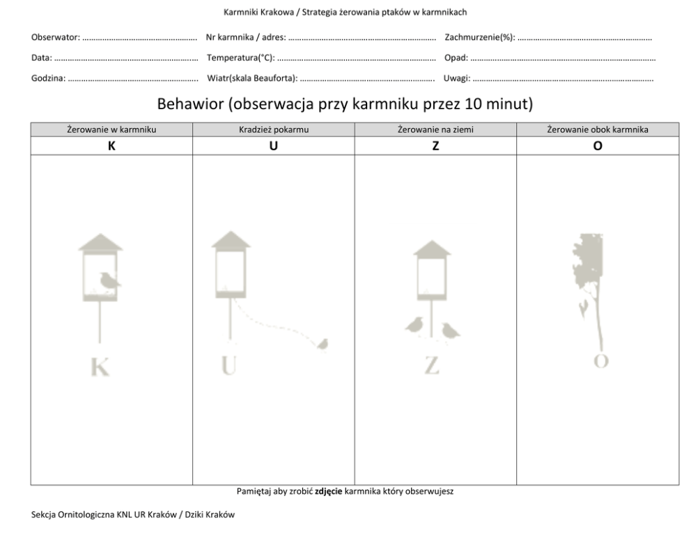 Karmniki Krakowa / Strategia żerowania ptaków w karmnikach Obserwator: ……………………………………………. Nr karmnika / adres: …………………………………………………………. Zachmurzenie(%): ….………………………………………………… Data: ……………………………………………………..… Temperatura(°C): ……………………………………………………………… Opad: ………………………………………………………………………… Godzina: ………………………………………………….. Wiatr(skala Beauforta): ……………………………………………………. Uwagi: ………………………………………………………………………. Behawior (obserwacja przy karmniku przez 10 minut) Żerowanie w karmniku Kradzież pokarmu Żerowanie na ziemi Żerowanie obok karmnika K U Z O Pamiętaj aby zrobid zdjęcie karmnika który obserwujesz Sekcja Ornitologiczna KNL UR Kraków / Dziki Kraków Karmniki Krakowa / Strategia żerowania ptaków w karmnikach Obserwacje w otoczeniu karmnika (w promieniu 50 m przez 10 minut) Uwagi: Sekcja Ornitologiczna KNL UR Kraków / Dziki Kraków