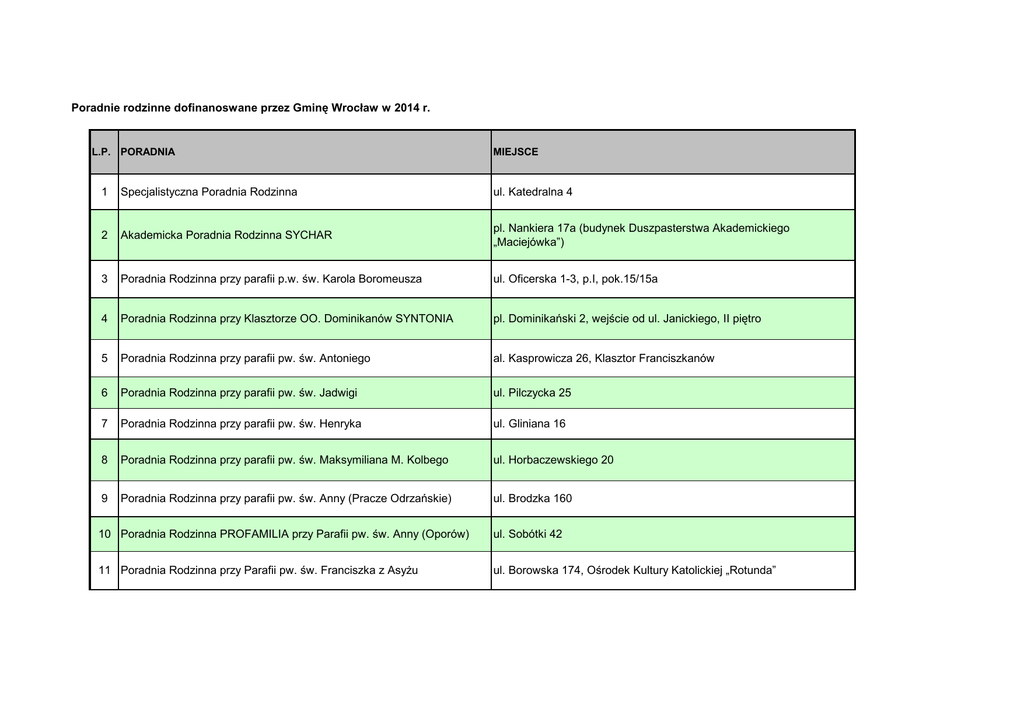 Poradnie rodzinne dofinanoswane przez Gminę Wrocław w 2014 r. L.P. PORADNIA MIEJSCE 1 Specjalistyczna Poradnia Rodzinna ul. Katedralna 4 2 Akademicka Poradnia Rodzinna SYCHAR pl. Nankiera 17a (budynek Duszpasterstwa Akademickiego „Maciejówka”) 3 Poradnia Rodzinna przy parafii p.w. św. Karola Boromeusza ul. Oficerska 1-3, p.I, pok.15/15a 4 Poradnia Rodzinna przy Klasztorze OO. Dominikanów SYNTONIA pl. Dominikański 2, wejście od ul. Janickiego, II piętro 5 Poradnia Rodzinna przy parafii pw. św. Antoniego al. Kasprowicza 26, Klasztor Franciszkanów 6 Poradnia Rodzinna przy parafii pw. św. Jadwigi ul. Pilczycka 25 7 Poradnia Rodzinna przy parafii pw. św. Henryka ul. Gliniana 16 8 Poradnia Rodzinna przy parafii pw. św. Maksymiliana M. Kolbego ul. Horbaczewskiego 20 9 Poradnia Rodzinna przy parafii pw. św. Anny (Pracze Odrzańskie) ul. Brodzka 160 10 Poradnia Rodzinna PROFAMILIA przy Parafii pw. św. Anny (Oporów) ul. Sobótki 42 11 Poradnia Rodzinna przy Parafii pw. św. Franciszka z Asyżu ul. Borowska 174, Ośrodek Kultury Katolickiej „Rotunda” 12 Fundacja „Sancta Familia” Poradnia Rodzinna ul. Monte Cassino 64 13 Stowarzyszenie Katolicki Ruch Antynarkotyczny „KARAN” ul. Skoczylasa 8 14 Poradnia Rodzinna przy Fundacji Evangelium Vitae ul. Rydygiera 22-28 15 Poradnia Rodzinna - Fundacja Akita ul Kochanowskiego 34/2 16 Stowarzyszenie APERIAMUS – Wspieranie Rozwoju Osobowego ul. Jedności Narodowej 85/1 17 Stowarzyszenie Psychoedukacji i Terapii „EVOLUTIO” ul. Legnicka 55/5 18 Punkt Poradnictwa i Terapii Rodzinnej „ISKIERKA” pl. św. Macieja 7 19 Fundacja na rzecz Edukacji i Zdrowia DARUMA ul. Bednarska 3/2, Ośrodek Terapeutyczny "Harmonia" 20 Towarzystwo Rozwoju Rodziny Oddział Wojewódzki we Wrocławiu ul. Zelwerowicza 4 oraz ul. Podwale 74 of. 23 21 Wrocławskie Stowarzyszenie na Rzecz Dzieci i Młodzieży „BAJKA” ul. Kwiska 5/7, lok. 216 22 Fundacja IN POSTERUM ul. Strzegomska 7 23 Poradnia rodzinna „Pod Lwami” Demokratyczna Unia Kobiet - Klub Wrocławski 24 Fundacja „Dajmy Szansę” ul. Zelwerowicza 16/18, lokal 3 ul. Piłsudskiego 95, domofon 3 i 4