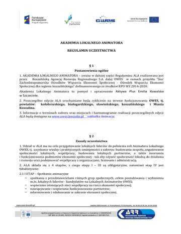 AKADEMIA LOKALNEGO ANIMATORA REGULAMIN UCZESTNICTWA §1 Postanowienia ogólne 1. AKADEMIA LOKALNEGO ANIMATORA – zwana w dalszej części Regulaminu ALA realizowana jest przez Koszalińską Agencję Rozwoju Regionalnego S.A. dalej OWES w ramach projektu "Sieć Zachodniopomorska Ośrodków Wsparcia Ekonomii Społecznej - Ośrodek Wsparcia Ekonomii Społecznej dla regionu koszalińskiego" dofinansowanego ze środków RPO WZ 2014-2020. Akademia Lokalnego Animatora to pomysł i opracowanie Aktywa Plus Emilia Kowalska w Szczecinie. 2. Poszczególne edycje ALA uruchamiane będą cyklicznie na terenie funkcjonowania OWES, tj. powiatów: kołobrzeskiego, białogardzkiego, sławieńskiego, koszalińskiego i Miasta Koszalina. 3. Informacje o terminach naboru oraz miejscach i harmonogramie realizacji poszczególnych edycji ALA będą dostępne na www.owes.koszalin.pl zakładka Animacja. §2 Zasady uczestnictwa 1. Udział w ALA ma na celu przygotowanie lokalnych liderów do pełnienia roli Animatora Lokalnego OWES, tj. uzyskanie wiedzy i praktycznych umiejętności z zakresu: budowania zespołu, angażowanie społeczności lokalnych, współpracy, budowania lokalnych partnerstw, a także tworzenia i funkcjonowania podmiotów ekonomii społecznej - tak aby ożywić społeczność lokalną do działania i rozwoju oraz podejmować współpracę z organizacjami, biznesem i administracją. 2. ALA składa się z 4 etapów, z czego etapy I – III są obligatoryjne, natomiast etap IV jest fakultatywne: 2.1 I ETAP – Spotkania animacyjne − spotkania z przedstawicielami różnych grup społecznych, celem poszukiwania i wyłonienia m.in. lokalnych liderów - kandydatów na Lokalnych Animatorów OWES; − wspieranie istniejących sieci współpracy na rzecz ekonomii społecznej; − nawiązywanie i wspieranie funkcjonowanie partnerstw; − informowanie i edukowanie w zakresie ekonomii społecznej. 2.2 II ETAP – Zajęcia edukacyjne 2.2.1 Szkolenia i spotkania edukacyjne dla lokalnych liderów: − kompleksowa wiedza i umiejętności w zakresie pracy z grupą i animowania rozwoju lokalnych społeczności (w tym poprzez narzędzia coachingu); − zrozumienie mechanizmów funkcjonowania ekonomii społecznej; − rozwijanie i doskonalenie metod pracy na rzecz aktywizacji i integracji lokalnych społeczności; − wskazanie i pomoc w doborze narzędzi animacji lokalnej i budowania partnerstw; − wzmocnienie roli lokalnych liderów. 2.2.2 Tematyka zajęć edukacyjnych obejmuje: − narzędzia pracy lokalnego animatora - jak skutecznie dotrzeć do społeczności lokalnej i otoczenia − diagnozę środowiska lokalnego − proces budowania partnerstw lokalnych − tworzenie podmiotów ekonomii społecznej - charakterystyka podmiotów w sektorze ekonomii społecznej, tworzenie stowarzyszeń, fundacji, spółdzielni socjalnych krok po kroku, odpłatna działalność pożytku publicznego czy działalność gospodarcza - co wybrać? − pozyskiwanie środków na finansowanie działalności podmiotów integracji i ekonomii społecznej - rodzaje finansowania, np. crowdfunding, jak i gdzie szukać źródeł, tworzenie projektów na rzecz lokalnych społeczności w gminie/powiecie, zlecanie zadań publicznych). 2.3 III ETAP – Doradztwo 2.3.1 Wsparcie lokalnych liderów przez kadrę OWES w tym: − indywidualne doradztwo z zakresu aktywizacji i budowania partnerstw lokalnych, doradztwo formalno-prawne, które ułatwi tworzenie, rejestrację i funkcjonowanie organizacji, − uzupełnienie uzyskanych podczas zajęć edukacyjnych umiejętności, dzięki którym skutecznie opracujesz, poprowadzisz i wypromujesz projekt dla społeczności lokalnej, − możliwość korzystania z doradztwa dodatkowego w ramach OWES. 2.3.2 Na zakończenie udziału w etapach I-III ALA, uczestnik otrzymuje certyfikat Lokalnego Animatora OWES. 2.4 IV ETAP – Wydarzenia animacyjne Lokalni Animatorzy wezmą udział w: − debatach, targach, eventach itp. – na poziomie lokalnym i angażujące w ich przygotowanie lokalnych animatorów i lokalne środowiska, aby pobudzić aktywność lokalną i partycypację społeczną najbliższego środowiska; − wizytach studyjnych, celem doświadczenia istnienia realnego podmiotu, inspiracji, motywacji do działania. 2.5 Lokalni Animatorzy, o których mowa w § 2 ust. 2.3.2 regulaminu, którzy wezmą udział w etapie IV ALA (§ 2 ust. 2.4-2.5) otrzymają certyfikat Lokalnego Animatora OWES II stopnia. §3 Zasady rekrutacji 1. Rekrutacja do ALA prowadzona jest przez OWES. 2. ALA kierowana jest do aktywnych mieszkańców woj. zachodniopomorskiego - powiatów: białogardzkiego, kołobrzeskiego, koszalińskiego, sławieńskiego i Miasta Koszalina, angażujących się na rzecz społeczności lokalnych, tj.: a) przedstawicieli społeczności lokalnych (grup nieformalnych, sołectw, kół gospodyń wiejskich, rad osiedli, itp.); b) osób fizycznych zainteresowanych założeniem, prowadzeniem i pracą w podmiocie ekonomii społecznej; c) przedstawicieli podmiotów ekonomii społecznej (fundacji, stowarzyszeń, klubów integracji społecznej, centrów integracji społecznej, spółdzielni socjalnych, spółdzielni inwalidów, itp.). 3. Pierwszeństwo w ALA będą miały osoby spełniające następujące warunki dodatkowe: a) osoba zagrożona wykluczeniem społecznym*; b) osoba fizyczna zainteresowana założeniem, prowadzeniem i pracą w sektorze ekonomii społecznej, nie będąca przedstawicielem podmiotu ekonomii społecznej. 4. Rekrutacja ma charakter otwarty. Pierwszeństwo będą miały osoby spełniające 2 z 2 warunków dodatkowych, następnie 1 z 2 kryteriów dodatkowych – o których mowa w § 3 pkt 3 regulaminu. 5. Korzystanie z wszystkich form wsparcia oferowanych w ramach ALA jest bezpłatne. 6. Zgłoszenie udziału w ALA odbywa się poprzez wypełnienie FORMULARZA ZGŁOSZENIOWEGO „AKADEMIA LOKALNEGO ANIMATORA” do pobrania ze strony internetowej www.karrsa.pl Formularz należy wypełnić i dostarczy