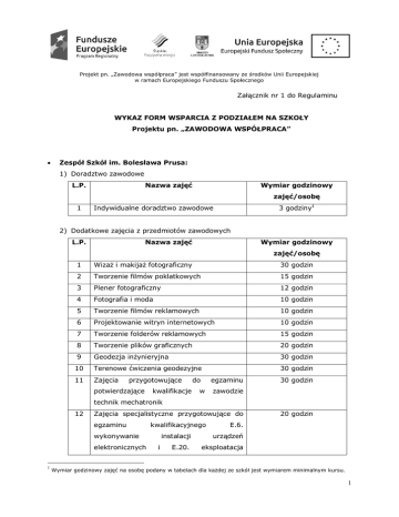 Projekt pn. „Zawodowa współpraca” jest współfinansowany ze środków Unii Europejskiej w ramach Europejskiego Funduszu Społecznego Załącznik nr 1 do Regulaminu WYKAZ FORM WSPARCIA Z PODZIAŁEM NA SZKOŁY Projektu pn. „ZAWODOWA WSPÓŁPRACA” Zespół Szkół im. Bolesława Prusa: 1) Doradztwo zawodowe L.P. Nazwa zajęć Wymiar godzinowy zajęć/osobę 1 3 godziny1 Indywidualne doradztwo zawodowe 2) Dodatkowe zajęcia z przedmiotów zawodowych L.P. Nazwa zajęć Wymiar godzinowy zajęć/osobę 1 Wizaż i makijaż fotograficzny 30 godzin 2 Tworzenie filmów poklatkowych 15 godzin 3 Plener fotograficzny 12 godzin 4 Fotografia i moda 10 godzin 5 Tworzenie filmów reklamowych 10 godzin 6 Projektowanie witryn internetowych 10 godzin 7 Tworzenie folderów reklamowych 15 godzin 8 Tworzenie plików graficznych 20 godzin 9 Geodezja inżynieryjna 30 godzin 10 Terenowe ćwiczenia geodezyjne 30 godzin 11 Zajęcia przygotowujące potwierdzające kwalifikacje do egzaminu w 30 godzin zawodzie technik mechatronik 12 Zajęcia specjalistyczne przygotowujące do egzaminu kwalifikacyjnego wykonywanie elektronicznych 1 i 20 godzin E.6. instalacji urządzeń E.20. eksploatacja Wymiar godzinowy zajęć na osobę podany w tabelach dla każdej ze szkół jest wymiarem minimalnym kursu. 1 Projekt pn. „Zawodowa współpraca” jest współfinansowany ze środków Unii Europejskiej w ramach Europejskiego Funduszu Społecznego urządzeń elektronicznych 13 Elektroniczne systemy inteligentnych 20 godzin budynków 3) Kursy, w tym kursy certyfikowane L.P. Nazwa zajęć Wymiar godzinowy zajęć/osobę 1 Kurs spawania MAG 140 godzin 2 Kurs obrabiarek sterowanych numerycznie 90 godzin 3 Kurs SEP 1kV 60 godzin 4 Kurs AutoCAD Civil 3D 21 godzin 5 Kurs AutoCAD MAP 21 godzin 6 Certyfikowany kurs dla drukarzy 80 godzin 4) Dodatkowe zajęcia językowe L.P. Nazwa zajęć Wymiar godzinowy zajęć/osobę 1 Język angielski zawodowy 15 godzin 5) Praktyki/staże zawodowe L.P. Nazwa zajęć Wymiar godzinowy zajęć/osobę 1 Praktyka/ staż u pracodawcy 150 godzin 6) Kursy przygotowujące na studia L.P. Nazwa zajęć Wymiar godzinowy zajęć/osobę 1 Kurs z kierunku fototechnik 30 godzin 2 Kurs z kierunku technik geodeta 30 godzin 3 Kurs z kierunku technik mechatronik 30 godzin 4 Kurs z kierunku technik elektronik 30 godzin 2 Projekt pn. „Zawodowa współpraca” jest współfinansowany ze środków Unii Europejskiej w ramach Europejskiego Funduszu Społecznego 3