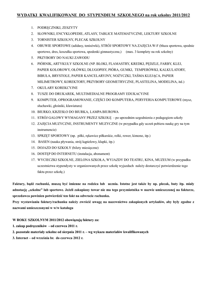 WYDATKI KWALIFIKOWANE DO STYPENDIUM SZKOLNEGO na rok szkolny 2011/2012 1. PODRĘCZNIKI, ZESZYTY 2. SŁOWNIKI, ENCYKLOPEDIE, ATLASY, TABLICE MATEMATYCZNE, LEKTURY SZKOLNE 3. TORNISTER SZKOLNY, PLECAK SZKOLNY 4. OBUWIE SPORTOWE (adidasy, tenisówki), STRÓJ SPORTOWY NA ZAJĘCIA W-F (bluza sportowa, spodnie sportowe, dres, koszulka sportowa, spodenki gimnastyczne,) (max. 3 komplety na rok szkolny) 5. PRZYBORY DO NAUKI ZAWODU 6. PIÓRNIK, ARTYKUŁY SZKOLNE (NP. BLOKI, FLAMASTRY, KREDKI, PĘDZLE, FARBY, KLEJ, PAPIER KOLOROWY, OŁÓWKI, DŁUGOPISY, PIÓRA, GUMKI, TEMPERÓWKI, KALKULATORY, BIBUŁA, BRYSTOLE, PAPIER KANCELARYJNY, NOŻYCZKI, TAŚMA KLEJĄCA, PAPIER MILIMETROWY, KOREKTORY, PRZYBORY GEOMETRYCZNE, PLASTELINA, MODELINA, itd.) 7. OKULARY KOREKCYJNE 8. TUSZE DO DRUKAREK, MULTIMEDIALNE PROGRAMY EDUKACYJNE 9. KOMPUTER, OPROGRAMOWANIE, CZĘŚCI DO KOMPUTERA, PERYFERIA KOMPUTEROWE (mysz, słuchawki, głośniki, klawiatura) 10. BIURKO, KRZESŁO DO BIURKA, LAMPA BIUROWA 11. STRÓJ GALOWY WYMAGANY PRZEZ SZKOŁĘ - po uprzednim uzgodnieniu z pedagogiem szkoły 12. ZAJĘCIA MUZYCZNE, INSTRUMENTY MUZYCZNE (w przypadku gdy uczeń pobiera naukę gry na tym instrumencie) 13. SPRZĘT SPORTOWY (np. piłki, rękawice piłkarskie, rolki, rower, kimono, itp.) 14. BASEN (nauka pływania, strój kąpielowy, klapki, itp.) 15. DOJAZD DO SZKOŁY (bilety miesięczne) 16. DOSTĘP DO INTERNETU (instalacja, abonament) 17. WYCIECZKI SZKOLNE, ZIELONA SZKOŁA, WYJAZDY DO TEATRU, KINA, MUZEUM (w przypadku uczestnictwa stypendysty w organizowanych przez szkołę wyjazdach należy dostarczyć potwierdzenie tego faktu przez szkołę.) Faktury, bądź rachunki, muszą być imienne na rodzica lub ucznia. Istotne jest także by np. plecak, buty itp. miały adnotację „szkolne” lub sportowe. Jeżeli zakupiony towar nie ma tego przymiotnika w nazwie umieszczonej na fakturze, sprzedawca powinien potwierdzić ten fakt na odwrocie rachunku. Przy wystawianiu faktury/rachunku należy zwrócić uwagę na nazewnictwo zakupionych artykułów, aby były zgodne z nazwami umieszczonymi w w/w katalogu W ROKU SZKOLNYM 2011/2012 obowiązują faktury za: 1. zakup podręczników - od czerwca 2011 r. 2. pozostałe materiały szkolne od sierpnia 2011 r. – wg wykazu materiałów kwalifikowanych 3. Internet – od września br. do czerwca 2012 r.