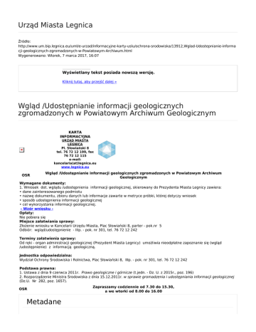 Urząd Miasta Legnica Źródło: http://www.um.bip.legnica.eu/uml/e-urzad/informacyjne-karty-uslu/ochrona-srodowiska/13912,Wglad-Udostepnianie-informa cji-geologicznych-zgromadzonych-w-Powiatowym-Archiwum.html Wygenerowano: Wtorek, 7 marca 2017, 16:07 Wyświetlany tekst posiada nowszą wersję. Kliknij tutaj, aby przejść dalej » Wgląd /Udostępnianie informacji geologicznych zgromadzonych w Powiatowym Archiwum Geologicznym KARTA INFORMACYJNA URZĄD MIASTA LEGNICA Pl. Słowiański 8 tel. 76 72 12 199, fax 76 72 12 115 e-mail: kancelaria(at)legnica.eu www.legnica.eu OSR Wgląd /Udostępnianie informacji geologicznych zgromadzonych w Powiatowym Archiwum Geologicznym Wymagane dokumenty: 1. Wniosek dot. wglądu /udostępnienia informacji geologicznej, skierowany do Prezydenta Miasta Legnicy zawiera: • dane zainteresowanego podmiotu • nazwę dokumentu, zbioru danych lub informacje zawarte w metryce próbki, której dotyczy wniosek • sposób udostępnienia informacji geologicznej • cel wykorzystania informacji geologicznej. - Wzór wniosku Opłaty: Nie pobiera się Miejsce załatwiania sprawy: Złożenie wniosku w Kancelarii Urzędu Miasta, Plac Słowiański 8, parter - pok.nr 5 Odbiór: wgląd/udostępnienie - IIIp. - pok. nr 301, tel. 76 72 12 242 Terminy załatwienia sprawy: Od ręki - organ administracji geologicznej (Prezydent Miasta Legnicy) umożliwia nieodpłatne zapoznanie się (wgląd /udostępnienie) z informacją geologiczną. Jednostka odpowiedzialna: Wydział Ochrony Środowiska i Rolnictwa, Plac Słowiański 8, IIIp. - pok. nr 301, tel. 76 72 12 242 Podstawa prawna: 1. Ustawa z dnia 9 czerwca 2011r. Prawo geologiczne i górnicze (t.jedn. - Dz. U. z 2015r., poz. 196) 2. Rozporządzenie Ministra Środowiska z dnia 15.12.2011r. w sprawie gromadzenia i udostępniania informacji geologicznej (Dz.U. Nr 282, poz. 1657). OSR Metadane Zapraszamy codziennie od 7.30 do 15.30, a we wtorki od 8.00 do 16.00 Data publikacji 09.08.2013 Rejestr zmianStarsze wersje dokumentu Podmiot udostępniający informację: Urząd Miasta Legnica Osoba wytwarzająca/odpowiadająca za informację: Bsiwicka Osoba udostępniająca informację: Jolanta Kozińska Wydział Ochrony Środowiska i Rolnictwa Osoba modyfikująca informację:
