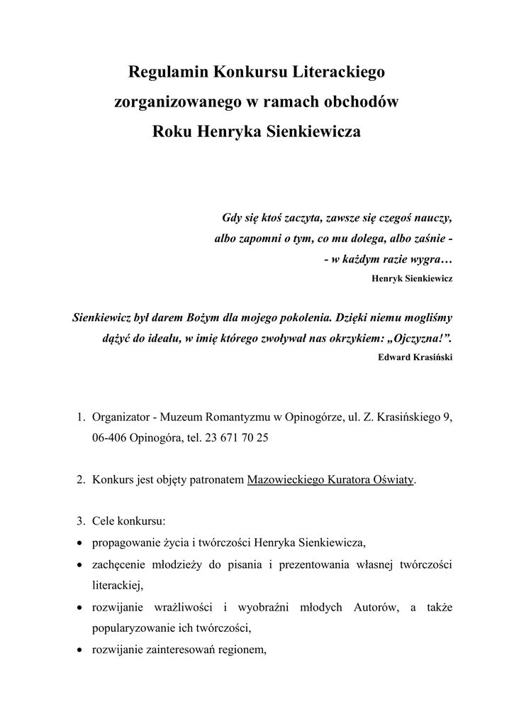 Regulamin Konkursu Literackiego zorganizowanego w ramach obchodów Roku Henryka Sienkiewicza Gdy się ktoś zaczyta, zawsze się czegoś nauczy, albo zapomni o tym, co mu dolega, albo zaśnie - w każdym razie wygra… Henryk Sienkiewicz Sienkiewicz był darem Bożym dla mojego pokolenia. Dzięki niemu mogliśmy dążyć do ideału, w imię którego zwoływał nas okrzykiem: „Ojczyzna!”. Edward Krasiński 1. Organizator - Muzeum Romantyzmu w Opinogórze, ul. Z. Krasińskiego 9, 06-406 Opinogóra, tel. 23 671 70 25 2. Konkurs jest objęty patronatem Mazowieckiego Kuratora Oświaty. 3. Cele konkursu: propagowanie życia i twórczości Henryka Sienkiewicza, zachęcenie młodzieży do pisania i prezentowania własnej twórczości literackiej, rozwijanie wrażliwości i wyobraźni młodych Autorów, a także popularyzowanie ich twórczości, rozwijanie zainteresowań regionem, kształtowanie kultury literackiej. 4. Konkurs skierowany jest do uczniów w dwóch kategoriach wiekowych: uczniowie gimnazjów – zadaniem jest napisanie listu na wzór listów Sienkiewicza z podróży, w którym uczniowie opiszą swoją „małą ojczyznę”, uczniowie szkół ponadgimnazjalnych – zadaniem jest napisanie pracy w dowolnej formie literackiej na temat: Współczesny patriotyzm młodych Polaków a miłość do ojczyzny przedstawiona w „Trylogii” H. Sienkiewicza. 5. Do konkursu dopuszczone zostaną utwory literackie napisane w języku polskim (objętość: do 5 stron znormalizowanego maszynopisu formatu A4, czcionka: Times New Roman rozmiar 12, interlinia: 1,5 wiersza, marginesy: 2,5 cm z każdej strony). 6. Utwór musi stanowić oryginalną twórczość osoby biorącej udział w konkursie i nie może być wcześniej publikowany. 7. Warunkiem uczestnictwa jest dostarczenie na adres organizatora wydruku komputerowego oraz wypełnionej karty zgłoszenia (zał. nr 1). 8. Prace wraz z kartami zgłoszeniowymi prosimy dostarczyć pocztą (decyduje data stempla pocztowego) lub osobiście do sekretariatu Muzeum w terminie do 31 października 2016 r. 9. Rozstrzygnięcie konkursu nastąpi 14 listopada 2016 r. Laureaci poinformowani zostaną o miejscu i terminie odbioru nagrody. 10.Organizator zastrzega sobie prawo do bezpłatnej publikacji całości lub fragmentów utworów nagrodzonych, wyróżnionych i tych, które wzbudziły zainteresowanie jury, także w celach promocyjnych. Zgłoszenie utworu do konkursu jest jednoznaczne za zgodą na jego publikację. 11. Utwory nie będą odsyłane do autorów. Przesłanie utworu na konkurs jest równoznaczne z akceptacją regulaminu. Regulamin i informacje o konkursie oraz karta zgłoszenia są dostępne na stronie: www.muzeumromantyzmu.pl KARTA ZGŁOSZENIA (załącznik nr 1 do regulaminu konkursu literackiego) Imię (imiona) i nazwisko ucznia ............................................................................................................ Dane kontaktowe: telefon, e-mail ............................................................................................................ Nazwa i adres szkoły, klasa ............................................................................................................ ............................................................................................................ ............................................................................................................ Imię i nazwisko nauczyciela przygotowującego ............................................................................................................. .................................... Podpis uczestnika ……..………………………….. Podpis rodzica/prawnego opiekuna .………………………………… Podpis i pieczęć dyrektora szkoły