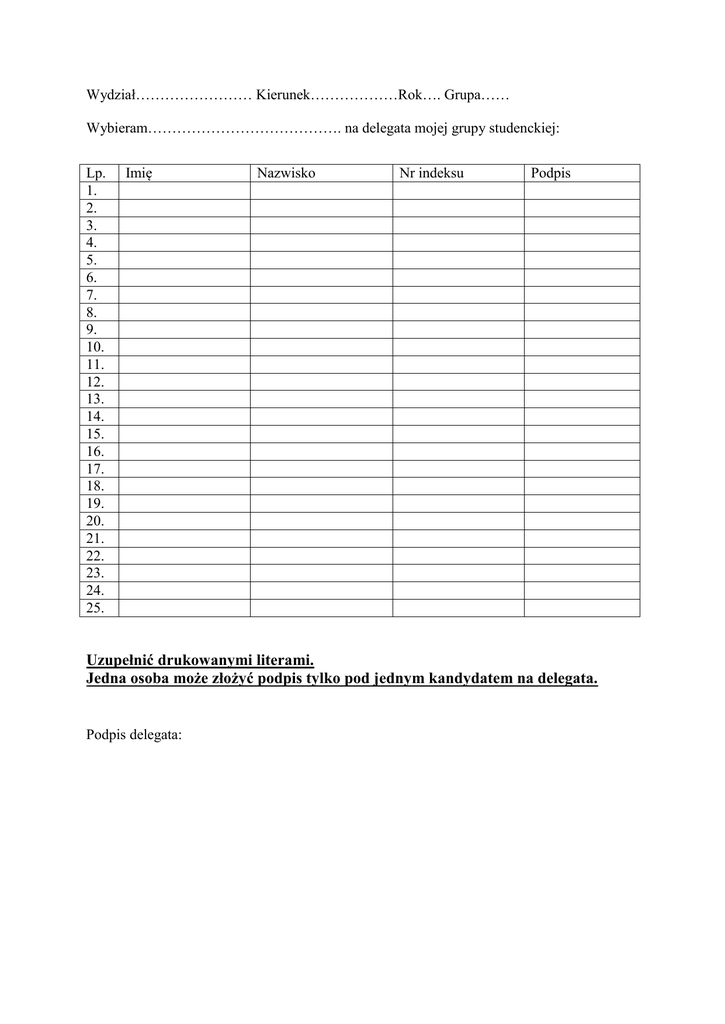 Wydział…………………… Kierunek………………Rok…. Grupa…… Wybieram…………………………………. na delegata mojej grupy studenckiej: Lp. 1. 2. 3. 4. 5. 6. 7. 8. 9. 10. 11. 12. 13. 14. 15. 16. 17. 18. 19. 20. 21. 22. 23. 24. 25. Imię Nazwisko Nr indeksu Podpis Uzupełnić drukowanymi literami. Jedna osoba może złożyć podpis tylko pod jednym kandydatem na delegata. Podpis delegata: