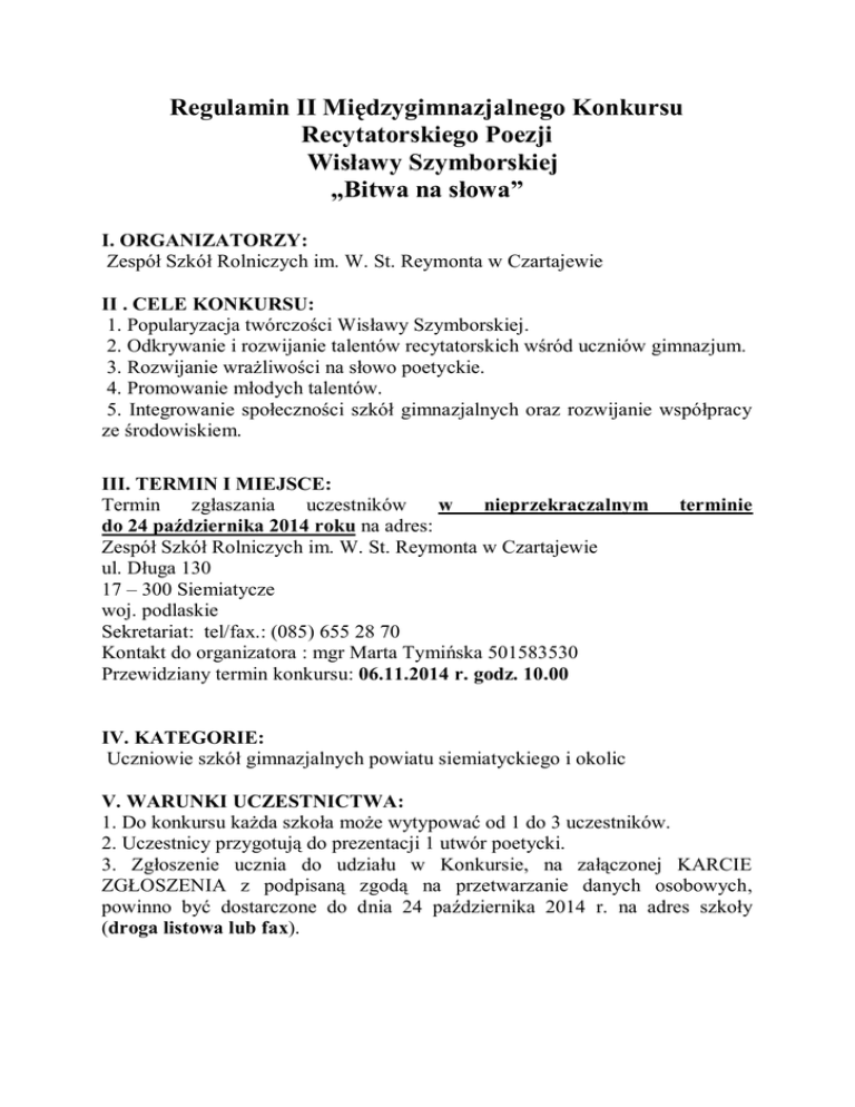 Regulamin II Międzygimnazjalnego Konkursu Recytatorskiego Poezji Wisławy Szymborskiej „Bitwa na słowa” I. ORGANIZATORZY: Zespół Szkół Rolniczych im. W. St. Reymonta w Czartajewie II . CELE KONKURSU: 1. Popularyzacja twórczości Wisławy Szymborskiej. 2. Odkrywanie i rozwijanie talentów recytatorskich wśród uczniów gimnazjum. 3. Rozwijanie wrażliwości na słowo poetyckie. 4. Promowanie młodych talentów. 5. Integrowanie społeczności szkół gimnazjalnych oraz rozwijanie współpracy ze środowiskiem. III. TERMIN I MIEJSCE: Termin zgłaszania uczestników w nieprzekraczalnym do 24 października 2014 roku na adres: Zespół Szkół Rolniczych im. W. St. Reymonta w Czartajewie ul. Długa 130 17 – 300 Siemiatycze woj. podlaskie Sekretariat: tel/fax.: (085) 655 28 70 Kontakt do organizatora : mgr Marta Tymińska 501583530 Przewidziany termin konkursu: 06.11.2014 r. godz. 10.00 terminie IV. KATEGORIE: Uczniowie szkół gimnazjalnych powiatu siemiatyckiego i okolic V. WARUNKI UCZESTNICTWA: 1. Do konkursu każda szkoła może wytypować od 1 do 3 uczestników. 2. Uczestnicy przygotują do prezentacji 1 utwór poetycki. 3. Zgłoszenie ucznia do udziału w Konkursie, na załączonej KARCIE ZGŁOSZENIA z podpisaną zgodą na przetwarzanie danych osobowych, powinno być dostarczone do dnia 24 października 2014 r. na adres szkoły (droga listowa lub fax). VI. KRYTERIA OCENIANIA: 1. Wybór wiersza 2. Interpretacja utworu 3. Kultura słowa 4. Stopień opanowania pamięciowego tekstu 5. Ogólny wyraz artystyczny 6. Uczestników oceniać będzie Jury powołane przez Organizatora konkursu. 7. Dopuszcza się recytowanie wierszy z podkładem muzycznym. VII. NAGRODY: Laureaci konkursu otrzymają nagrody i dyplomy pamiątkowe. UWAGI KOŃCOWE: Regulamin Konkursu, Karta Zgłoszenia dodatkowo dostępne są na stronie www.zsr-czartajew.pl Przesłanie zgłoszenia udziału w konkursie recytatorskim jest równoznaczne z akceptacją wszystkich punktów regulaminu. Osoby uczestniczące wyrażają zgodę na przetwarzanie danych osobowych oraz bezpłatne wykorzystanie ich wizerunku w ewentualnych materiałach filmowych, fotografiach oraz publikacjach promocyjnych realizowanych przez Organizatora (zgodnie z ustawą z dnia 29 sierpnia 1997 roku o ochronie danych osobowych, Dz. U. Nr 133, poz. 883 z późn. zm.)