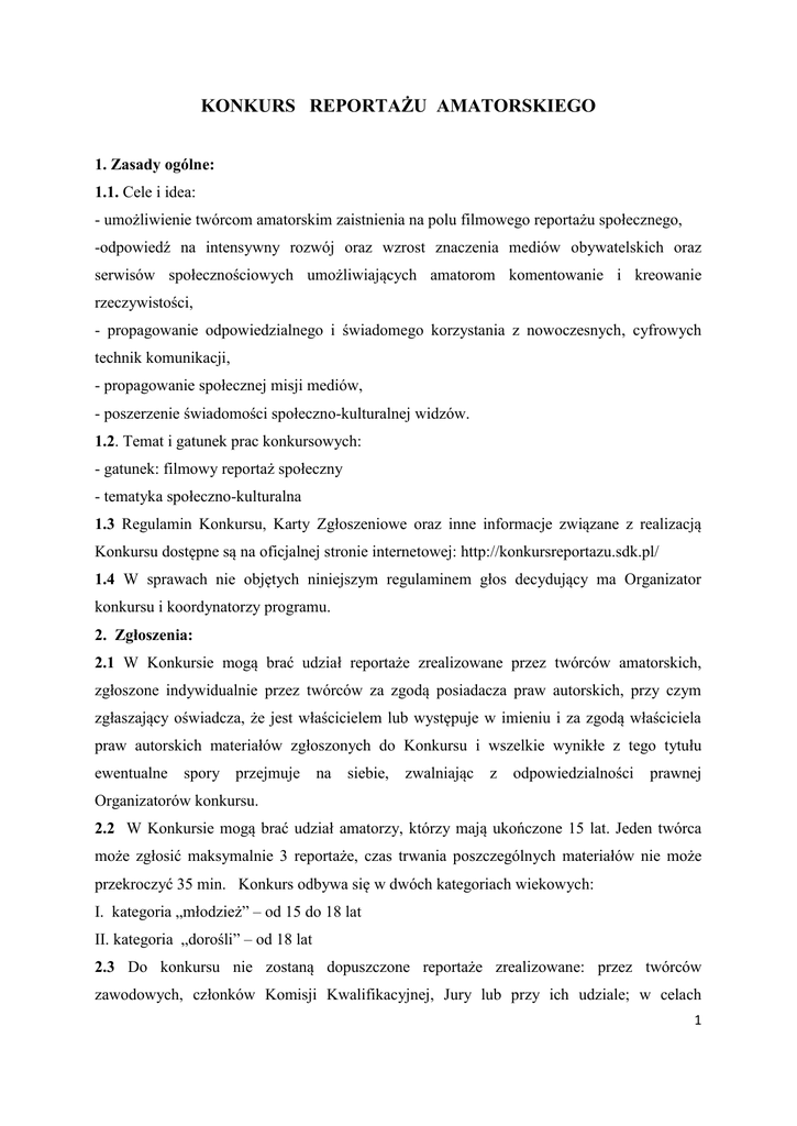 KONKURS REPORTAŻU AMATORSKIEGO 1. Zasady ogólne: 1.1. Cele i idea: - umożliwienie twórcom amatorskim zaistnienia na polu filmowego reportażu społecznego, -odpowiedź na intensywny rozwój oraz wzrost znaczenia mediów obywatelskich oraz serwisów społecznościowych umożliwiających amatorom komentowanie i kreowanie rzeczywistości, - propagowanie odpowiedzialnego i świadomego korzystania z nowoczesnych, cyfrowych technik komunikacji, - propagowanie społecznej misji mediów, - poszerzenie świadomości społeczno-kulturalnej widzów. 1.2. Temat i gatunek prac konkursowych: - gatunek: filmowy reportaż społeczny - tematyka społeczno-kulturalna 1.3 Regulamin Konkursu, Karty Zgłoszeniowe oraz inne informacje związane z realizacją Konkursu dostępne są na oficjalnej stronie internetowej: http://konkursreportazu.sdk.pl/ 1.4 W sprawach nie objętych niniejszym regulaminem głos decydujący ma Organizator konkursu i koordynatorzy programu. 2. Zgłoszenia: 2.1 W Konkursie mogą brać udział reportaże zrealizowane przez twórców amatorskich, zgłoszone indywidualnie przez twórców za zgodą posiadacza praw autorskich, przy czym zgłaszający oświadcza, że jest właścicielem lub występuje w imieniu i za zgodą właściciela praw autorskich materiałów zgłoszonych do Konkursu i wszelkie wynikłe z tego tytułu ewentualne spory przejmuje na siebie, zwalniając z odpowiedzialności prawnej Organizatorów konkursu. 2.2 W Konkursie mogą brać udział amatorzy, którzy mają ukończone 15 lat. Jeden twórca może zgłosić maksymalnie 3 reportaże, czas trwania poszczególnych materiałów nie może przekroczyć 35 min. Konkurs odbywa się w dwóch kategoriach wiekowych: I. kategoria „młodzież” – od 15 do 18 lat II. kategoria „dorośli” – od 18 lat 2.3 Do konkursu nie zostaną dopuszczone reportaże zrealizowane: przez twórców zawodowych, członków Komisji Kwalifikacyjnej, Jury lub przy ich udziale; w celach 1 komercyjnych; publikowane wcześniej w mediach; które podlegały już ocenie Komisji Kwalifikacyjnej Konkursu. 2.4 Termin przyjmowania zgłoszeń: do 18.11.2012 zgłoszenia muszą fizycznie znaleźć się w siedzibie Staromiejskiego Domu Kultury. 2.5 Zgłoszenie reportażu jest równoznaczne z udzieleniem bezpłatnej licencji na jego prezentację w programie Konkursu Reportażu Amatorskiego w Staromiejskim Domu Kultury w Warszawie. Jednocześnie Zgłaszający wyraża zgodę na nieodpłatne i nieograniczone użycie wybranych fragmentów zgłoszonego materiału (o maksymalnej długości do 3 minut, jednakże nie więcej niż 15% całkowitego czasu trwania utworu) dla celów informacyjnych, promocyjnych i reklamowych, w audycjach telewizyjnych i radiowych, związanych z Konkursem oraz innych publikacjach drukowanych lub elektronicznych, w tym na stronie www.sdk.pl, www.facebook.com/StaromiejskiDomKultury na oficjalnej stronie Konkursu: www.konkursreportazu.sdk.pl oraz stronie Partnera Konkursu: www.instytutr.pl. 2.6 Podpisanie Karty Zgłoszenia stanowi zgodę uczestnika na gromadzenie, przetwarzanie i wykorzystywanie jego danych osobowych w związku z udziałem w konkursie, na zasadach określonych obowiązującymi przepisami prawa, a w szczególności ustawą z dnia 29.08.1977r. o Ochronie Danych Osobowych. 2.7 Organizator nie zwraca nadesłanych materiałów. Zgłoszone materiały po Konkursie trafiają do archiwum Staromiejskiego Domu Kultury. 2.8 Zgłoszenie reportażu powinno składać się z: - wypełnionej Karty Zgłoszeniowej odpowiedniej dla konkretnej kategorii wiekowej - kopii materiału na nośniku DVD lub CD umożliwiające odtworzenie na standardowym odtwarzaczu DVD lub komputerze wraz z fotosem z reportażu w formacie cyfrowym, rozdzielczość min. 300 DPI, 2.9 Zgłoszenie reportażu do Konkursu jest bezpłatne. 2.10 Zgłoszenie reportażu jest równoznaczne z akceptacją wszystkich postanowień niniejszego Regulaminu. Zgłoszenie należy przesłać na koszt zgłaszającego na adres do korespondencji: Staromiejski Dom Kultury Rynek Starego Miasta 2 00-272 Warszawa z dopiskiem: Zgłoszenie: KONKURS REPORTAŻU AMATORSKIEGO 2 Organizator nie bierze na siebie odpowiedzialności za ewentualne zgubienie lub uszkodzenie materiału powstałe z przyczyn od niego niezależnych. 3. Harmonogram. 3.1 Zgłoszenia muszą być dostarczone (osobiście/pocztą) do 18.11.2012 do siedziby Staromiejskiego Domu Kultury. 3.2 Komisja Kwalifikacyjna dokona wyboru 10 najciekawszych prac, które znajdą się w ścisłym finale Konkursu. Werdykt Komisji jest niepodważalny. Lista finalistów będzie dostępna na stronie internetowej Konkursu 20.11.2012 od godz.17.00. 3.3 Organizator zastrzega sobie prawo do zwiększenia liczby finalistów. 3.4 Organizator zastrzega sobie prawo do niedopuszczenia zgłoszonego materiału do Konkursu bez podania przyczyny. 3.5 Oceną materiałów zajmie się jury w składzie: Piotr Morawski, Krzysztof Wierzbicki, Paulina Zając. Werdykt jury jest ostateczny. 3.6 Finał – pokaz nagrodzonych reportaży, oficjalna ceremonia wręczenia nagród i warsztat odbędą się w dniu 1.12.2012 w Staromiejskim Domu Kultury. 4. Nagrody. 4.1. Kategorie nagród I Nagroda 1 000 zł - Kategoria „młodzież” 1 000 zł - Kategoria „dorośli” - Wyróżnienie - Warsztat 4.2 Twórcy, których materiały zostały zakwalifikowane do ścisłego finału wezmą udział w 2 godzinnym warsztacie filmowym prowadzonym przez Krzysztofa Wierzbickiego i Piotra Morawskiego. 4.3 Materiały uhonorowane I Nagrodą oraz Wyróżnieniem zostaną zaprezentowane podczas „Wieczoru z nagrodzonymi” w Instytucie Reportażu w I kwartale roku 2013 – dokładny termin do uzgodnienia. Materiały te zostaną również pokazane podczas spotkania Dyskusyjnego Klubu Filmów Nieobecnych, Staromiejskiego Domu Kultury. 4.4 Wszyscy uczestnicy Konkursu otrzymają dyplomy. 4.5 Nagrody finansowe zostaną przekazane w gotówce, po potrąceniu należnego według prawa podatku. 3 4.6 Osoby 