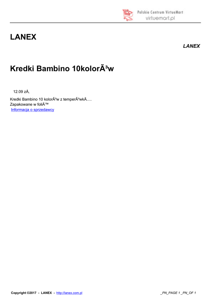 LANEX LANEX Kredki Bambino 10kolorów 12.09 zÅ‚ Kredki Bambino 10 kolorów z temperówkÄ…. Zapakowane w foliÄ™ Informacja o sprzedawcy Copyright ©2017 - LANEX - http://lanex.com.pl _PN_PAGE 1 _PN_OF 1