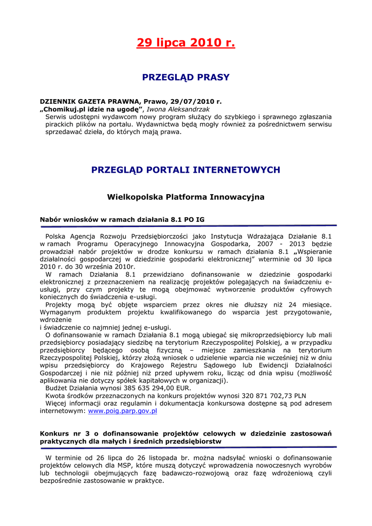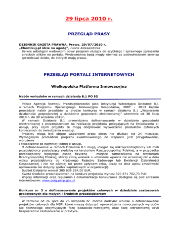 29 lipca 2010 r. PRZEGLĄD PRASY DZIENNIK GAZETA PRAWNA, Prawo, 29/07/2010 r. „Chomikuj.pl idzie na ugodę”, Iwona Aleksandrzak Serwis udostępni wydawcom nowy program służący do szybkiego i sprawnego zgłaszania pirackich plików na portalu. Wydawnictwa będą mogły również za pośrednictwem serwisu sprzedawać dzieła, do których mają prawa. PRZEGLĄD PORTALI INTERNETOWYCH Wielkopolska Platforma Innowacyjna Nabór wniosków w ramach działania 8.1 PO IG Polska Agencja Rozwoju Przedsiębiorczości jako Instytucja Wdrażająca Działanie 8.1 w ramach Programu Operacyjnego Innowacyjna Gospodarka, 2007 - 2013 będzie prowadział nabór projektów w drodze konkursu w ramach działania 8.1 „Wspieranie działalności gospodarczej w dziedzinie gospodarki elektronicznej” wterminie od 30 lipca 2010 r. do 30 września 2010r. W ramach Działania 8.1 przewidziano dofinansowanie w dziedzinie gospodarki elektronicznej z przeznaczeniem na realizację projektów polegających na świadczeniu eusługi, przy czym projekty te mogą obejmować wytworzenie produktów cyfrowych koniecznych do świadczenia e-usługi. Projekty mogą być objęte wsparciem przez okres nie dłuższy niż 24 miesiące. Wymaganym produktem projektu kwalifikowanego do wsparcia jest przygotowanie, wdrożenie i świadczenie co najmniej jednej e-usługi. O dofinansowanie w ramach Działania 8.1 mogą ubiegać się mikroprzedsiębiorcy lub mali przedsiębiorcy posiadający siedzibę na terytorium Rzeczypospolitej Polskiej, a w przypadku przedsiębiorcy będącego osobą fizyczną – miejsce zamieszkania na terytorium Rzeczypospolitej Polskiej, którzy złożą wniosek o udzielenie wparcia nie wcześniej niż w dniu wpisu przedsiębiorcy do Krajowego Rejestru Sądowego lub Ewidencji Działalności Gospodarczej i nie niż później niż przed upływem roku, licząc od dnia wpisu (możliwość aplikowania nie dotyczy spółek kapitałowych w organizacji). Budżet Działania wynosi 385 635 294,00 EUR. Kwota środków przeznaczonych na konkurs projektów wynosi 320 871 702,73 PLN Więcej informacji oraz regulamin i dokumentacja konkursowa dostępne są pod adresem internetowym: www.poig.parp.gov.pl Konkurs nr 3 o dofinansowanie projektów celowych w dziedzinie zastosowań praktycznych dla małych i średnich przedsiębiorstw W terminie od 26 lipca do 26 listopada br. można nadsyłać wnioski o dofinansowanie projektów celowych dla MSP, które muszą dotyczyć wprowadzenia nowoczesnych wyrobów lub technologii obejmujących fazę badawczo-rozwojową oraz fazę wdrożeniową czyli bezpośrednie zastosowanie w praktyce. Nabór wniosków przeprowadza Naczelna Organizacja Techniczna - Centrum Innowacji NOT, na podstawie umowy zawartej w dniu 22 kwietnia 2009 r. z Ministrem Nauki i Szkolnictwa Wyższego. Szczegółowe informacje dostępne są na stronie NOT-u. Nauka w Polsce PAP FNP wyłoniła laureatów programu "Ventures" Siedmiu młodych naukowców otrzymało stypendia naukowe w ramach 5. edycji programu "Vantures" Fundacji na rzecz Nauki Polskiej (FNP). Łącznie na prowadzenie badań laureaci otrzymają ponad milion złotych. W programie "Ventures" nagradzani są studenci, absolwenci i doktoranci z całej Polski, którzy prowadzą projekty naukowe mające zastosowanie w gospodarce. Jak informuje FNP, najwyższe dofinansowanie - ponad 219 tys. złotych - otrzymał Daniel Nidzworski z Międzyuczelnianego Wydziału Biotechnologii Uniwersytetu GdańskiegoGdańskiego Uniwersytetu Medycznego, który pracuje nad bioczujnikiem do detekcji wirusa grypy w materiale środowiskowym. Niewiele mniejszą kwotą - ponad 218 tys. złotych dofinansowano badania Grzegorz Gorczycy. Na Politechnice Gdańskiej wytworzy on nowe polimerowe materiały o aktywności antydrobnoustrojowej. Wśród laureatów znaleźli się również: Kajetan Dąbrowa z Instytutu Chemii Organicznej PAN, Łukasz Jaremko z Uniwersytetu Warszawskiego, Mariusz Jaremko z Instytutu Biochemii i Biofizyki PAN, Michał Lower z Uniwersytetu Warszawskiego i Zofia Radzikowska ze Szkoły Wyższej Psychologii Społecznej. Za otrzymane środki laureaci będą mogli m.in. poznawać molekularne podstawy choroby Alzheimera, przygotować nowe podejście do terapii i diagnostyki chorób mózgu czy udoskonalać bodźce do jednego z interfejsów mózg-komputer. Program "Ventures" ma podnieść atrakcyjność pracy naukowej w Polsce, zainteresować młodych uczonych pracą naukową, a także zwiększyć liczbę projektów, których wyniki mogą być wdrożone w działalności gospodarczej. Finansowanie dostępne jest dla wszystkich dziedzin nauki, bo największe znaczenie ma w tym przypadku przydatność danego projektu dla gospodarki. Siedmioro laureatów programu otrzyma imienne stypendium naukowe w wysokości 3 tys. zł miesięcznie (doktoranci) i 1500 zł miesięcznie (studenci) oraz granty badawcze na realizację wyróżnionych projektów w wysokości do 35 tys. zł rocznie. Młodzi badacze, którzy chcą wziąć udział w VI edycji programu powinni: wypełnić elektroniczny formularz wniosku, a następnie wydrukowany i uzupełniony o wymagane podpisy dostarczyć do biura FNP pod adres: ul. Grażyny 11, 02-548 Warszawa. Kolejne wnioski można zgłaszać między 30 sierpnia a 31 października br. Program jest współfinansowany przez Unię Europejską z Europejskiego Funduszu Rozwoju Regionalnego. Elektroniczny formularz wniosku i szczegółowe informacje na temat programu "Ventures" są dostępne na stronie: www.fnp.org.pl/programy/aktualne_programy_fnp/wspieranie_transferu_technologii/progr am_ventures Polskie laboratorium włączone w prace nad szczepionką, której jeszcze nie ma na świecie Katedra Wirusologii Molekularnej (KWM) Wydziału Biotechnologii Uniwersytetu Gdańskiego pracuje razem z laboratoriami europejskimi nad szczepionką przeciw wirusowi HCV, wywołującemu wirusowe zapalenie wątroby typu C, które prowadzi do marskości wątroby lub raka. Na razie szczepionki prze