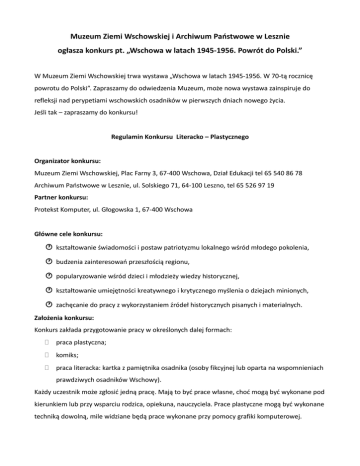 Muzeum Ziemi Wschowskiej i Archiwum Państwowe w Lesznie ogłasza konkurs pt. „Wschowa w latach 1945-1956. Powrót do Polski.” W Muzeum Ziemi Wschowskiej trwa wystawa „Wschowa w latach 1945-1956. W 70-tą rocznicę powrotu do Polski”. Zapraszamy do odwiedzenia Muzeum, może nowa wystawa zainspiruje do refleksji nad perypetiami wschowskich osadników w pierwszych dniach nowego życia. Jeśli tak – zapraszamy do konkursu! Regulamin Konkursu Literacko – Plastycznego Organizator konkursu: Muzeum Ziemi Wschowskiej, Plac Farny 3, 67-400 Wschowa, Dział Edukacji tel 65 540 86 78 Archiwum Państwowe w Lesznie, ul. Solskiego 71, 64-100 Leszno, tel 65 526 97 19 Partner konkursu: Protekst Komputer, ul. Głogowska 1, 67-400 Wschowa Główne cele konkursu: kształtowanie świadomości i postaw patriotyzmu lokalnego wśród młodego pokolenia, budzenia zainteresowań przeszłością regionu, popularyzowanie wśród dzieci i młodzieży wiedzy historycznej, kształtowanie umiejętności kreatywnego i krytycznego myślenia o dziejach minionych, zachęcanie do pracy z wykorzystaniem źródeł historycznych pisanych i materialnych. Założenia konkursu: Konkurs zakłada przygotowanie pracy w określonych dalej formach: praca plastyczna; komiks; praca literacka: kartka z pamiętnika osadnika (osoby fikcyjnej lub oparta na wspomnieniach prawdziwych osadników Wschowy). Każdy uczestnik może zgłosić jedną pracę. Mają to być prace własne, choć mogą być wykonane pod kierunkiem lub przy wsparciu rodzica, opiekuna, nauczyciela. Prace plastyczne mogą być wykonane techniką dowolną, mile widziane będą prace wykonane przy pomocy grafiki komputerowej. Uczestnicy konkursu: Konkurs skierowany jest do trzech grup wiekowych: dzieci przedszkolne i uczniowie szkół podstawowych; młodzież gimnazjalna i ponadgimnazjalna; dorośli. Terminarz konkursu: Prace konkursowe przyjmowane będą w Muzeum Ziemi Wschowskiej przy Placu Farnym 3 od 29 kwietnia 2015 do 31 maja 2015. Istnieje możliwość przesyłania prac mailem, na adres: [email protected] . W takim przypadku należy dołączyć skan wypełnionych załączników. Ogłoszenie wyników konkursu i terminu Gali Wręczenia Nagród nastąpi 9 czerwca 2015. Uczestnicy konkursu zostaną powiadomieni mailowo. Informacje pojawią się na stronie www.muzeumwschowa.pl i profilu muzeum na facebooku facebook.com/muzeumziemiwschowskiej. Sposób wyłaniania zwycięzców: Zwycięzców konkursu wyłoni Komisja Konkursowa. Prace oceniane będą oddzielnie dla każdej grupy wiekowej. Przy ocenie prac uwzględniane będzie przede wszystkim: związek z tematem, pomysłowość i oryginalność wykonania lub napisania pracy, staranność wykonania pracy, w przypadku prac literackich poprawność językowa. Decyzje Komisji są ostateczne i nie podlegają odwołaniom. Skład komisji konkursowej: Barbara Ratajewska – Archiwum Państwowe w Lesznie Marta Małkus – Muzeum Ziemi Wschowskiej Mariusz Ławrynowicz – Protekst Komputer Krzysztof Koziołek – pisarz Szymon Antoniewicz – Muzeum Ziemi Wschowskiej Magdalena Birut – Muzeum Ziemi Wschowskiej Nagrody: W każdej grupie wiekowej przewidziane są nagrody rzeczowe za trzy pierwsze miejsca. Każdy z Uczestników konkursu otrzyma pamiątkowy dyplom. Postanowienia końcowe: Prace złożone bez wypełnionych załączników nr 1 i nr 2 lub 3 nie będą oceniane. Uczestnicy konkursu ponoszą pełną odpowiedzialność za to, że przysługują im pełne i niczym nieograniczone prawa autorskie do dostarczonych prac konkursowych i że prace konkursowe (ich treść i forma) nie naruszają praw osób trzecich, zwłaszcza praw autorskich lub dóbr osobistych, a także, że przedmioty materialne, w których utrwalono prace konkursowe stanowią wyłącznie własność danego Uczestnika Konkursu. Wszyscy Uczestnicy Konkursu przenoszą autorskie prawa majątkowe na Organizatora konkursu nieodpłatnie. Przeniesienie praw autorskich na rzecz Muzeum Ziemi Wschowskiej polegać będzie na korzystaniu z pracy (w sposób nieograniczony czasowo i terytorialnie) w dowolnym celu, w zakresie wszystkich pól eksploatacji. Udział w konkursie jest równoznaczny z wyrażeniem zgody na zastosowanie się do niniejszego regulaminu, wyrażenie zgody na bezpłatną publikację i eksponowanie pracy, a także na wykorzystanie, utrwalanie i powielanie zdjęć i filmów z wizerunkiem Uczestnika konkursu za pośrednictwem dowolnego medium w celu promocji Konkursu Literacko – Plastycznego Muzeum Ziemi Wschowskiej pt. „Wschowa w latach 1945-1956. Powrót do Polski.” zgodnie z obowiązującym prawem, wliczając w to w szczególności wystawy w miejscach publicznych, zamieszczanie zdjęć i filmów na stronie internetowej www.muzeumwschowa.pl i profilu muzeum na facebooku facebook.com/muzeumziemiwschowskiej, oraz publikacje w czasopismach i na informacyjnych portalach. Dane osobowe wszystkich Uczestników pozyskane do celów konkursu nie będą udostępnione osobom trzecim. Kontakt z Organizatorem: Muzeum Ziemi Wschowskiej Magdalena Birut Specjalista do spraw edukacji tel. 65 540 86 78 ; 697 592 297 mail. [email protected] Informacje o konkursie dostępne są na stronie MZW: www.muzeumwschowa.pl