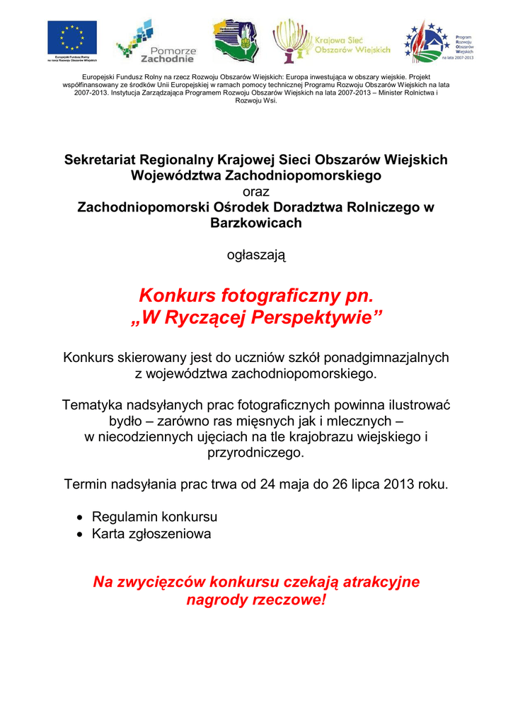 Europejski Fundusz Rolny na rzecz Rozwoju Obszarów Wiejskich: Europa inwestuj ca w obszary wiejskie. Projekt wspó finansowany ze rodków Unii Europejskiej w ramach pomocy technicznej Programu Rozwoju Obszarów Wiejskich na lata 2007-2013. Instytucja Zarz dzaj ca Programem Rozwoju Obszarów Wiejskich na lata 2007-2013 – Minister Rolnictwa i Rozwoju Wsi. Sekretariat Regionalny Krajowej Sieci Obszarów Wiejskich Województwa Zachodniopomorskiego oraz Zachodniopomorski O rodek Doradztwa Rolniczego w Barzkowicach og aszaj Konkurs fotograficzny pn. „W Rycz cej Perspektywie” Konkurs skierowany jest do uczniów szkó ponadgimnazjalnych z województwa zachodniopomorskiego. Tematyka nadsy anych prac fotograficznych powinna ilustrowa byd o – zarówno ras mi snych jak i mlecznych – w niecodziennych uj ciach na tle krajobrazu wiejskiego i przyrodniczego. Termin nadsy ania prac trwa od 24 maja do 26 lipca 2013 roku. Regulamin konkursu Karta zg oszeniowa Na zwyci zców konkursu czekaj atrakcyjne nagrody rzeczowe!