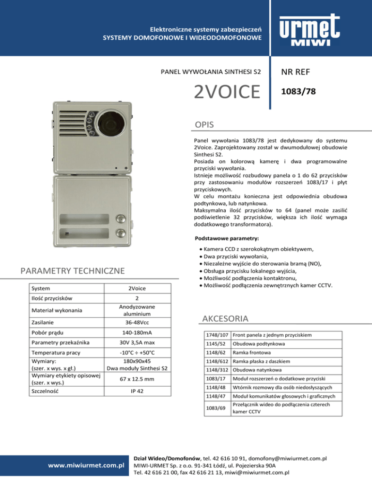 Elektroniczne systemy zabezpieczeń SYSTEMY DOMOFONOWE I WIDEODOMOFONOWE PANEL WYWOŁANIA SINTHESI S2 2VOICE NR REF 1083/78 OPIS Panel wywołania 1083/78 jest dedykowany do systemu 2Voice. Zaprojektowany został w dwumodułowej obudowie Sinthesi S2. Posiada on kolorową kamerę i dwa programowalne przyciski wywołania. Istnieje możliwość rozbudowy panela o 1 do 62 przycisków przy zastosowaniu modułów rozszerzeń 1083/17 i płyt przyciskowych. W celu montażu konieczna jest odpowiednia obudowa podtynkowa, lub natynkowa. Maksymalna ilość przycisków to 64 (panel może zasilić podświetlenie 32 przycisków, większa ich ilość wymaga dodatkowego transformatora). Podstawowe parametry: PARAMETRY TECHNICZNE System Ilość przycisków Materiał wykonania Zasilanie Pobór prądu 2Voice 2 Anodyzowane aluminium 36-48Vcc 140-180mA Kamera CCD z szerokokątnym obiektywem, Dwa przyciski wywołania, Niezależne wyjście do sterowania bramą (NO), Obsługa przycisku lokalnego wyjścia, Możliwość podłączenia kontaktronu, Możliwość podłączenia zewnętrznych kamer CCTV. AKCESORIA 1748/107 Front panela z jednym przyciskiem Parametry przekaźnika 30V 3,5A max 1145/52 Obudowa podtynkowa Temperatura pracy -10°C ÷ +50°C 1148/62 Ramka frontowa Wymiary: 180x90x45 (szer. x wys. x gł.) Dwa moduły Sinthesi S2 Wymiary etykiety opisowej 67 x 12.5 mm (szer. x wys.) Szczelność IP 42 www.miwiurmet.com.pl 1148/612 Ramka płaska z daszkiem 1148/312 Obudowa natynkowa 1083/17 Moduł rozszerzeń o dodatkowe przyciski 1148/48 Wtórnik rozmowy dla osób niedosłyszących 1148/47 Moduł komunikatów głosowych i graficznych 1083/69 Przełącznik wideo do podłączenia czterech kamer CCTV Dział Wideo/Domofonów, tel. 42 616 10 91, [email protected] MIWI-URMET Sp. z o.o. 91-341 Łódź, ul. Pojezierska 90A Tel. 42 616 21 00, fax 42 616 21 13, [email protected]
