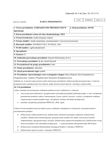 Załącznik Nr 5 do Zarz. Nr 33/11/12 Z1-PU7 (pieczęć wydziału) WYDANIE N1 Strona 1 z 4 KARTA PRZEDMIOTU 1. Nazwa przedmiotu: ZARZĄDZANIE PROJEKTAMI W 2. Kod przedmiotu: ZPwB BIZNESIE 3. Karta przedmiotu ważna od roku akademickiego: 2012 4. Forma kształcenia: studia drugiego stopnia 5. Forma studiów: studia stacjonarne, niestacjonarne ( wieczorowe/zaoczne) 6. Kierunek studiów: INFORMATYKA, WYDZIAŁ AEII 7. Profil studiów: ogólnoakademicki 8. Specjalność: 9. Semestr: 2 10. Jednostka prowadząca przedmiot: Instytut Informatyki, RAU2 11. Prowadzący przedmiot: dr inż. Jacek Frączek 12. Przynależność do grupy przedmiotów: inne 13. Status przedmiotu: obieralny 14. Język prowadzenia zajęć: polski 15. Przedmioty wprowadzające oraz wymagania wstępne: Bazy Danych, Sieci komputerowe, Programowanie, Analiza i Projektowanie Systemów Komputerowych. Zakłada się, że przed rozpoczęciem nauki niniejszego przedmiotu student posiada przygotowanie w zakresie programowania, projektowania baz danych, logiki przetwarzania danych i interfejs u użytkownika. 16. Cel przedmiotu Celem wykładu jest przekazanie studentom podstawowych wiadomości w zakresie: szacowania pracochłonności, przygotowania i prowadzenia projektu informatycznego, w tym: zarządzanie parametrami projektu (zakres, harmonogram, koszty, jakość, korzyści, ryzyko), zarządzanie strukturą organizacyjną zespołu projektowego, zarządzanie zmianą, określanie postępu prac. metodyk zarządzania projektami PRINCE2, xPM, Agile Celem ćwiczeń projektowych jest nabycie przez studentów umiejętności związanych z przygotowaniem i prowadzeniem projektu: definiowania zadań projektowych, definiowania zależności pomiędzy zadaniami, definiowania zasobów, definiowania harmonogramu, przypisywania zasobów do zadań, szacowania kosztów (implementacji, oprogramowania, licencji), definiowania ograniczeń projektowych, definiowania wersji bazowych planów oraz określania postępu prac – z wykorzystaniem oprogramowania MS Project definiowania formalnej Dokumentacji Inicjującej Projekt w metodyce PRINCE2 definiowania rejestru ryzyka w metodyce PRINCE2 17. Efekty kształcenia: Nr W1 W2 W3 W4 W5 W6 W7 U1 U2 U3 U4 U5 U6 K1 K2 K3 K4 K5 Opis efektu kształcenia Ma wiedzę z zakresu zarządzania projektem Zna etapy procesu realizacji projektu informatycznego Zna metody szacowania pracochłonności realizacji projektu Zna metody harmonogramowania zadań Zna metodykę zarządzania projektem PRINCE2 Zna metodykę zarządzania projektem xPM Zna metodykę zarządzania projektem Agile Potrafi oszacować pracochłonność projektu Potrafi oszacować koszt projektu (wykonania, oprogramowania, sprzętu) Potrafi przygotować harmonogram projektu Potrafi rejestrować postęp prac projektowych Potrafi pracować z oprogramowaniem MS Project Potrafi przygotować dokumenty projektowe PRINCE2 (m.in. Dokument Inicjujący Projekt, rejestry projektowe, inne) Ma świadomość wagi i rozumie potrzebę procesu zarządzania projektem Zna przykłady i rozumie przyczyny i konsekwencje źle prowadzonych projektów Rozumie potrzebę i zasady współpracy w projekcie pomiędzy zleceniodawcą i wykonawcą Rozumie potrzebę i zasady wewnętrznej współpracy w zespole projektowym Ma doświadczenia związane z komunikacją z dostawcami oprogramowania, sprzętu i usług IT Metoda sprawdzenia Forma Odniesienie do efektów efektu kształcenia prowadzenia zajęć dla kierunku studiów K_W04, K_W18 EP, EU WM EP, EU, RP WM K_W04, K_W18 EP, EU, RP WM K_W04, K_W18 EP, EU, RP WM K_W04, K_W18 EP, EU, RP WM K_W04, K_W18 EP, EU WM K_W04, K_W18 EP, EU WM K_W04, K_W18 EP, EU, RP P K_U17 EP, EU, RP P K_U17 EP, EU, RP P K_U17 EP, EU, RP P K_U17 EP, EU, RP P K_U17 EP, EU, RP P K_U17 EP, EU WM K_K04 EP, EU WM K_K04 EP, EU WM K_K03 EP, EU WM K_K03 RP P K_K03 18. Formy zajęć dydaktycznych i ich wymiar (liczba godzin) 30W. 0Ćw. 0L. 30P. 0Sem. 19. Treści kształcenia: Wykład: Przegląd metodyk zarządzania projektami: PMI PMBoK, Prince2, SWEBoK, Agile/Scrum, xPM Analiza wymagań, oszacowanie czasochłonności i wycena projektu. Tworzenie harmonogramu projektu – MS Project Metodyka zarządzania projektem Prince2 Zasady: Ciągła zasadność biznesowa, Korzystanie z doświadczeń, Zdefiniowane role i obowiązki, Zarządzanie etapowe, Zarządzanie przez wyjątki, Zorientowanie na produkty, Dostosowanie metodyki do warunków projektu Tematy: Uzasadnienie biznesowe, Struktura organizacyjna, Jakość, Planowanie, Zarządzanie ryzykiem, Zarządzanie Zmianą, Postęp prac Procesy: Przygotowanie Projektu, Zarządzanie Strategiczne Projektem, Inicjowanie Projektu, Sterowanie Etapem, Zarządzanie Zakresem Etapu, Zarządzanie Wytwarzaniem Produktu, Zamykanie Projektu Metodyki zarządzania projektem PMI PMBoK, Agile (Scrum), xPM (+eXtreme Programming). Projekt: W ramach realizowanego projektu przygotowana jest oferta na realizację systemu informatycznego opisanego Specyfikacją Istotnych Warunków Zamówienia rzeczywistego projektu. Dla przygotowanej oferty jest opracowana dokumentacja projektowa zgodna z metodyką Prince2: 1. Zapoznanie się z wymaganiami projektu na podstawie Specyfikacji Istotnych Warunków Zamówienia rzeczywistego projektu 2. Szacowanie czasochłonności i wycena projektu 3. Przygotowanie dokumentacji projektowej Prince2 4. Przygotowanie harmonogramu projektu (MS Project) 5. Zarządzanie ryzykiem i zmianami w projekcie Wynikiem projektu będą: Oferta na wykonanie systemu informatycznego Dokumentacja projektowa: struktura produktu, kosztorys, harmonogram prac, Dokument Inicjujący Projekt, rejestr ryzyka 20. Egzamin: tak 21. Literatura podstawowa: Managing Successful Projects with PRINCE2™, OGC, London, The Stationary Office, 2009. Wilczewski S.: MS Project 2010 i MS Project Server 2010. Efektywne zarządzanie projektem i portfelem projektów. Helion, 2011. 22. Literatura uzupełniająca: A Guide to the Project Management Body of Knowledge (PMBOK® Guide). 2