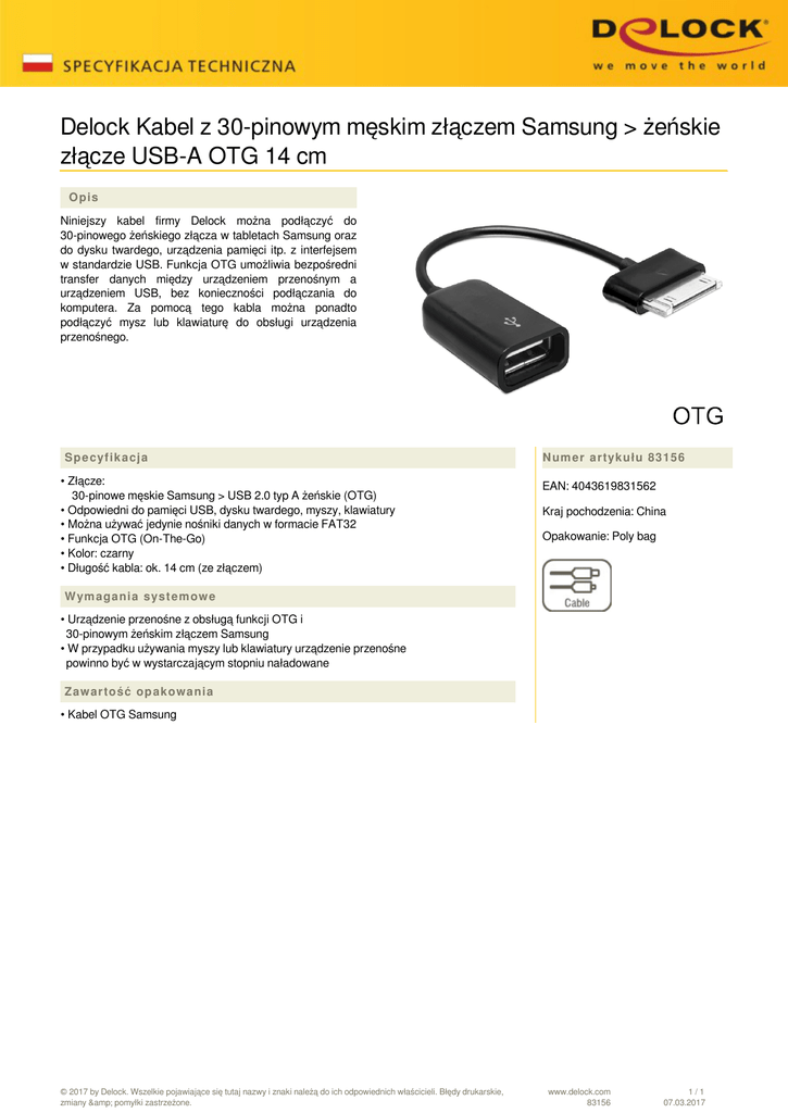 Delock Kabel z 30-pinowym męskim złączem Samsung > żeńskie złącze USB-A OTG 14 cm Opis Niniejszy kabel firmy Delock można podłączyć do 30-pinowego żeńskiego złącza w tabletach Samsung oraz do dysku twardego, urządzenia pamięci itp. z interfejsem w standardzie USB. Funkcja OTG umożliwia bezpośredni transfer danych między urządzeniem przenośnym a urządzeniem USB, bez konieczności podłączania do komputera. Za pomocą tego kabla można ponadto podłączyć mysz lub klawiaturę do obsługi urządzenia przenośnego. Specyfikacja • Złącze: 30-pinowe męskie Samsung > USB 2.0 typ A żeńskie (OTG) • Odpowiedni do pamięci USB, dysku twardego, myszy, klawiatury • Można używać jedynie nośniki danych w formacie FAT32 • Funkcja OTG (On-The-Go) • Kolor: czarny • Długość kabla: ok. 14 cm (ze złączem) Numer artykułu 83156 EAN: 4043619831562 Kraj pochodzenia: China Opakowanie: Poly bag Wymagania systemowe • Urządzenie przenośne z obsługą funkcji OTG i 30-pinowym żeńskim złączem Samsung • W przypadku używania myszy lub klawiatury urządzenie przenośne powinno być w wystarczającym stopniu naładowane Zawartość opakowania • Kabel OTG Samsung © 2017 by Delock. Wszelkie pojawiające się tutaj nazwy i znaki należą do ich odpowiednich właścicieli. Błędy drukarskie, zmiany & pomyłki zastrzeżone. Powered by TCPDF (www.tcpdf.org) www.delock.com 83156 1/1 07.03.2017