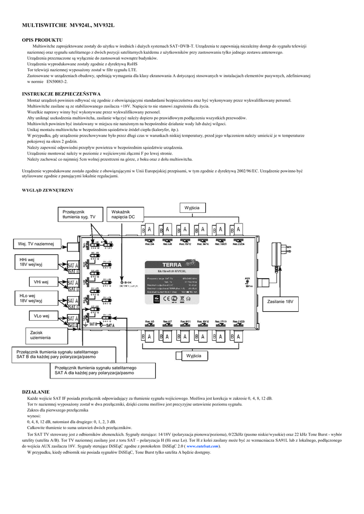 MULTISWITCHE MV924L, MV932L OPIS PRODUKTU Multiswitche zaprojektowane zostały do użytku w średnich i dużych systemach SAT+DVB-T. Urządzenia te zapewniają niezależny dostęp do sygnału telewizji naziemnej oraz sygnału satelitarnego z dwóch pozycji satelitarnych każdemu z użytkowników przy zastosowaniu tylko jednego zestawu antenowego. Urządzenia przeznaczone są wyłącznie do zastosowań wewnątrz budynków. Urządzenia wyprodukowane zostały zgodnie z dyrektywą RoHS Tor telewizji naziemnej wyposażony został w filtr sygnału LTE. Zastosowane w urządzeniach obudowy, spełniają wymagania dla klasy ekranowania A dotyczącej stosowanych w instalacjach elementów pasywnych, zdefiniowanej w normie EN50083-2. INSTRUKCJE BEZPIECZEŃSTWA Montaż urządzeń powinien odbywać się zgodnie z obowiązującymi standardami bezpieczeństwa oraz być wykonywany przez wykwalifikowany personel. Multiswitche zasilane są ze stabilizowanego zasilacza +18V. Napięcie to nie stanowi zagrożenia dla życia. Wszelkie naprawy winny być wykonywane przez wykwalifikowany personel. Aby uniknąć uszkodzenia multiswitcha, zasilanie włączyć należy dopiero po prawidłowym podłączeniu wszystkich przewodów. Multiswitch powinien być instalowany w miejscu nie narażonym na bezpośrednie działanie wody lub dużej wilgoci. Unikaj montażu multiswitcha w bezpośrednim sąsiedztwie źródeł ciepła (kaloryfer, itp.). W przypadku, gdy urządzenie przechowywane było przez długi czas w warunkach niskiej temperatury, przed jego włączeniem należy umieścić je w temperaturze pokojowej na okres 2 godzin. Należy zapewnić odpowiedni przepływ powietrza w bezpośrednim sąsiedztwie urządzenia. Urządzenie montować należy w poziomie z wejściowymi złączmi F po lewej stronie. Należy zachować co najmniej 5cm wolnej przestrzeni na górze, z boku oraz z dołu multiswitcha. Urządzenie wyprodukowane zostało zgodnie z obowiązującymi w Unii Europejskiej przepisami, w tym zgodnie z dyrektywą 2002/96/EC. Urządzenie powinno być utylizowane zgodnie z panującymi lokalnie regulacjami. WYGLĄD ZEWNĘTRZNY Przełącznik tłumienia syg. TV Wskaźnik napięcia DC Wyjścia Wej. TV naziemnej HHi wej 18V wej/wyj VHi wej HLo wej 18V wej/wyj Zasilanie 18V VLo wej Zacisk uziemienia Przełącznik tłumienia sygnału satelitarnego SAT B dla każdej pary polaryzacja/pasmo Wyjścia Przełącznik tłumienia sygnału satelitarnego SAT A dla każdej pary polaryzacja/pasmo DZIAŁANIE Każde wejście SAT IF posiada przełącznik odpowiadający za tłumienie sygnału wejściowego. Możliwa jest korekcja w zakresie 0, 4, 8, 12 dB. Tor tv naziemnej wyposażony został w dwa przełączniki, dzięki czemu możliwe jest precyzyjne ustawienie poziomu sygnału. Zakres dla pierwszego przełącznika wynosi: 0, 4, 8, 12 dB, natomiast dla drugiego: 0, 1, 2, 3 dB. Całkowite tłumienie to suma ustawień dwóch przełączników. Tor SAT TV sterowany jest z odbiorników abonenckich. Sygnały sterujące: 14/18V (polaryzacja pionowa/pozioma), 0/22kHz (pasmo niskie/wysokie) oraz 22 kHz Tone Burst - wybór satelity (satelita A/B). Tor TV naziemnej zasilany jest z toru SAT – polaryzacja H (Hi oraz Lo). Tor H z kolei zasilany może być ze wzmacniacza SA91L lub z lokalnego, podłączonego do wejścia AUX zasilacza 18V. Sygnały sterujące DiSEqC zgodne z protokołem DiSEqC 2.0 ( www.eutelsat.com). W przypadku, kiedy odbiornik nie posiada sygnałów DiSEqC, Tone Burst tylko satelita A będzie dostępny. SPECYFIKACJA TECHNICZNA Nazwa Kod MV-924L MV-932L R70874 R70882 Ilość wejść 9 9 Ilość wyjść 24 32 Pasmo pracy [MHz] SAT 950 - 2400 DVB-T/Radio 47 - 790 SAT Wmocnienie (prekorekcja ch-ki tłumienia przewodu) [dB] DVB-T/Radio wyj. 1-16 2...7 wyj. 17-32 1...5 wyj.1-8 4...7 wyj. 9-16 3...5 wyj. 17-24 2...3 wyj. 25-32 SAT - 1...1 12, krok 4dB Regulacja wzmocnienia [dB] DVB-T/Radio 15, krok 1dB Max. poziom sygnału SAT (IMD3=35dB)* [dBμV] 93 wyj. 1-8 85 wyj. 9-16 83 wyj. 17-24 81 Max. poziom sygnału TV naziemnej (IMD3=60dB)* [dBμV] wyj. 25-32 - Separacja wejść SAT [dB] Separacja wyjść [dB] 79 > 30 pasmo SAT > 30 pasmo DVB-T > 30 Pobór prądu z odbiornika [mA] < 60 Maksymalny pobór prądu z linii H oraz zewnętrznego źródła zasilania 12 V ... 18 V < 160 mA przy 18 V Przejście DC przez złącze "AUX18 V" 18 V 1 A max. Sygnały sterujące 14/18 V, 0/22 kHz, tone burst lub DiSEqC 1.0, DiSEqC 2.0 lub kompatybilne wersje Zakres temperatur pracy [ºC] Wymiary [mm] Masa [kg] -20...+50 227x135x30 267x135x50 1,42 1,86