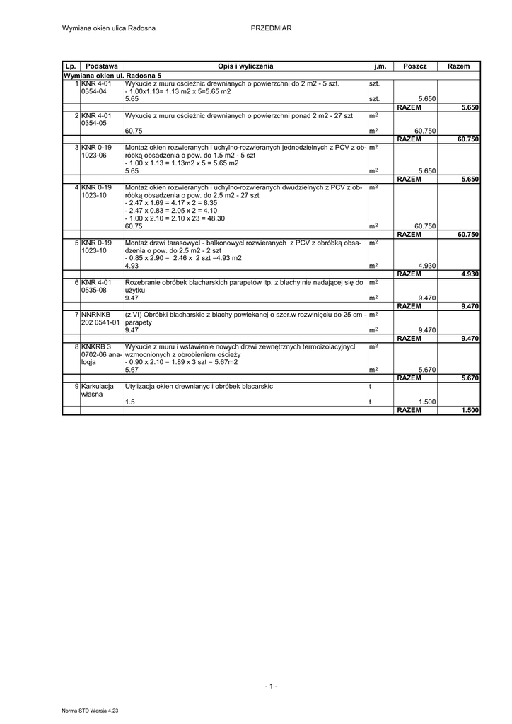 Wymiana okien ulica Radosna PRZEDMIAR Lp. Podstawa Opis i wyliczenia Wymiana okien ul. Radosna 5 1 KNR 4-01 Wykucie z muru ościeŜnic drewnianych o powierzchni do 2 m2 - 5 szt. 0354-04 - 1.00x1.13= 1.13 m2 x 5=5.65 m2 5.65 2 KNR 4-01 0354-05 3 KNR 0-19 1023-06 4 KNR 0-19 1023-10 5 KNR 0-19 1023-10 6 KNR 4-01 0535-08 j.m. szt. m2 60.75 m2 MontaŜ okien rozwieranych i uchylno-rozwieranych jednodzielnych z PCV z ob- m2 róbką obsadzenia o pow. do 1.5 m2 - 5 szt - 1.00 x 1.13 = 1.13m2 x 5 = 5.65 m2 5.65 m2 MontaŜ okien rozwieranych i uchylno-rozwieranych dwudzielnych z PCV z ob- m2 róbką obsadzenia o pow. do 2.5 m2 - 27 szt - 2.47 x 1.69 = 4.17 x 2 = 8.35 - 2.47 x 0.83 = 2.05 x 2 = 4.10 - 1.00 x 2.10 = 2.10 x 23 = 48.30 60.75 m2 m2 7 NNRNKB (z.VI) Obróbki blacharskie z blachy powlekanej o szer.w rozwinięciu do 25 cm - m2 202 0541-01 parapety 9.47 m2 8 KNKRB 3 Wykucie z muru i wstawienie nowych drzwi zewnętrznych termoizolacyjnycl 0702-06 ana- wzmocnionych z obrobieniem ościeŜy loqja - 0.90 x 2.10 = 1.89 x 3 szt = 5.67m2 5.67 m2 9 Karkulacja własna Utylizacja okien drewnianyc i obróbek blacarskic t 1.5 t Norma STD Wersja 4.23 5.650 RAZEM 5.650 60.750 RAZEM 60.750 5.650 RAZEM 5.650 60.750 RAZEM 60.750 4.930 RAZEM 4.930 9.470 RAZEM 9.470 9.470 RAZEM 9.470 5.670 RAZEM 5.670 1.500 RAZEM 1.500 m2 Rozebranie obróbek blacharskich parapetów itp. z blachy nie nadającej się do m2 uŜytku 9.47 m2 -1- Razem szt. Wykucie z muru ościeŜnic drewnianych o powierzchni ponad 2 m2 - 27 szt MontaŜ drzwi tarasowycI - balkonowycl rozwieranych z PCV z obróbką obsadzenia o pow. do 2.5 m2 - 2 szt - 0.85 x 2.90 = 2.46 x 2 szt =4.93 m2 4.93 Poszcz m2 Lp. Podstawa wyceny Opis 1 2 3 Wymiana okien ul. Radosna 5 1 KNR 4-01 0354- Wykucie z muru ościeŜnic drewnianych o powierzchni do 2 m2 - 5 szt. 04 - 1.00x1.13= 1.13 m2 x 5=5.65 m2 2 KNR 4-01 0354- Wykucie z muru ościeŜnic drewnianych o powierzchni ponad 2 m2 - 27 szt 05 3 KNR 0-19 1023- MontaŜ okien rozwieranych i uchylno-rozwieranych jednodzielnych z PCV z obróbką obsadzenia o pow. do 1.5 06 m2 - 5 szt - 1.00 x 1.13 = 1.13m2 x 5 = 5.65 m2 4 KNR 0-19 1023- MontaŜ okien rozwieranych i uchylno-rozwieranych dwudzielnych z PCV z obróbką obsadzenia o pow. do 2.5 10 m2 - 27 szt - 2.47 x 1.69 = 4.17 x 2 = 8.35 - 2.47 x 0.83 = 2.05 x 2 = 4.10 - 1.00 x 2.10 = 2.10 x 23 = 48.30 5 KNR 0-19 1023- MontaŜ drzwi tarasowycI - balkonowycl rozwieranych z PCV z obróbką obsadzenia o pow. do 2.5 m2 - 2 szt 10 - 0.85 x 2.90 = 2.46 x 2 szt =4.93 m2 6 KNR 4-01 0535- Rozebranie obróbek blacharskich parapetów itp. z blachy nie nadającej się do uŜytku 08 7 NNRNKB 202 (z.VI) Obróbki blacharskie z blachy powlekanej o szer.w rozwinięciu do 25 cm - parapety 0541-01 8 KNKRB 3 0702- Wykucie z muru i wstawienie nowych drzwi zewnętrznych termoizolacyjnycl wzmocnionych z obrobieniem 06 analoqja ościeŜy - 0.90 x 2.10 = 1.89 x 3 szt = 5.67m2 9 Karkulacja Utylizacja okien drewnianyc i obróbek blacarskic własna Wartość kosztorysowa robót bez podatku VAT Podatek VAT Ogółem wartość kosztorysowa robót Słownie: -2- Norma STD Wersja 4.23 Jedn. miary Ilość Cena zł 4 5 6 szt. 5.65 m2 60.75 m2 5.65 m2 60.75 m2 4.93 m2 9.47 m2 9.47 m2 5.67 t 1.5 Wartość zł (5 x 6) 7