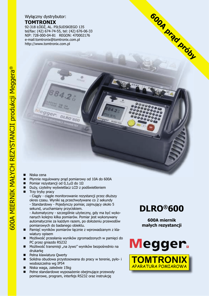 TOMTRONIX 600A MIERNIK MAŁYCH REZYSTANCJI produkcji Meggera® Niska cena Płynnie regulowany prąd pomiarowy od 10A do 600A Pomiar rezystancji od 0,1µΩ do 1Ω Duży, czytelny wyświetlacz LCD z podświetleniem Trzy tryby pracy - Ciągły - ciągłe monitorowanie rezystancji przez dłuższy okres czasu. Wyniki są przechwytywane co 2 sekundy - Standardowy - Pojedynczy pomiar, zajmujący około 5 sekund, uruchamiany przyciskiem. - Automatyczny - szczególnie użyteczny, gdy ma być wykonanych kolejno kilka pomiarów. Pomiar jest wykonywany automatycznie za każdym razem, po dołożeniu przewodów pomiarowych do badanego obiektu. Pamięć wyników pomiarów łącznie z wprowadzanym z klawiatury opisem Możliwość przesłania wyników zgromadzonych w pamięci do PC przez gniazdo RS232 Możliwość transmisji „na żywo” wyników bezpośrednio na drukarkę Pełna klawiatura Qwerty Solidna obudowa przystosowana do pracy w terenie, pyło- i wodoszczelna wg IP54 Niska waga, zaledwie 15kg Pełne standardowe wyposażenie obejmujące przewody pomiarowe, program, interfejs RS232 oraz instrukcję y ób pr ąd pr 92-318 ŁÓDŹ, AL. PIŁSUDSKIEGO 135 tel/fax: (42) 674-74-55, tel: (42) 676-06-33 NIP: 728-000-04-81 REGON: 470002176 e-mail:[email protected] http://www.tomtronix.com.pl 0A 60 Wyłączny dystrybutor: DLRO®600 600A miernik małych rezystancji TOMTRONIX APARATURA POMIAROWA Megger® DLRO®600 600A miernik małych rezystancji Najważniejsza cecha prąd do 600A DLRO600 pozwala na wykonywanie pomiarów z maksymalnym prądem 600A. Przy wykorzystaniu będących na wyposażeniu przewodów pomiarowych, prąd 600A jest osiągalny dla mierzonych rezystancji do 3mΩ. Przyrząd DLRO600 umożliwia programowanie prądu próby w zakresie od 10A do 600A. Ze względu na dużą moc prądu wyjściowego, mogącą uszkodzić niektóre badane obiekty, programuje się dodatkowy parametr tzw. prąd graniczny, który ogranicza możliwość przypadkowego ustawienia zbyt dużego prądu próby. Trzy tryby pracy DLRO600 może pracować w jednym z trzech trybów pomiarów. - Tryb standardowy – po podłączeniu przewodów i naciśnięciu przycisku TEST wykonywany jest jeden pomiar - Tryb ciągły – naciśnięci przycisku TEST powoduje rozpoczęcie wykonywania powtarzających się co 2 sekundy pomiarów. - Tryb automatyczny – na stałe są podłączone tylko przewody prądowe. Każde dołożenie do badanego obiektu przewodów napięciowych inicjuje jeden nowy pomiar. Technika czteroprzewodowa DLRO600 przy pomiarze rezystancji wykorzystuje technikę czteroprzewodową. Dzięki temu wartość rezystancji przewodów nie wpływu na wynik i nie jest konieczne ich kalibrowanie. Umożliwia to również przedłużanie przewodów pomiarowych bez wpływu na wynik pomiaru. Jedynym wymogiem jest zachowanie małej rezystancji przewodów prądowych, aby ich rezystancja nie ograniczała maksymalnego prądu próby. Przewody napięciowe powinny jedynie mieć wystarczającą wytrzymałość mechaniczną. Sekwencja pomiaru Niezależnie od trybu pracy DLRO600 kontroluje poprawność obwodu pomiarowego. Każdy pomiar rozpoczyna się sprawdzeniem ciągłości obwodu napięciowego. W tym celu w pętli napięciowej jest wymuszany przepływ prądu 100µA o częstotliwości 10kHz. Po potwierdzeniu ciągłości pętli napięciowej następuje sprawdzenie ciągłości pętli prądowej. Przepływ prądu powyżej 2A świadczy o ciągłości pętli prądowej. Kolejnym kontrolowanym parametrem jest obecność zewnętrznego napięcia na badanym obiekcie. Wykrycie, w dowolnym momencie pomiaru, obecności napięcia o wartości 10Vpp ac lub dc powoduje wyświetlenie komunikatu i wstrzymanie pomiaru. Kontrola prądu rozładowania po zakończeniu pomiaru, informuje użytkownika o wykryciu obiektu o charakterze indukcyjnym, zapobiega to rozłączeniu obwodu prądowego przed zakończeniem rozładowania. Komunikat o przepływie prądu rozładowania jest pokazywany dopóki prąd ma wartość powyżej 10mA. Ergonomiczna obsługa DLRO600 posiada duży, czytelny wyświetlacz ciekłokrystaliczny, manipulator dwuosiowy, pełną klawiaturę QWERTY oraz przycisk TEST. Wygodną obsługę przyrządu zapewnia menu wyboru widoczne na ekranie oraz manipulator pozwalający na sterowanie kursorem. Obsługa sprowadza się do wyboru parametrów pomiaru oraz obserwacji komunikatów pojawiających się na ekranie. Pełna klawiatura umożliwia komfortowe wprowadzanie wartości nastaw przyrządu albo treści notatek zapisywanych łącznie z wynikiem. Wbudowany zegar czasu rzeczywistego automatycznie dołącza do wyników znaczniki czasu. Granice akceptacji Użytkownik może wprowadzić górną i dolną granicę, pomiędzy którymi powinny znajdować się wyniki pomiarów. Wyniki znajdujące się w zakresie tolerancji są automatycznie oznaczane jako akceptowane, natomiast pozostałe są oznaczane jako błędne. Użytkownik jest dodatkowo informowany sygnałami dźwiękowymi, krótkim przy prawidłowym wyniku i długim przy wyniku poza zakresem tolerancji. Pamięć pomiarów DLRO600 pozwala magazynować wyniki pomiarów w pamięci wewnętrznej lub transmisję „na żywo”. Pamięć wewnętrzna może zgromadzić do 300 zestawów wyników, każdy wynik może być zapisany z dołączonym 200 znakowym komentarzem wprowadzonym z klawiatury przez użytkownika. Wyniki są automatyczne oznaczone kolejnym numerem oraz datą i czasem z wewnętrznego zegara. Zgromadzone w pamięci wyniki mogą być przesłane poprzez złącze RS232 do PC. Zapamiętane wyniki mogą być również wywołane na wyświetlacz. Jeżeli podczas pomiarów mamy podłączony do przyrządu PC, wtedy można wykonywać transmisję wyników na żywo. DLRO600 wysyła dane do gniazda RS232 co każdą sekundę. Transmisja wyników na żywo może być również wyprowadzona bezpośrednio na drukarkę z gniazdem szeregowym. Megger DLRO600 w użyciu DANE TECHNICZNE Zakresy pomiarowe Pełna skala Rozdzielczość Napięc