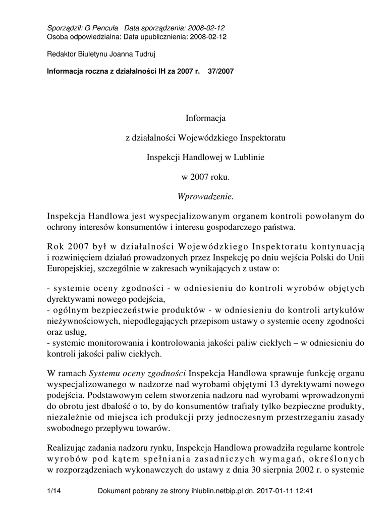 Sporządził: G Pencuła Data sporządzenia: 2008-02-12 Osoba odpowiedzialna: Data upublicznienia: 2008-02-12 Redaktor Biuletynu Joanna Tudruj Informacja roczna z działalności IH za 2007 r. 37/2007 Informacja z działalności Wojewódzkiego Inspektoratu Inspekcji Handlowej w Lublinie w 2007 roku. Wprowadzenie. Inspekcja Handlowa jest wyspecjalizowanym organem kontroli powołanym do ochrony interesów konsumentów i interesu gospodarczego państwa. Rok 2007 był w działalności Wojewódzkiego Inspektoratu kontynuacją i rozwinięciem działań prowadzonych przez Inspekcję po dniu wejścia Polski do Unii Europejskiej, szczególnie w zakresach wynikających z ustaw o: - systemie oceny zgodności - w odniesieniu do kontroli wyrobów objętych dyrektywami nowego podejścia, - ogólnym bezpieczeństwie produktów - w odniesieniu do kontroli artykułów nieżywnościowych, niepodlegających przepisom ustawy o systemie oceny zgodności oraz usług, - systemie monitorowania i kontrolowania jakości paliw ciekłych – w odniesieniu do kontroli jakości paliw ciekłych. W ramach Systemu oceny zgodności Inspekcja Handlowa sprawuje funkcję organu wyspecjalizowanego w nadzorze nad wyrobami objętymi 13 dyrektywami nowego podejścia. Podstawowym celem stworzenia nadzoru nad wyrobami wprowadzonymi do obrotu jest dbałość o to, by do konsumentów trafiały tylko bezpieczne produkty, niezależnie od miejsca ich produkcji przy jednoczesnym przestrzeganiu zasady swobodnego przepływu towarów. Realizując zadania nadzoru rynku, Inspekcja Handlowa prowadziła regularne kontrole wyrobów pod kątem spełniania zasadniczych wymagań, określonych w rozporządzeniach wykonawczych do ustawy z dnia 30 sierpnia 2002 r. o systemie 1/14 Dokument pobrany ze strony ihlublin.netbip.pl dn. 2017-01-11 12:41 oceny zgodności. Kontrolą objęto wyroby podlegające dyrektywom nowego podejścia, co ze względu na duże zróżnicowanie tematyki stanowiło dla całej Inspekcji, jak też Wojewódzkiego Inspektoratu duże wyzwanie. Na podkreślenie zasługuje fakt, że kontrole tego rodzaju były prowadzone już przed wejściem Polski do Unii Europejskiej, a wymagają one wysokiej wiedzy specjalistycznej z różnych branż. W 2007 roku Inspekcja Handlowa, swoje działania skoncentrowała również na prowadzeniu kontroli w zakresie spełniania przez produkty ogólnych wymagań bezpieczeństwa. Ich efektem było eliminowanie z obrotu tych produktów, które stwarzają zagrożenie dla zdrowia lub życia użytkowników. Wszystkie wyroby uznane za nie spełniające wymagań bezpieczeństwa zgłaszano Administratorowi Sieci KSIPN, w celu podjęcia postępowania wobec wprowadzającego do obrotu. Sprawdzano także czy na polskim rynku pojawiają się produkty wskazane jako niebezpieczne w międzynarodowej sieci powiadamiania TRAPEX, oraz wyroby uznane za niebezpieczne decyzją Prezesa UOKiK. W ubiegłym roku Inspekcja Handlowa objęła również kontrolą produkty, pod względem zgodności z deklarowaną przez producentów szczegółową charakterystyką jakościową, a także z informacjami zamieszczonymi na opakowaniach jednostkowych lub reklamach. W toku każdej kontroli sprawdzano także oznakowanie produktów, czy spełniają wymagania określone prawem oraz czy nie wprowadzają konsumentów w błąd. Inspekcja kontrolą objęła także legalność i rzetelność działania przedsiębiorców. W 2007 roku Wojewódzki Inspektorat Inspekcji Handlowej kontynuował także kontrole jakości paliw ciekłych w ramach Systemu Monitorowania i Kontrolowania Jakości Paliw Ciekłych i Biopaliw Ciekłych, którym zarządza Prezes Urzędu Ochrony Konkurencji i Konsumentów. Działania kontrolne na rynku paliw ciekłych w latach 2003 – 2007 spowodowały znaczący spadek sprzedaży paliw złej jakości. Zarejestrowany podczas kontroli na terenie województwa lubelskiego w roku 2003 wskaźnik kwestionowanych paliw wynosił 26,7 %, w 2004 r. 13,7 %, w 2005 roku 12,6%, w 2006 roku 3,48 % natomiast na koniec 2007r. 4,74 %. Efekty prowadzonej kontroli w zakresie badania jakości paliw płynnych, oprócz ochrony interesów konsumentów poprzez wyeliminowanie z rynku paliw niewłaściwej jakości, wzmacniane są publikowaną na stronach internetowych UOKiK listą skontrolowanych stacji paliw. Pozwala to konsumentom na podejmowanie w sposób racjonalny decyzji, co do wyboru stacji paliw, na których zdecydują się 2/14 Dokument pobrany ze strony ihlublin.netbip.pl dn. 2017-01-11 12:41 tankować swoje samochody. Jednocześnie w znaczący sposób wpływa na przedsiębiorców, którzy obawiając się reakcji konsumentów na informacje o oferowaniu paliwa niewłaściwej jakości dbają o jakość oferowanego konsumentom paliwa. W roku sprawozdawczym Wojewódzki Inspektorat Inspekcji Handlowej prowadził również szeroko zakrojone działania na rzecz niesienia bezpośredniej pomocy konsumentom przy rozwiązywaniu sporów konsumenckich. Działalność stałego polubownego sądu konsumenckiego funkcjonującego przy Wojewódzkim Inspektorze Inspekcji Handlowej oraz działania mediacyjne stanowiły formy alternatywnego sposobu rozstrzygania sporów konsumenckich. Prowadzone kompleksowe poradnictwo konsumenckie umożliwiło konsumentom i przedsiębiorcom uzyskanie informacji o przysługującym im prawach oraz ciążących na nich obowiązkach. Przyjęte i zapisane w kwartalnych planach pracy o znaczeniu krajowym na 2007r. zadania zostały przez Wojewódzki Inspektorat Inspekcji Handlowej w Lublinie w pełni zrealizowane. Z wykonania poszczególnych tematów kontrolnych sporządzano sprawozdania, które przedkładano Głównemu Inspektoratowi Inspekcji Handlowej. Ogólne wyniki działalności kontrolnej. Działania kontrolne Wojewódzkiego Inspektoratu Inspekcji Handlowej ukierunkowane były na badanie prawidłowości funkcjonowania rynku w odniesieniu do działających na nim przedsiębiorców oraz podmiotów świadczących różnego rodzaju usługi. 