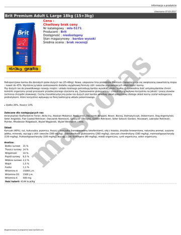 Informacje o produkcie Utworzono 07-03-2017 Brit Premium Adult L Large 18kg (15+3kg) Cena : Chwilowy brak ceny co ta s Nr katalogowy : mls-5171 Producent : Brit Dostępność : niedostępny Stan magazynowy : bardzo wysoki Średnia ocena : brak recenzji Pełnoporcjowa karma dla dorosłych psów dużych ras (25-40kg). Nowa, ulepszona linia produktów Premium charakteryzuje się zwiększoną zawartością mięsa - nawet do 45%. Wyróżnia ją także zastosowanie dodatku wyjątkowej formuły ziół i owoców poprawiających właściwości karmy. Psy dużych ras do prawidłowego rozwoju mięśni i układu kostnego potrzebują bardzo wysokiej jakości białka. Odpowiednia ilość antyoksydantów chroni komórki organizmu przed procesami przedwczesnego starzenia się. Zastosowanie glukozaminy i chondroityny wpływa korzystnie na jakość i pracę stawów (ochrona chrząstki stawowej). Cechą charakterystyczną psów ras dużych jest bardzo wrażliwy układ pokarmowy dlatego skład karmy został wzbogacony prebiotykami, które korzystnie wpływają na florę bakteryjną układu pokarmowego. ● białko 26%, tłuszcz 14% m as Zalecane dla następujących ras: Amerykański Staffordshire Terier, Akita Inu, Alaskan Malamut, Beauceron, Owczarek Belgijski, Boxer, Borzoj, Dalmatyńczyk, Dobermann, Dog Argentyński, Seter Angielski, Flat Coated Retriever, Owczarek Niemiecki, Sznaucer Olbrzymi, Golden Retriever, Seter Szkocki Gordon, Hovawart, Labrador Retriever, Pointer, Rhodesian Ridgeback, Wyżeł Węgierski, Wyżeł Weimarski i inne. Skład: Kurczak (40%), ryż, kukurydza, pszenica, tłuszcz z kurczaka (konserwowany tokoferolami), olej z łososia, drożdże browarniane, naturalny aromat, suszone jabłka, minerały, wyciągi z ziół i owoców (300 mg/kg), chlorowodorek glukozaminy (260 mg/kg), siarczan chondroityny (160 mg/kg), mannooligosacharydy (150 mg/kg), fruktooligosacharydy (100 mg/kg), wyciąg z juki Schidigera (80 mg/kg), miedź organiczna, cynk organiczny, selen organiczny. Analiza: Białko surowe 31 % Tłuszcz surowy 14 % Wilgotność 10 % Popiół surowy 6,5 % Włókno surowe 2,2 % Wapń 1,5 % Fosfor 1,1 % Witamina A 15000 j.m. Witamina D3 1500 j.m. Witamina E 500 mg Ilość kalorii: 4144 kcal/kg Wygenerowano w programie www.oscGold.com