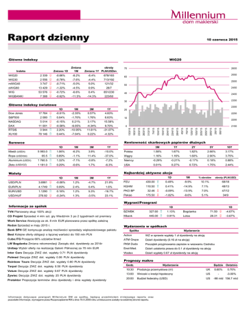 Raport dzienny 10 czerwca 2015 Gł€wne indeksy WIG20 Indeks Zmiana 1D Zmiana 1M obroty Zmiana 1Y PLN/USDm WIG20 2 339 -0.66% -8.2% -6.4% 678/183 WIG30 2 556 3 747 -0.78% -7.6% -4.4% 713/192 mWIG40 -0.71% -5.0% 5.0% 121/32 sWIG80 13 429 -1.22% -4.5% 0.9% 28/7 WIG 53 576 -0.72% -6.6% 0.4% 851/230 7 388 -0.62% -11.5% -14.3% 223/60 WIGBANKI 70 2600 2550 60 2500 50 2450 40 2400 30 2350 Gł€wne indeksy światowe 20 17 764 -0.01% -2.35% 0.57% 4.83% S&P500 2 080 0.04% -1.70% 1.76% 6.63% NASDAQ 5 014 -0.15% 0.21% 3.17% 15.58% DAX 11 001 -0.58% -6.05% -4.34% 9.70% RTSI$ 0 944 78 146 2.20% -10.95% 11.61% -31.07% 0.44% -7.04% 0.22% -4.32% 1D 1M 3M 1Y 5 993.0 1.06% -6.2% 3.9% -10.0% Polska 8/6/15 2/6/15 28/5/15 25/5/15 20/5/15 15/5/15 7/5/15 12/5/15 4/5/15 28/4/15 23/4/15 20/4/15 15/4/15 7/4/15 2150 10/4/15 0 Rentowność skarbowych papier€w dłużnych Surowce Miedź (USD/t) 2200 31/3/15 XU100 2250 10 26/3/15 1Y 23/3/15 3M 18/3/15 1M 13/3/15 Dow Jones 2300 1D 3M 1Y 2Y 5Y 10Y 1.58% 1.67% 1.82% 2.66% 3.17% 65.5 0.89% -1.1% 11.4% -37.0% Węgry 1.16% 1.16% 1.60% 2.90% 3.75% Aluminium (USD/t) 1 760.5 1.32% -7.1% -0.8% -7.2% Niemcy -0.29% -0.21% -0.17% 0.18% 0.88% Złoto (USD/OZ) 1 181.0 0.29% -0.6% 1.7% -6.3% USA 0.01% 0.27% 0.72% 1.75% 2.44% 1D 1M 3M 1Y Ropa (USD/bbl) Najbardziej aktywne akcje Waluty 1D 1M % obrot•w obroty (PLN/USD) USD/PLN 3.6981 -0.08% 1.2% -4.7% 21.9% PZU 430.00 0.49% -9.9% 10.1% 68/18 EUR/PLN 4.1749 0.09% 2.4% 0.4% 1.6% KGHM 110.50 0.41% -14.9% 7.1% 48/13 EUR/USD 1.1290 0.18% 1.2% 5.3% -16.7% PKO BP 32.46 -0.09% -13.9% 7.0% 47/12 USD/HUF 276.92 -0.24% 1.3% -3.5% 23.1% Pekao 175.50 -1.82% -9.6% 5.1% 34/9 Wygrani/Przegrani Informacje ze sp€łek 1D 1D TVN Planowany skup 100% akcji BZWBK 327.60 1.13% Bogdanka 71.50 -4.67% CD Projekt Sprzedaż 4 mln szt. gry Wiedźmin 3 po 2 tygodniach od premiery Mbank 445.00 0.91% Lotos 28.31 -3.67% Work Service Akwizycję za ok. 8 mln EUR planowana przez sp‚łkę zależną Redan Sprzedaż w maju 2015 r. Bank BPH GE kontynuuje analizę możliwości sprzedaży większościowego pakietu Wydarzenia w sp€łkach Sp•łka Wydarzenie Best Kolejne oferty obligacji o łącznej wartości do 150 mln PLN Action WZ w sprawie wypłaty 1 zł dywidendy na akcję Cube.ITG Przejęcie 66% udział‚w Itmed ATM Grupa Dzień dywidendy (0.16 zł na akcję) LW Bogdanka Zmiana rekomendacji Zarządu dot. dywidendy za 2014r PKM Duda Początek przyjmowania zapis‚w w wezwaniu Cedrobu Unibep Wyb‚r oferty na realizację Galerii P‚łnocnej za 70 mln EUR Enel-Med. Dzień ustalenia prawa do 0.1 zł dywidendy na akcję Inter Cars Decyzja ZWZ dot. wypłaty 0.71 PLN dywidendy Wadex Dzień wypłaty 0.67 zł dywidendy na akcję Polmed Decyzja ZWZ dot. wypłaty 0.06 PLN dywidendy Rainbow Tours Decyzja ZWZ dot. wypłaty 0.80 PLN dywidendy Torpol Decyzja ZWZ dot. wypłaty 0.50 PLN dywidendy Votum Decyzja ZWZ dot. wypłaty 0.67 PLN dywidendy Żywiec Decyzja ZWZ dot. wypłaty 25 PLN dywidendy Protektor Propozycja termin‚w dnia dywidendy i dnia wypłaty dywidendy Prognozy makro Godz. Wydarzenie Będzie Ostatnio 10:30 Produkcja przemysłowa (r/r) UK 0.60% 0.70% 13:00 Wnioski o kredyt hipoteczny US - -3.00% 20:00 Budżet federalny (USD) US Informacje dotyczące powiązań Millennium DM ze sp‚łką, będącą przedmiotem niniejszego raportu oraz pozostałe informacje, wymagane przez Rozporządzenie RM z dnia 19.X.2005 roku umieszczone zostały na ostatniej stronie raportu. -98 mld 156.7 mld Informacje ze sp€łek TVN Planowany skup 100% akcji Sp‚łka poinformowała, że w dniu 9 czerwca 2015 r. Scripps Networks Interactive (SNI) opublikował komunikat prasowy, w kt‚rym poinformował między innymi, iż "zamierza ogłosić wezwanie do sprzedaży 100% akcji TVN". SNI wskazał w swym komunikacie prasowym, iż "zgodnie z polskim prawem, Scripps Networks Interactive jest zobowiązany do ogłoszenia obowiązkowego wezwania na sprzedaż akcji TVN, aby zwiększyć sw‚j udział w TVN do 66%, w okresie trzech miesięcy od realizacji nabycia pakietu 52,7% TVN. Sp‚łka (SNI) dodatkowo zamierza zaoferować nabycie pozostałych akcji TVN oraz doprowadzić do wycofania akcji TVN z obrotu na Giełdzie Papier‚w Wartościowych w Warszawie." SNI wskazał także, iż "cena w wezwaniu nie została jeszcze ustalona". CD Projekt Sprzedaż 4 mln szt. gry Wiedźmin 3 po 2 tygodniach od premiery Sp‚łka poinformowała że przez pierwsze dwa tygodnie od premiery gracze kupili 4 mln szt. kopii Wiedźmina 3: Dziki Gon. "Jesteśmy bardziej niż zadowoleni ze sprzedaży Wiedźmina 3, kt‚ra przekroczyła nasze oczekiwania. Już w dniu premiery zwr‚ciły nam się całe ponoszone przez trzy lata nakłady na produkcję" - powiedział prezes sp‚łki Adam Kiciński. Work Service Akwizycję za ok. 8 mln EUR planowana przez sp•łkę zależną Work Service poinformowała że jej sp‚łka zależna Exact Systems planuje akwizycję o wartości około 8 mln EUR. Sp‚łka podpisała dokument "term sheet" w związku z planowaną akwizycją 100 proc. udział‚w polskiej sp‚łki z ograniczoną odpowiedzialnością oraz z uzyskaniem uprawnień do nabycia 100 proc. udział‚w belgijskiej i niemieckiej sp‚łki. Przejmowane podmioty specjalizują się w kontroli jakości dla przemysłu motoryzacyjnego. Ostateczna łączna wartość potencjalnej transakcji dla sp‚łki polskiej, belgijskiej i niemieckiej została ustalona na poziomie 8 mln EUR, "z przewidzianym w Term Sheet mechanizmem korekty tej ceny oraz mechanizmem ernautowym przewidzianym dla sp‚łki niemieckiej". Umowa ma być zawarta nie p‚źniej niż do końca lipca tego roku. Redan Sprzedaż w maju 2015 r. Sp‚łka poinformowała że szacunkowa wartość skonsolidowanych przychod‚w ze sprzedaży towar‚w zrealizowanych przez Grupę Redan w maju 2015 r. wyniosła 47 mln PLN i była o 16% wyższa por‚wnaniu do osiągniętych w tym samym okresie roku poprzedzającego. W ujęciu narastającym sprzedaż Grupy Kapitałowej Redan wynio
