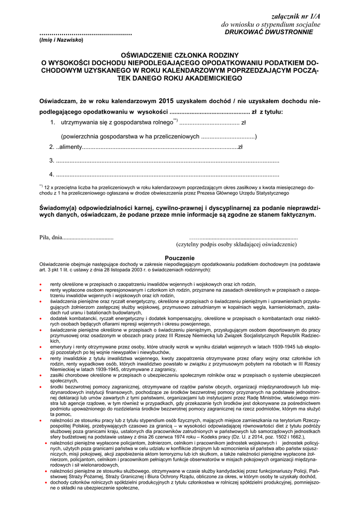 załącznik nr 1/A do wniosku o stypendium socjalne DRUKOWAĆ DWUSTRONNIE .............................................. (Imię i Nazwisko) OŚWIADCZENIE CZŁONKA RODZINY O WYSOKOŚCI DOCHODU NIEPODLEGAJĄCEGO OPODATKOWANIU PODATKIEM DOCHODOWYM UZYSKANEGO W ROKU KALENDARZOWYM POPRZEDZAJĄCYM POCZĄTEK DANEGO ROKU AKADEMICKIEGO Oświadczam, że w roku kalendarzowym 2015 uzyskałem dochód / nie uzyskałem dochodu niepodlegającego opodatkowaniu w wysokości ................................................ zł z tytułu: 1. utrzymywania się z gospodarstwa rolnego **) .................................... zł (powierzchnia gospodarstwa w ha przeliczeniowych ................................) 2. ..alimenty.............................................................................................zł 3. ..................................................................................................................................... 4. ..................................................................................................................................... 12 x przeciętna liczba ha przeliczeniowych w roku kalendarzowym poprzedzającym okres zasiłkowy x kwota miesięcznego dochodu z 1 ha przeliczeniowego ogłaszana w drodze obwieszczenia przez Prezesa Głównego Urzędu Statystycznego **) Świadomy(a) odpowiedzialności karnej, cywilno-prawnej i dyscyplinarnej za podanie nieprawdziwych danych, oświadczam, że podane przeze mnie informacje są zgodne ze stanem faktycznym. Piła, dnia.................................. ……................................................................ (czytelny podpis osoby składającej oświadczenie) Pouczenie Oświadczenie obejmuje następujące dochody w zakresie niepodlegającym opodatkowaniu podatkiem dochodowym (na podstawie art. 3 pkt 1 lit. c ustawy z dnia 28 listopada 2003 r. o świadczeniach rodzinnych): • • • • • • • • • • renty określone w przepisach o zaopatrzeniu inwalidów wojennych i wojskowych oraz ich rodzin, renty wypłacone osobom represjonowanym i członkom ich rodzin, przyznane na zasadach określonych w przepisach o zaopatrzeniu inwalidów wojennych i wojskowych oraz ich rodzin, świadczenia pieniężne oraz ryczałt energetyczny, określone w przepisach o świadczeniu pieniężnym i uprawnieniach przysługujących żołnierzom zastępczej służby wojskowej, przymusowo zatrudnianym w kopalniach węgla, kamieniołomach, zakładach rud uranu i batalionach budowlanych, dodatek kombatancki, ryczałt energetyczny i dodatek kompensacyjny, określone w przepisach o kombatantach oraz niektórych osobach będących ofiarami represji wojennych i okresu powojennego, świadczenie pieniężne określone w przepisach o świadczeniu pieniężnym, przysługującym osobom deportowanym do pracy przymusowej oraz osadzonym w obozach pracy przez III Rzeszę Niemiecką lub Związek Socjalistycznych Republik Radzieckich, emerytury i renty otrzymywane przez osoby, które utraciły wzrok w wyniku działań wojennych w latach 1939-1945 lub eksplozji pozostałych po tej wojnie niewypałów i niewybuchów, renty inwalidzkie z tytułu inwalidztwa wojennego, kwoty zaopatrzenia otrzymywane przez ofiary wojny oraz członków ich rodzin, renty wypadkowe osób, których inwalidztwo powstało w związku z przymusowym pobytem na robotach w III Rzeszy Niemieckiej w latach 1939-1945, otrzymywane z zagranicy, zasiłki chorobowe określone w przepisach o ubezpieczeniu społecznym rolników oraz w przepisach o systemie ubezpieczeń społecznych, środki bezzwrotnej pomocy zagranicznej, otrzymywane od rządów państw obcych, organizacji międzynarodowych lub międzynarodowych instytucji finansowych, pochodzące ze środków bezzwrotnej pomocy przyznanych na podstawie jednostronnej deklaracji lub umów zawartych z tymi państwami, organizacjami lub instytucjami przez Radę Ministrów, właściwego ministra lub agencje rządowe, w tym również w przypadkach, gdy przekazanie tych środków jest dokonywane za pośrednictwem podmiotu upoważnionego do rozdzielania środków bezzwrotnej pomocy zagranicznej na rzecz podmiotów, którym ma służyć ta pomoc, należności ze stosunku pracy lub z tytułu stypendium osób fizycznych, mających miejsce zamieszkania na terytorium Rzeczypospolitej Polskiej, przebywających czasowo za granicą – w wysokości odpowiadającej równowartości diet z tytułu podróży służbowej poza granicami kraju, ustalonych dla pracowników zatrudnionych w państwowych lub samorządowych jednostkach sfery budżetowej na podstawie ustawy z dnia 26 czerwca 1974 roku – Kodeks pracy (Dz. U. z 2014, poz. 1502 i 1662.), • należności pieniężne wypłacone policjantom, żołnierzom, celnikom i pracownikom jednostek wojskowych i jednostek policyjnych, użytych poza granicami państwa w celu udziału w konflikcie zbrojnym lub wzmocnienia sił państwa albo państw sojuszniczych, misji pokojowej, akcji zapobieżenia aktom terroryzmu lub ich skutkom, a także należności pieniężne wypłacone żołnierzom, policjantom, celnikom i pracownikom pełniącym funkcje obserwatorów w misjach pokojowych organizacji międzynarodowych i sił wielonarodowych, • należności pieniężne ze stosunku służbowego, otrzymywane w czasie służby kandydackiej przez funkcjonariuszy Policji, Państwowej Straży Pożarnej, Straży Granicznej i Biura Ochrony Rządu, obliczone za okres, w którym osoby te uzyskały dochód, • dochody członków rolniczych spółdzielni produkcyjnych z tytułu członkostwa w rolniczej spółdzielni produkcyjnej, pomniejszone o składki na ubezpieczenie społeczne, • stypendia doktoranckie i habilitacyjne przyznane na podstawie ustawy z dnia 14 marca 2003 roku o stopniach naukowych i tytule naukowym oraz o stopniach i tytule w zakresie sztuki Dz.U. z 2014 r. poz. 1852 z późn.zm.), stypendia doktoranckie określone w art. 200 ustawy z dnia 27 lipca 2005 r. – Prawo o szkolnictwie wyższym (Dz. U. z 2