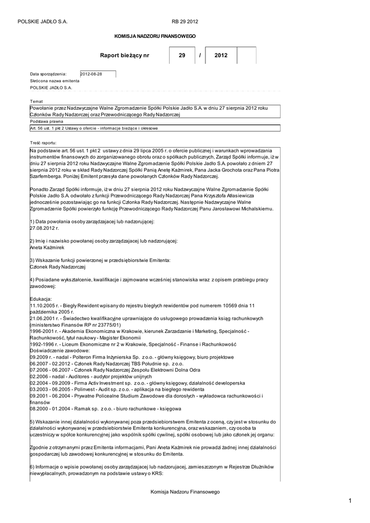 POLSKIE JADŁO S.A. RB 29 2012 KOMISJA NADZORU FINANSOWEGO Raport bieżący nr Data sporządzenia: 29 / 2012 2012-08-28 Skrócona nazwa emitenta POLSKIE JADŁO S.A. Temat Powołanie przez Nadzwyczajne Walne Zgromadzenie Spółki Polskie Jadło S.A. w dniu 27 sierpnia 2012 roku Członków Rady Nadzorczej oraz Przewodniczącego Rady Nadzorczej Podstawa prawna Art. 56 ust. 1 pkt 2 Ustawy o ofercie - informacje bieżące i okresowe Treść raportu: Na podstawie art. 56 ust. 1 pkt 2 ustawy z dnia 29 lipca 2005 r. o ofercie publicznej i warunkach wprowadzania instrumentów finansowych do zorganizowanego obrotu oraz o spółkach publicznych, Zarząd Spółki informuje, iż w dniu 27 sierpnia 2012 roku Nadzwyczajne Walne Zgromadzenie Spółki Polskie Jadło S.A. powołało z dniem 27 sierpnia 2012 roku w skład Rady Nadzorczej Spółki Panią Anetę Kaźmirek, Pana Jacka Grochota oraz Pana Piotra Szarfemberga. Poniżej Emitent przesyła dane powołanych Członków Rady Nadzorczej. Ponadto Zarząd Spółki informuje, iż w dniu 27 sierpnia 2012 roku Nadzwyczajne Walne Zgromadzenie Spółki Polskie Jadło S.A. odwołało z funkcji Przewodniczącego Rady Nadzorczej Pana Krzysztofa Atłasiewicza jednocześnie pozostawiając go na funkcji Członka Rady Nadzorczej. Następnie Nadzwyczajne Walne Zgromadzenie Spółki powierzyło funkcję Przewodniczącego Rady Nadzorczej Panu Jarosławowi Michalskiemu. 1) Data powołania osoby zarządzajacej lub nadzorującej: 27.08.2012 r. 2) Imię i nazwisko powołanej osoby zarządzajacej lub nadzorującej: Aneta Kaźmirek 3) Wskazanie funkcji powierzonej w przedsiębiorstwie Emitenta: Członek Rady Nadzorczej 4) Posiadane wykształcenie, kwalifikacje i zajmowane wcześniej stanowiska wraz z opisem przebiegu pracy zawodowej: Edukacja: 11.10.2005 r. - Biegły Rewident wpisany do rejestru biegłych rewidentów pod numerem 10569 dnia 11 października 2005 r. 21.06.2001 r. - Świadectwo kwalifikacyjne uprawniające do usługowego prowadzenia ksiąg rachunkowych (ministerstwo Finansów RP nr 23775/01) 1996-2001 r. - Akademia Ekonomiczna w Krakowie, kierunek Zarzadzanie i Marketing, Specjalność Rachunkowość, tytuł naukowy - Magister Ekonomii 1992-1996 r. - Liceum Ekonomiczne nr 2 w Krakowie, Specjalność - Finanse i Rachunkowość Doświadczenie zawodowe: 09.2009 r. - nadal - Polteron Firma Inżynierska Sp. z o.o. - główny księgowy, biuro projektowe 06.2007 - 02.2012 - Członek Rady Nadzorczej TBS Południe sp. z o.o. 07.2006 - 06.2007 - Członek Rady Nadzorczej Zespołu Elektrowni Dolna Odra 02.2006 - nadal - Auditores - audytor projektów unijnych 02.2004 - 09.2009 - Firma Activ Investment sp. z o.o. - główny księgowy, działalność developerska 03.2003 - 06.2005 - Polinvest - Audit sp. z o.o. - aplikacja na biegłego rewidenta 09.2001 - 06.2004 - Prywatne Policealne Studium Zawodowe dla dorosłych - wykładowca rachunkowości i finansów 08.2000 - 01.2004 - Ramak sp. z o.o. - biuro rachunkowe - księgowa 5) Wskazanie innej działalności wykonywanej poza przedsiebiorstwem Emitenta z oceną, czy jest w stosunku do działalności wykonywanej w przedsiebiorstwie Emitenta konkurencyjna, oraz wskazaniem, czy osoba ta uczestniczy w spółce konkurencyjnej jako wspólnik spółki cywilnej, spółki osobowej lub jako członek jej organu: Zgodnie z otrzymanymi przez Emitenta informacjami, Pani Aneta Kaźmirek nie prowadzi żadnej innej działalności gospodarczej lub zawodowej konkurencyjnej w stosunku do Emitenta. 6) Informacje o wpisie powołanej osoby zarządzajacej lub nadzorujacej, zamieszczonym w Rejestrze Dłużników niewypłacalnych, prowadzonym na podstawie ustawy o KRS: Komisja Nadzoru Finansowego 1 POLSKIE JADŁO S.A. RB 29 2012 Pani Aneta Kaźmirek nie figuruje w Rejestrze Dłużników Niewypłacalnych, prowadzonym na podstawie ustawy o KRS. 1) Data powołania osoby zarządzającej lub nadzorującej: 27.08.2012 r. 2) Imię i nazwisko powołanej osoby zarządzającej lub nadzorującej: Jacek Grochot 3) Wskazanie funkcji powierzonej w przedsiębiorstwie Emitenta: Członek Rady Nadzorczej 4) Posiadane wykształcenie, kwalifikacje i zajmowane wcześniej stanowiska wraz z opisem przebiegu pracy zawodowej: Edukacja: 1987 -1991 - wykształcenie średnie gastronomiczne Doświadczenie zawodwe: 2007 - obecnie - własna działalność gospodarcza 2011 - 2012 - Polksie Jadło SA - manager zarządzający - PIT STOP Bar 2008 - 2010 - manager restauracji Gościniec Polskie Jadło w Poczesnej 2002 - 2007 - Restauracje Chłopskie Jadło 1991 - 2002 - Hotel Francuski w Krakowie 5) Wskazanie innej działalności wykonywanej poza przedsiebiorstwem Emitenta z oceną, czy jest w stosunku do działalności wykonywanej w przedsiebiorstwie Emitenta konkurencyjna, oraz wskazaniem, czy osoba ta uczestniczy w spółce konkurencyjnej jako wspólnik spółki cywilnej, spółki osobowej lub jako członek jej organu: Działalność gospodarcza gastronomiczna - Franczyzobiorca Polskie Jadło S.A. 6) Informacje o wpisie powołanej osoby zarządzajacej lub nadzorujacej, zamieszczonym w Rejestrze Dłuzników niewypłacalnych, prowadzonym na podstawie ustawy o KRS: Pan Jacek Grochot nie figuruje w Rejestrze Dłużników Niewypłacalnych, prowadzonym na podstawie ustawy o KRS. 1) Data powołania osoby zarządzajacej lub nadzorujacej: 27.08.2012 r. 2) Imię i nazwisko powołanej osoby zarządzajacej lub nadzorującej: Piotr Szarfemberg 3) Wskazanie funkcji powierzonej w przedsiębiorstwie Emitenta: Członek Rady Nadzorczej 4) Posiadane wykształcenie, kwalifikacje i zajmowane wcześniej stanowiska wraz z opisem przebiegu pracy zawodowej: Edukacja: Absolwent Uniwersytetu Mikołaja Kopernika w Toruniu na Wydziale Ekonomii. Doświadczenie zawodowe: 1993 - obecnie - własna działalność gospodarcza - Przedsiębiorstwo Prywatne "Altravox" - branża papiernicza 1987 - 1992 - International Paper Kwidzyn S.A. - stanowisko handlowe 1979 - 1986 - Spółdzielnia Pracy we Włocławku - stanowisko han