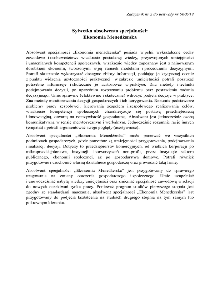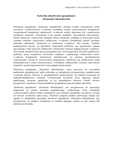 Załącznik nr 2 do uchwały nr 56/X/14 Sylwetka absolwenta specjalności: Ekonomia Menedżerska Absolwent specjalności „Ekonomia menadżerska” posiada w pełni wykształcone cechy zawodowe i osobowościowe w zakresie posiadanej wiedzy, przyswojonych umiejętności i umacnianych kompetencji społecznych. w zakresie wiedzy zapoznany jest z najnowszym dorobkiem ekonomii, tworzonymi w jej ramach modelami i procedurami decyzyjnymi. Potrafi skutecznie wykorzystać dostępne zbiory informacji, poddając je krytycznej ocenie z punktu widzenia użyteczności praktycznej. w zakresie umiejętności potrafi poszukać potrzebne informacje i skutecznie je zastosować w praktyce. Zna metody i techniki podejmowania decyzji, po uprzednim rozpoznaniu problemu oraz postawieniu zadania decyzyjnego. Umie sprawnie (efektywnie i skutecznie) wdrożyć podjętą decyzję w praktyce. Zna metody monitorowania decyzji gospodarczych i ich korygowania. Rozumie podstawowe problemy pracy zespołowej, kierowania zespołem i zespołowego realizowania celów. w zakresie kompetencji społecznych charakteryzuje się postawą przedsiębiorczą i innowacyjną, otwartą na rzeczywistość gospodarczą. Absolwent jest jednocześnie osobą komunikatywną w sensie merytorycznym i werbalnym. Jednocześnie rozumnie racje innych (empatia) i potrafi argumentować swoje poglądy (asertywność). Absolwent specjalności „Ekonomia Menedżerska” może pracować we wszystkich podmiotach gospodarczych, gdzie potrzebne są umiejętności przygotowania, podejmowania i realizacji decyzji. Dotyczy to przedsiębiorstw komercyjnych, od wielkich korporacji po mikroprzedsiębiorstwa, instytucji i stowarzyszeń non-profit, przez instytucje sektora publicznego, ekonomii społecznej, aż po gospodarstwa domowe. Potrafi również przygotować i uruchomić własną działalność gospodarczą oraz prowadzić taką firmę. Absolwent specjalności „Ekonomia Menedżerska” jest przygotowany do sprawnego reagowania na zmiany otoczenia gospodarczego i społecznego. Umie uzupełniać i unowocześniać nabytą wiedzę, umiejętności oraz zmieniać specjalność zawodową w relacji do nowych oczekiwań rynku pracy. Ponieważ program studiów pierwszego stopnia jest zgodny ze standardami nauczania, absolwent specjalności „Ekonomia Menedżerska” jest przygotowany do podjęcia kształcenia na studiach drugiego stopnia na tym samym lub pokrewnym kierunku. Załącznik nr 2 do uchwały nr 56/X/14 Sylwetka absolwenta specjalności: Ekonomia Sektora Publicznego Zgodnie z przyjętymi standardami nauczania absolwent specjalności Ekonomia Sektora Publicznego posiada wiedzę i umiejętności w zakresie gospodarowania zasobami finansowymi, rzeczowymi i ludzkimi w sferze publicznej. Jest on doskonale przygotowany do wykonywania zawodu ekonomisty i swoje miejsce znajdzie w każdej części sfery administracji państwowej i samorządowej. Grupy przedmiotów podstawowych, kierunkowych i specjalnościowych przygotowują go merytorycznie do poszukiwania odpowiedzi na pytania o skuteczność gospodarowania zasobami publicznymi i zaspokajania potrzeb zbiorowych. Dzięki zdolnościom analitycznym absolwent potrafi przeprowadzić analizę zjawisk gospodarczych i społecznych i na tej podstawie wyciągać właściwe wnioski. Absolwent posiada specjalistyczną wiedzę w zakresie planowania rozwoju lokalnego i regionalnego. Dzięki znajomości zewnętrznych źródeł finansowania zadań publicznych, w szczególności ze źródeł UE oraz dużej orientacji w przepisach prawa administracyjnego i rachunkowości budżetowej, absolwent potrafi opracować wniosek aplikacyjny oraz przeprowadzić jego skuteczną realizację i rozliczenie. Aspekty społeczne w procesie planowania stanowią ważny element procesu decyzyjnego. Jednakże absolwent potrafi odróżnić racjonalne wydatkowanie środków publicznych od marnotrawstwa i defraudacji. Analiza kosztów - korzyści jest dla absolwenta wyznacznikiem racjonalnych wyborów, a znajomość narzędzi matematycznych i informatycznych zwiększa jego szanse na trafność wyborów w sferze publicznej. Miejscem pracy absolwenta specjalności: Ekonomia Sektora Publicznego mogą być wszystkie struktury sfery publicznej. Począwszy od sfery rzędowej poprzez sferę samorządową, jednostki organizacyjne i powiązane ze sferą publiczną. Dzięki uniwersalnej wiedzy z zakresu funduszy UE absolwent skutecznie może ubiegać się o pracę w instytucjach wspierających administrację samorządową w zakresie pozyskiwania i rozliczania środków europejskich. Znajomość ogólnych zagadnień ekonomicznych, powiązana ze specyfiką administracji publicznej zwiększa szansę absolwenta na pozyskanie pracy w sferze prywatnej, w komórkach organizacyjnych współpracujących z jednostkami samorządu terytorialnego lub administracją rządową. Absolwent specjalności: Ekonomia Sektora Publicznego jest przygotowany do elastycznego dostosowywania się do zmian otoczenia gospodarczego. Jest gotów do uzupełnienia nabytej wiedzy i umiejętności oraz zmiany specjalności zawodowej, w sytuacji zmian oczekiwań pracodawców na rynku pracy. Ponieważ program studiów pierwszego stopnia jest zgodny ze standardami nauczania, absolwent jest przygotowany do podjęcia kształcenia na studiach drugiego stopnia na tym samym lub pokrewnym kierunku.