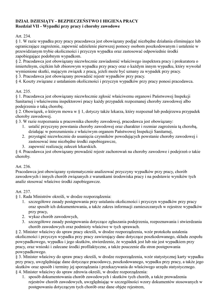 DZIAŁ DZIESIĄTY - BEZPIECZEŃSTWO I HIGIENA PRACY Rozdział VII - Wypadki przy pracy i choroby zawodowe Art. 234. § 1. W razie wypadku przy pracy pracodawca jest obowiązany podjąć niezbędne działania eliminujące lub ograniczające zagrożenie, zapewnić udzielenie pierwszej pomocy osobom poszkodowanym i ustalenie w przewidzianym trybie okoliczności i przyczyn wypadku oraz zastosować odpowiednie środki zapobiegające podobnym wypadkom. § 2. Pracodawca jest obowiązany niezwłocznie zawiadomić właściwego inspektora pracy i prokuratora o śmiertelnym, ciężkim lub zbiorowym wypadku przy pracy oraz o każdym innym wypadku, który wywołał wymienione skutki, mającym związek z pracą, jeżeli może być uznany za wypadek przy pracy. § 3. Pracodawca jest obowiązany prowadzić rejestr wypadków przy pracy. § 4. Koszty związane z ustalaniem okoliczności i przyczyn wypadków przy pracy ponosi pracodawca. Art. 235. § 1. Pracodawca jest obowiązany niezwłocznie zgłosić właściwemu organowi Państwowej Inspekcji Sanitarnej i właściwemu inspektorowi pracy każdy przypadek rozpoznanej choroby zawodowej albo podejrzenia o taką chorobę. § 2. Obowiązek, o którym mowa w § 1, dotyczy także lekarza, który rozpoznał lub podejrzewa przypadek choroby zawodowej. § 3. W razie rozpoznania u pracownika choroby zawodowej, pracodawca jest obowiązany: 1. ustalić przyczyny powstania choroby zawodowej oraz charakter i rozmiar zagrożenia tą chorobą, działając w porozumieniu z właściwym organem Państwowej Inspekcji Sanitarnej, 2. przystąpić niezwłocznie do usunięcia czynników powodujących powstanie choroby zawodowej i zastosować inne niezbędne środki zapobiegawcze, 3. zapewnić realizację zaleceń lekarskich. § 4. Pracodawca jest obowiązany prowadzić rejestr zachorowań na choroby zawodowe i podejrzeń o takie choroby. Art. 236. Pracodawca jest obowiązany systematycznie analizować przyczyny wypadków przy pracy, chorób zawodowych i innych chorób związanych z warunkami środowiska pracy i na podstawie wyników tych analiz stosować właściwe środki zapobiegawcze. Art. 237. § 1. Rada Ministrów określi, w drodze rozporządzenia: 1. szczegółowe zasady postępowania przy ustalaniu okoliczności i przyczyn wypadków przy pracy oraz sposób ich dokumentowania, a także zakres informacji zamieszczanych w rejestrze wypadków przy pracy, 2. wykaz chorób zawodowych, 3. szczegółowe zasady postępowania dotyczące zgłaszania podejrzenia, rozpoznawania i stwierdzania chorób zawodowych oraz podmioty właściwe w tych sprawach. § 2. Minister właściwy do spraw pracy określi, w drodze rozporządzenia, wzór protokołu ustalenia okoliczności i przyczyn wypadku przy pracy zawierający dane dotyczące poszkodowanego, składu zespołu powypadkowego, wypadku i jego skutków, stwierdzenie, że wypadek jest lub nie jest wypadkiem przy pracy, oraz wnioski i zalecane środki profilaktyczne, a także pouczenie dla stron postępowania powypadkowego. § 3. Minister właściwy do spraw pracy określi, w drodze rozporządzenia, wzór statystycznej karty wypadku przy pracy, uwzględniając dane dotyczące pracodawcy, poszkodowanego, wypadku przy pracy, a także jego skutków oraz sposób i terminy jej sporządzania i przekazywania do właściwego urzędu statystycznego. § 4. Minister właściwy do spraw zdrowia określi, w drodze rozporządzenia: 1. sposób dokumentowania chorób zawodowych i skutków tych chorób, a także prowadzenia rejestrów chorób zawodowych, uwzględniając w szczególności wzory dokumentów stosowanych w postępowaniu dotyczącym tych chorób oraz dane objęte rejestrem, 2. wytyczne diagnostyczno-orzecznicze i kryteria rozpoznawania chorób zawodowych, uwzględniając w szczególności rodzaj choroby oraz czynniki szkodliwe i uciążliwe wywołujące te choroby. Art. 2371. § 1. Pracownikowi, który uległ wypadkowi przy pracy lub zachorował na chorobę zawodową określoną w wykazie, o którym mowa w art. 237 § 1 pkt 2, przysługują świadczenia z ubezpieczenia społecznego, określone w odrębnych przepisach. § 2. Pracownikowi, który uległ wypadkowi przy pracy, przysługuje od pracodawcy odszkodowanie za utratę lub uszkodzenie w związku z wypadkiem przedmiotów osobistego użytku oraz przedmiotów niezbędnych do wykonywania pracy, z wyjątkiem utraty lub uszkodzenia pojazdów samochodowych oraz wartości pieniężnych.