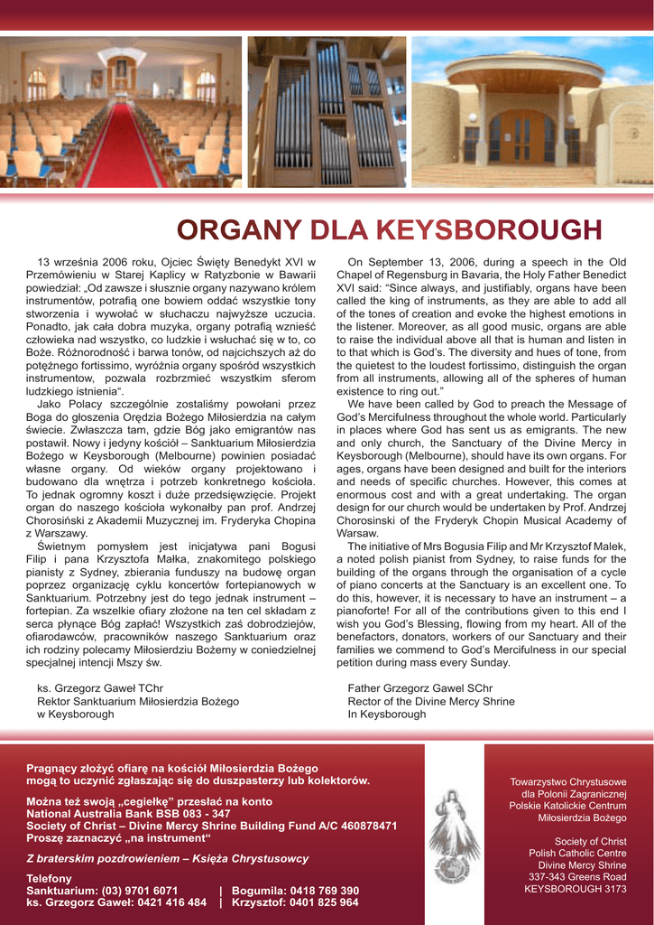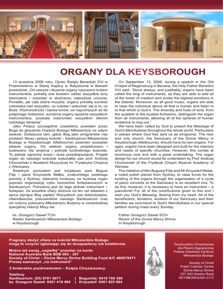 ORGANY DLA KEYSBOROUGH 13 września 2006 roku, Ojciec Święty Benedykt XVI w Przemówieniu w Starej Kaplicy w Ratyzbonie w Bawarii powiedział: „Od zawsze i słusznie organy nazywano królem instrumentów, potrafią one bowiem oddać wszystkie tony stworzenia i wywołać w słuchaczu najwyższe uczucia. Ponadto, jak cała dobra muzyka, organy potrafią wznieść człowieka nad wszystko, co ludzkie i wsłuchać się w to, co Boże. Różnorodność i barwa tonów, od najcichszych aż do potężnego fortissimo, wyróżnia organy spośród wszystkich instrumentow, pozwala rozbrzmieć wszystkim sferom ludzkiego istnienia“. Jako Polacy szczególnie zostaliśmy powołani przez Boga do głoszenia Orędzia Bożego Miłosierdzia na całym świecie. Zwłaszcza tam, gdzie Bóg jako emigrantów nas postawił. Nowy i jedyny kościół – Sanktuarium Miłosierdzia Bożego w Keysborough (Melbourne) powinien posiadać własne organy. Od wieków organy projektowano i budowano dla wnętrza i potrzeb konkretnego kościoła. To jednak ogromny koszt i duże przedsięwzięcie. Projekt organ do naszego kościoła wykonałby pan prof. Andrzej Chorosiński z Akademii Muzycznej im. Fryderyka Chopina z Warszawy. Świetnym pomysłem jest inicjatywa pani Bogusi Filip i pana Krzysztofa Małka, znakomitego polskiego pianisty z Sydney, zbierania funduszy na budowę organ poprzez organizację cyklu koncertów fortepianowych w Sanktuarium. Potrzebny jest do tego jednak instrument – fortepian. Za wszelkie ofiary złożone na ten cel składam z serca płynące Bóg zapłać! Wszystkich zaś dobrodziejów, ofiarodawców, pracowników naszego Sanktuarium oraz ich rodziny polecamy Miłosierdziu Bożemy w coniedzielnej specjalnej intencji Mszy św. On September 13, 2006, during a speech in the Old Chapel of Regensburg in Bavaria, the Holy Father Benedict XVI said: “Since always, and justifiably, organs have been called the king of instruments, as they are able to add all of the tones of creation and evoke the highest emotions in the listener. Moreover, as all good music, organs are able to raise the individual above all that is human and listen in to that which is God’s. The diversity and hues of tone, from the quietest to the loudest fortissimo, distinguish the organ from all instruments, allowing all of the spheres of human existence to ring out.” We have been called by God to preach the Message of God’s Mercifulness throughout the whole world. Particularly in places where God has sent us as emigrants. The new and only church, the Sanctuary of the Divine Mercy in Keysborough (Melbourne), should have its own organs. For ages, organs have been designed and built for the interiors and needs of specific churches. However, this comes at enormous cost and with a great undertaking. The organ design for our church would be undertaken by Prof. Andrzej Chorosinski of the Fryderyk Chopin Musical Academy of Warsaw. The initiative of Mrs Bogusia Filip and Mr Krzysztof Malek, a noted polish pianist from Sydney, to raise funds for the building of the organs through the organisation of a cycle of piano concerts at the Sanctuary is an excellent one. To do this, however, it is necessary to have an instrument – a pianoforte! For all of the contributions given to this end I wish you God’s Blessing, flowing from my heart. All of the benefactors, donators, workers of our Sanctuary and their families we commend to God’s Mercifulness in our special petition during mass every Sunday. ks. Grzegorz Gaweł TChr Rektor Sanktuarium Miłosierdzia Bożego w Keysborough Father Grzegorz Gawel SChr Rector of the Divine Mercy Shrine In Keysborough Pragnący złożyć ofiarę na kościół Miłosierdzia Bożego mogą to uczynić zgłaszając się do duszpasterzy lub kolektorów. Można też swoją „cegiełkę” przesłać na konto National Australia Bank BSB 083 - 347 Society of Christ – Divine Mercy Shrine Building Fund A/C 460878471 Proszę zaznaczyć „na instrument“ Z braterskim pozdrowieniem – Księża Chrystusowcy Telefony Sanktuarium: (03) 9701 6071 ks. Grzegorz Gaweł: 0421 416 484 | Bogumila: 0418 769 390 | Krzysztof: 0401 825 964 Towarzystwo Chrystusowe dla Polonii Zagranicznej Polskie Katolickie Centrum Miłosierdzia Bożego Society of Christ Polish Catholic Centre Divine Mercy Shrine 337-343 Greens Road KEYSBOROUGH 3173