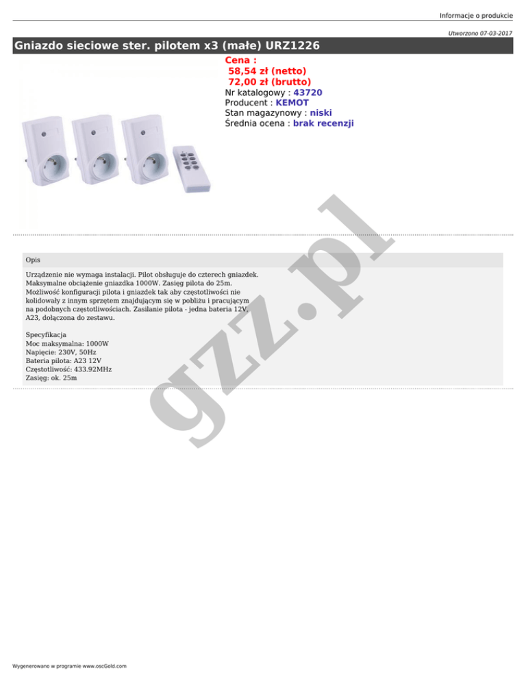 Informacje o produkcie Utworzono 07-03-2017 Gniazdo sieciowe ster. pilotem x3 (małe) URZ1226 Cena : 58,54 zł (netto) 72,00 zł (brutto) .p l Nr katalogowy : 43720 Producent : KEMOT Stan magazynowy : niski Średnia ocena : brak recenzji Opis gz z Urządzenie nie wymaga instalacji. Pilot obsługuje do czterech gniazdek. Maksymalne obciążenie gniazdka 1000W. Zasięg pilota do 25m. Możliwość konfiguracji pilota i gniazdek tak aby częstotliwości nie kolidowały z innym sprzętem znajdującym się w pobliżu i pracującym na podobnych częstotliwościach. Zasilanie pilota - jedna bateria 12V, A23, dołączona do zestawu. Specyfikacja Moc maksymalna: 1000W Napięcie: 230V, 50Hz Bateria pilota: A23 12V Częstotliwość: 433.92MHz Zasięg: ok. 25m Wygenerowano w programie www.oscGold.com