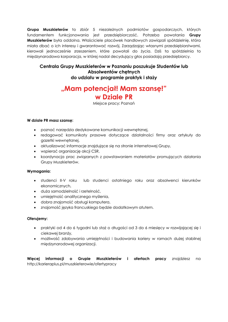 Grupa Muszkieterów to zbiór 5 niezależnych podmiotów gospodarczych, których fundamentem funkcjonowania jest przedsiębiorczość. Potrzeba powołania Grupy Muszkieterów była oddolna. Właściciele placówek handlowych zawiązali spółdzielnię, która miała dbać o ich interesy i gwarantować rozwój. Zarządzając własnymi przedsiębiorstwami, kierowali jednocześnie zrzeszeniem, które powołali do życia. Dziś ta spółdzielnia to międzynarodowa korporacja, w której nadal decydujący głos posiadają przedsiębiorcy. Centrala Grupy Muszkieterów w Poznaniu poszukuje Studentów lub Absolwentów chętnych do udziału w programie praktyk i staży „Mam potencjał! Mam szansę!” w Dziale PR Miejsce pracy: Poznań W dziale PR masz szansę: • • • • • poznać narzędzia dedykowane komunikacji wewnętrznej, redagować komunikaty prasowe dotyczące działalności firmy oraz artykuły do gazetki wewnętrznej, aktualizować informacje znajdujące się na stronie internetowej Grupy, wspierać organizację akcji CSR, koordynacja prac związanych z powstawaniem materiałów promujących działania Grupy Muszkieterów. Wymagania: • • • • • studenci II-V roku lub studenci ostatniego roku oraz absolwenci kierunków ekonomicznych, duża samodzielność i rzetelność, umiejętność analitycznego myślenia, dobra znajomość obsługi komputera, znajomość języka francuskiego będzie dodatkowym atutem. Oferujemy: • • praktyki od 4 do 6 tygodni lub staż o długości od 3 do 6 miesięcy w rozwijającej się i ciekawej branży, możliwość zdobywania umiejętności i budowania kariery w ramach dużej stabilnej międzynarodowej organizacji. Więcej informacji o Grupie Muszkieterów http://karieraplus.pl/muszkieterowie/ofertypracy i ofertach pracy znajdziesz na