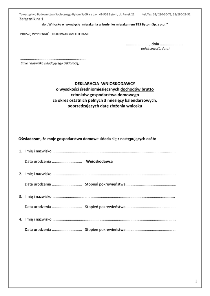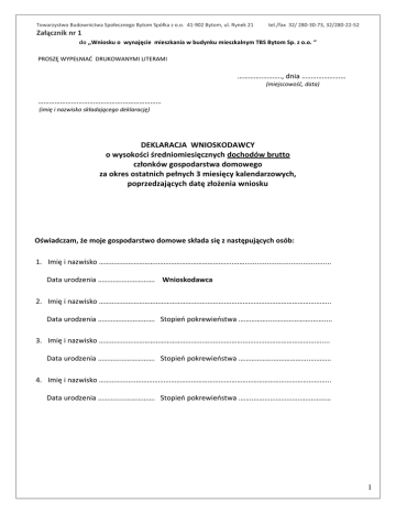 Towarzystwo Budownictwa Społecznego Bytom Spółka z o.o. 41-902 Bytom, ul. Rynek 21 tel./fax 32/ 280-30-73, 32/280-22-52 Załącznik nr 1 do „Wniosku o wynajęcie mieszkania w budynku mieszkalnym TBS Bytom Sp. z o.o. ” PROSZĘ WYPEŁNIAĆ DRUKOWANYMI LITERAMI ………….……….., dnia …………………… (miejscowość, data) ……………………………………….………………… (imię i nazwisko składającego deklarację) DEKLARACJA WNIOSKODAWCY o wysokości średniomiesięcznych dochodów brutto członków gospodarstwa domowego za okres ostatnich pełnych 3 miesięcy kalendarzowych, poprzedzających datę złożenia wniosku Oświadczam, że moje gospodarstwo domowe składa się z następujących osób: 1. Imię i nazwisko …………………………..…………………………………..……........................................... Data urodzenia …………………………. Wnioskodawca 2. Imię i nazwisko ……………………………………………….………….…….…………………………………………... Data urodzenia …………………………. Stopień pokrewieństwa …………….....……………….……..... 3. Imię i nazwisko ……………………………………………………..…………….……………………………………..... Data urodzenia …………………………. Stopień pokrewieństwa ……………….………………..……….. 4. Imię i nazwisko ………………..……………………………………………………………………………………….…... Data urodzenia …………………………. Stopień pokrewieństwa ……..……………………..….………… 1 Towarzystwo Budownictwa Społecznego Bytom Spółka z o.o. 41-902 Bytom, ul. Rynek 21 tel./fax 32/ 280-30-73, 32/280-22-52 Załącznik nr 1 do „Wniosku o wynajęcie mieszkania w budynku mieszkalnym TBS Bytom Sp. z o.o. ” Oświadczam, że podanym wyżej okresie dochody moje i wymienionych wyżej członków mojego gospodarstwa wyniosły: Wysokość Miejsce pracy/nauki L.p. Podać według liczby porządkowej Źródła dochodu 1)2) 3-miesięcznego dochodu brutto w zł osób wymienionych na stronie nr 1 1. 2. 3. 4. Razem 3-miesięczne łączne dochody brutto gospodarstwa domowego Średniomiesięczny dochód brutto na 1 członka gospodarstwa domowego wynosi …………………… zł 1. Za dochód, z zastrzeżeniem ust. 3, uważa się wszelkie przychody pomniejszone o faktyczne koszty ich uzyskania (dochód brutto). W wypadku przychodów, od których są odliczane koszty ryczałtowe ich uzyskania, dochód ustala się po odliczeniu tych kosztów. 2. Do dochodów zalicza się w szczególności dochody z tytułu: 1) pracy, działalności gospodarczej, umów zlecenia lub o dzieło, 2) zasiłków pielęgnacyjnych, rodzinnych i wychowawczych, 3) świadczeń otrzymywanych z powodu odbywania przez członka gospodarstwa domowego służby wojskowej lub zastępczej, 4) środków za rozłąkę, 5) świadczeń wypłacanych załogom pływającym, 6) świadczeń z pomocy społecznej, 7) prowadzenia gospodarstwa rolnego, ustalane z zastosowaniem hektarów przeliczeniowych według zasad określonych w przepisach o podatku rolnym, 8) alimentów, stypendiów, emerytur i rent, w tym rent zagranicznych, 9) dywidend i innych periodycznie uzyskiwanych dochodów, zwłaszcza z najmu lub dzierżawy, praw autorskich lub wykonywania wolnych zawodów; oraz 10) oszacowane przez wnioskodawcę dochody z ryczałtu ewidencjonowanego i karty podatkowej. 3. Do dochodu nie wlicza się dodatków dla sierot zupełnych, zasiłków okresowych z pomocy społecznej oraz jednorazowych świadczeń pieniężnych i świadczeń w naturze z pomocy społecznej. Składając osobiście niniejsza deklarację oświadczam, że jest mi wiadomo, że dokumenty na podstawie których zadeklarowałem(am) dochody jestem zobowiązany(a) przechowywać przez okres 3 lat, a uprzedzony(a) o odpowiedzialności karnej z art. 233 § 1 Kodeksy karnego - potwierdzam własnoręcznym podpisem prawdziwość danych zamieszczonych w deklaracji. ……………………………………. (podpis Wnioskodawcy) Objaśnienia: ) Wymienić oddzielnie każde źródło dochodu; 2 ) Każde źródło dochodu należy udokumentować właściwym zaświadczeniem. 1 2