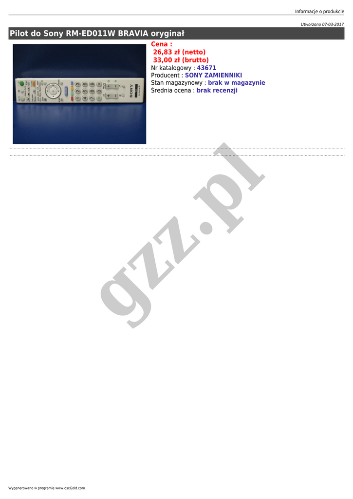 Informacje o produkcie Utworzono 07-03-2017 Pilot do Sony RM-ED011W BRAVIA oryginał Cena : 26,83 zł (netto) 33,00 zł (brutto) gz z .p l Nr katalogowy : 43671 Producent : SONY ZAMIENNIKI Stan magazynowy : brak w magazynie Średnia ocena : brak recenzji Wygenerowano w programie www.oscGold.com