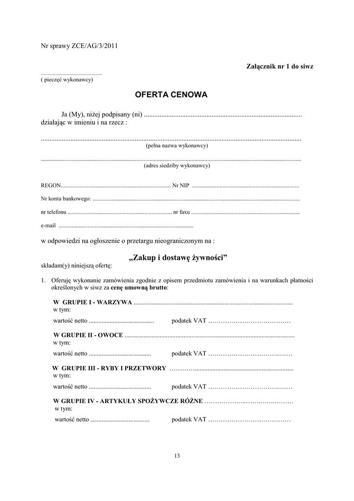 Nr sprawy ZCE/AG/3/2011 Załącznik nr 1 do siwz ............................................... ( pieczęć wykonawcy) OFERTA CENOWA Ja (My), niżej podpisany (ni) ........................................................................................... działając w imieniu i na rzecz : ...................................................................................................................................................... (pełna nazwa wykonawcy) .................................................................................................................................................................................... (adres siedziby wykonawcy) REGON............................................................................ Nr NIP .......................................................................... Nr konta bankowego: ............................................................................................................................................... nr telefonu ........................................................................ nr faxu ........................................................................... e-mail ............................................................................................. w odpowiedzi na ogłoszenie o przetargu nieograniczonym na : „Zakup i dostawę żywności” składam(y) niniejszą ofertę: 1. Oferuję wykonanie zamówienia zgodnie z opisem przedmiotu zamówienia i na warunkach płatności określonych w siwz za cenę umowną brutto: W GRUPIE I - WARZYWA .................................................................................................... w tym: wartość netto ......................................... podatek VAT ………………………………… W GRUPIE II - OWOCE ........................................................................................................... w tym: wartość netto ....................................... podatek VAT …………………………….…… W GRUPIE III - RYBY I PRZETWORY ………….............................................................. w tym: wartość netto ....................................... podatek VAT …………………………….…… W GRUPIE IV - ARTYKUŁY SPOŻYWCZE RÓŻNE ………………..…….…….……… w tym: wartość netto ..................................... podatek VAT ………………………………… 13 Nr sprawy ZCE/AG/3/2011 W GRUPIE V - JAJA ……………………………..…………………………..……………… w tym: wartość netto ................................... podatek VAT …………………………………. W GRUPIE VI - KONCENTRATY SPOŻYWCZE ………………………………………… w tym: wartość netto ................................... podatek VAT ……………………………..…… W GRUPIE VII - MROŻONKI ……………………………………………………………… w tym: wartość netto .................................... podatek VAT …………………………………… 2. Oświadczam(y),że przedmiot zamówienia będzie realizowany w terminie od dnia podpisania umowy do dnia 31.12.2011r. 3. Oświadczam(y), że jesteśmy związani niniejszą ofertą przez okres 30 dni od upływu terminu składania ofert. 4. Oświadczam(y), że w razie wybrania naszej oferty zobowiązujemy się do podpisania umowy na warunkach zawartych we wzorze umowy dołączonym do siwz oraz w miejscu i terminie określonym przez zamawiającego. 5. Oferujemy udzielenie gwarancji jakości zgodnie w wymogami określonymi w siwz. 6. Oświadczamy, że powierzymy podwykonawcom wykonanie następującej części zamówienia: .................................................................................................................................................... (jeżeli wykonawca przewiduje udział podwykonawców). 7. Oświadczamy, że oferta nie zawiera/ zawiera (właściwe podkreślić) informacji stanowiących tajemnicę przedsiębiorstwa w rozumieniu przepisów o zwalczaniu nieuczciwej konkurencji. Informacje takie zawarte są w następujących dokumentach: ................................................................................. ................................................................................. ................................................................................. Ofertę składamy na ................................ kolejno ponumerowanych stronach. Na ofertę składają się : 1. ................................... 2. ................................... 3. ................................... 4. ................................... 5. ................................... ..............................., dn. ............................... ..................................................................... (podpis(y) osób uprawnionych do reprezentacji wykonawcy, w przypadku oferty wspólnej- podpis pełnomocnika wykonawców) 14