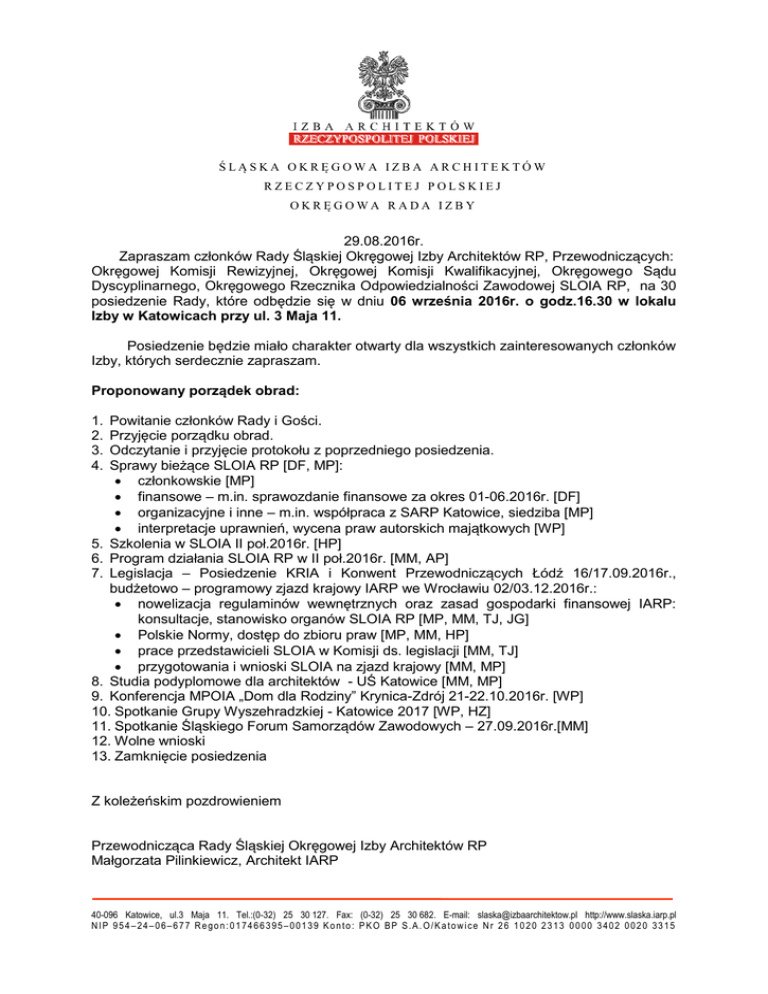 ŚLĄSKA OKRĘGOWA IZBA ARCHITEKTÓW RZECZYPOSPOLITEJ POLSKIEJ OKRĘGOWA RADA IZBY 29.08.2016r. Zapraszam członków Rady Śląskiej Okręgowej Izby Architektów RP, Przewodniczących: Okręgowej Komisji Rewizyjnej, Okręgowej Komisji Kwalifikacyjnej, Okręgowego Sądu Dyscyplinarnego, Okręgowego Rzecznika Odpowiedzialności Zawodowej SLOIA RP, na 30 posiedzenie Rady, które odbędzie się w dniu 06 września 2016r. o godz.16.30 w lokalu Izby w Katowicach przy ul. 3 Maja 11. Posiedzenie będzie miało charakter otwarty dla wszystkich zainteresowanych członków Izby, których serdecznie zapraszam. Proponowany porządek obrad: Powitanie członków Rady i Gości. Przyjęcie porządku obrad. Odczytanie i przyjęcie protokołu z poprzedniego posiedzenia. Sprawy bieżące SLOIA RP [DF, MP]: członkowskie [MP] finansowe – m.in. sprawozdanie finansowe za okres 01-06.2016r. [DF] organizacyjne i inne – m.in. współpraca z SARP Katowice, siedziba [MP] interpretacje uprawnień, wycena praw autorskich majątkowych [WP] 5. Szkolenia w SLOIA II poł.2016r. [HP] 6. Program działania SLOIA RP w II poł.2016r. [MM, AP] 7. Legislacja – Posiedzenie KRIA i Konwent Przewodniczących Łódź 16/17.09.2016r., budżetowo – programowy zjazd krajowy IARP we Wrocławiu 02/03.12.2016r.: nowelizacja regulaminów wewnętrznych oraz zasad gospodarki finansowej IARP: konsultacje, stanowisko organów SLOIA RP [MP, MM, TJ, JG] Polskie Normy, dostęp do zbioru praw [MP, MM, HP] prace przedstawicieli SLOIA w Komisji ds. legislacji [MM, TJ] przygotowania i wnioski SLOIA na zjazd krajowy [MM, MP] 8. Studia podyplomowe dla architektów - UŚ Katowice [MM, MP] 9. Konferencja MPOIA „Dom dla Rodziny” Krynica-Zdrój 21-22.10.2016r. [WP] 10. Spotkanie Grupy Wyszehradzkiej - Katowice 2017 [WP, HZ] 11. Spotkanie Śląskiego Forum Samorządów Zawodowych – 27.09.2016r.[MM] 12. Wolne wnioski 13. Zamknięcie posiedzenia 1. 2. 3. 4. Z koleżeńskim pozdrowieniem Przewodnicząca Rady Śląskiej Okręgowej Izby Architektów RP Małgorzata Pilinkiewicz, Architekt IARP 40-096 Katowice, ul.3 Maja 11. Tel.:(0-32) 25 30 127. Fax: (0-32) 25 30 682. E-mail: [email protected] http://www.slaska.iarp.pl NIP 954–24–06–677 Regon:017466395–00139 Konto: PKO BP S.A.O/Katowice Nr 26 1020 2313 0000 3402 0020 3315 ŚLĄSKA OKRĘGOWA IZBA ARCHITEKTÓW RZECZYPOSPOLITEJ POLSKIEJ OKRĘGOWA RADA IZBY otrzymują : - Piotr Średniawa - zastępca przewodniczącego, - Henryk Zubel - zastępca przewodniczącego, - Danuta Fredowicz – Skarbnik - Mikołaj Machulik – Sekretarz, członkowie Rady: - Krzysztof Gorgoń - Zbigniew Jędrzejkiewicz - Beata Młynarska-Nawratek - Stanisław Nestrypke - Henryk Piątek, - Arkadiusz Płomecki Przewodniczący organów SLOIA RP: - Piotr Then - Przewodniczący OKR, - Wojciech Podleski – Przewodniczący OKK, - Teobald Jałyński – Przewodniczący OSD, - Janusz Grychowski – Okręgowy Rzecznik Odpowiedzialności Zawodowej oraz - Piotr Franta – Członek KRIA RP [PF] - Grzegorz Konik - Radca Prawny – obsługa prawna SLOIA RP - Wiesław Lewandowski – obsługa finansowo – księgowa SLOIA RP - Ewa Figura – obsługa finansowo – księgowa SLOIA RP Objaśnienia skrótów: Małgorzata Pilinkiewicz –MP, Piotr Średniawa – PS, Henryk Zubel – HZ, Danuta Fredowicz – DF, Mikołaj Machulik – MM, Krzysztof Gorgoń –KG, Zbigniew Jędrzejkiewicz – ZJ, Beata Młynarska-Nawratek – BMN, Stanisław Nestrypke –SN, Henryk Piątek – HP, Arkadiusz Płomecki – AP, Piotr Then – PT, Wojciech Podleski – WP, Teobald Jałyński – TJ, Janusz Grychowski – JG, Grzegorz Konik – GK, Wiesław Lewandowski – WL, Ewa Figura [EF]. 40-096 Katowice, ul.3 Maja 11. Tel.:(0-32) 25 30 127. Fax: (0-32) 25 30 682. E-mail: [email protected] http://www.slaska.iarp.pl NIP 954–24–06–677 Regon:017466395–00139 Konto: PKO BP S.A.O/Katowice Nr 26 1020 2313 0000 3402 0020 3315