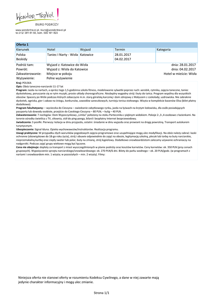 Oferta 1 Kierunek Polska Beskidy Hotel Wyjazd Taniec I Narty - Wisła Katowice Podróż tam: Powrót: Zakwaterowanie: Wyżywienie: Wyjazd z: Katowice do Wisła Wyjazd z: Wisła do Katowice Miejsce w pokoju Pełne wyżywienie Termin 28.01.2017 04.02.2017 Kategoria dnia: 28.01.2017 dnia: 04.02.2017 Hotel w mieście: Wisła Kraj: POLSKA Opis: Obóz taneczno-narciarski 11-17 lat Program: Jazda na nartach, a oprócz tego 1,5-godzinna szkoła fitness, modelowanie sylwetki poprzez ruch: aerobik, rytmika, zajęcia taneczne, taniec dyskotekowy, poruszanie się w rytm muzyki, proste układy choreograficzne. Niezbędny wygodny strój i buty do tańca. Program wspólny dla wszystkich obozów: Spacery po Wiśle podczas których zobaczycie m.in. starą góralską karczmę i dom zdrojowy z Małyszem z czekolady; uzdrowiska. Nie zabraknie dyskotek, ogniska, gier i zabaw na śniegu, konkursów, zawodów saneczkowych, turnieju tenisa stołowego. Wizyta w kompleksie basenów Olza (bilet płatny dodatkowo). Program fakultatywny: – wycieczka do Cieszyna – zwiedzanie zabytkowego rynku, jazda na łyżwach na krytym lodowisku, dla osób posiadających paszporty lub dowody osobiste, przejście do Czeskiego Cieszyna – 80 PLN; – kulig – 40 PLN. Zakwaterowanie: 7 nocłegów: Dom Wypoczynkowy „Limba” położony na stoku Partecznika z pięknym widokiem. Pokoje 2-,3-,4-osobowe z łazienkami. Na terenie ośrodka świetlica z TV, siłownia, stół do ping-ponga, bilard i bezpłatny Internet bezprzewodowy. świadczenia: 3 posiłki. Pierwszy: kolacja w dniu przyjazdu, ostatni: śniadanie w dniu wyjazdu oraz prowiant na drogę powrotną. Transport autokarem turystycznym. Ubezpieczenie: Signal Iduna. Opieka wychowawców/instruktorów. Realizacja programu. Uwagi praktyczne: W przypadku złych warunków pogodowych zajęcia programowe oraz uzupełniające mogą ulec modyfikacji. Na obóz należy zabrać: kaski ochronne (obowiązkowe do 18-go roku życia), strój i obuwie odpowiednie do zajęć na obozie, legitymację szkolną, plecak lub torbę na buty narciarskie, nieprzemakalną kurtkę oraz ciepły sweter lub polar, buty na zmianę, strój kąpielowy. Dodatkowo snowboardzistom zalecamy używanie ochraniaczy na nadgarstki. Podczas zajęć grupy wiekowe mogą być łączone. Cena nie obejmuje: dopłaty za transport z miast wyszczególnionych w planie podróży oraz kosztów karnetów. Ceny karnetów: ok. 350 PLN (przy cenach grupowych). Wypożyczenie sprzętu narciarskiego/snowboardowego: ok. 270 PLN/6 dni. Bilety do parku wodnego – ok. 20 PLN/godz. (w programach z nartami i snowboardem min. 1 wizyta; w pozostałych – min. 2 wizyty). Filmy: Niniejsza oferta nie stanowi oferty w rozumieniu Kodeksu Cywilnego, a dane w niej zawarte mają jedynie charakter informacyjny i mogą ulec zmianie. Strona 1/1 Powered by TCPDF (www.tcpdf.org)