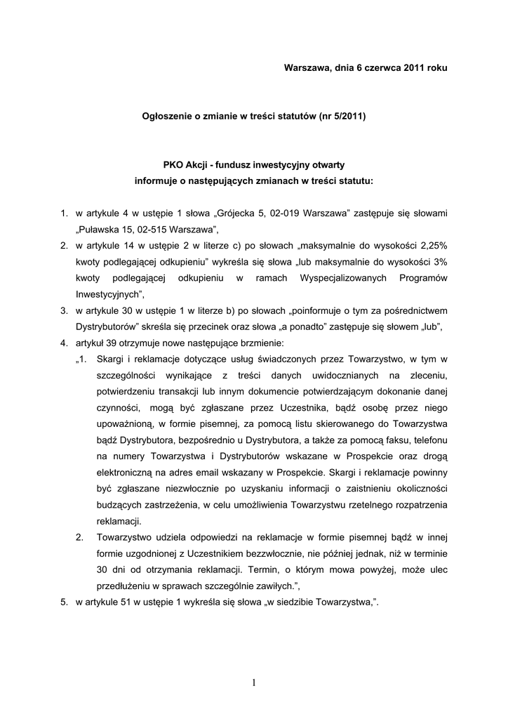 Warszawa, dnia 6 czerwca 2011 roku Ogłoszenie o zmianie w treści statutów (nr 5/2011) PKO Akcji - fundusz inwestycyjny otwarty informuje o następujących zmianach w treści statutu: 1. w artykule 4 w ustępie 1 słowa „Grójecka 5, 02-019 Warszawa” zastępuje się słowami „Puławska 15, 02-515 Warszawa”, 2. w artykule 14 w ustępie 2 w literze c) po słowach „maksymalnie do wysokości 2,25% kwoty podlegającej odkupieniu” wykreśla się słowa „lub maksymalnie do wysokości 3% kwoty podlegającej odkupieniu w ramach Wyspecjalizowanych Programów Inwestycyjnych”, 3. w artykule 30 w ustępie 1 w literze b) po słowach „poinformuje o tym za pośrednictwem Dystrybutorów” skreśla się przecinek oraz słowa „a ponadto” zastępuje się słowem „lub”, 4. artykuł 39 otrzymuje nowe następujące brzmienie: „1. Skargi i reklamacje dotyczące usług świadczonych przez Towarzystwo, w tym w szczególności wynikające z treści danych uwidocznianych na zleceniu, potwierdzeniu transakcji lub innym dokumencie potwierdzającym dokonanie danej czynności, mogą być zgłaszane przez Uczestnika, bądź osobę przez niego upoważnioną, w formie pisemnej, za pomocą listu skierowanego do Towarzystwa bądź Dystrybutora, bezpośrednio u Dystrybutora, a także za pomocą faksu, telefonu na numery Towarzystwa i Dystrybutorów wskazane w Prospekcie oraz drogą elektroniczną na adres email wskazany w Prospekcie. Skargi i reklamacje powinny być zgłaszane niezwłocznie po uzyskaniu informacji o zaistnieniu okoliczności budzących zastrzeżenia, w celu umożliwienia Towarzystwu rzetelnego rozpatrzenia reklamacji. 2. Towarzystwo udziela odpowiedzi na reklamacje w formie pisemnej bądź w innej formie uzgodnionej z Uczestnikiem bezzwłocznie, nie później jednak, niż w terminie 30 dni od otrzymania reklamacji. Termin, o którym mowa powyżej, może ulec przedłużeniu w sprawach szczególnie zawiłych.”, 5. w artykule 51 w ustępie 1 wykreśla się słowa „w siedzibie Towarzystwa,”. 1 PKO Akcji Małych i Średnich Spółek - fundusz inwestycyjny otwarty informuje o następujących zmianach w treści statutu: 1. w artykule 4 w ustępie 1 słowa „Grójecka 5, 02-019 Warszawa” zastępuje się słowami „Puławska 15, 02-515 Warszawa”, 2. w artykule 31 w ustępie 1 litera b) otrzymuje nowe, następujące brzmienie: „b) jako część oferty specjalnej lub kampanii promocyjnej skierowanej do wszystkich lub określonych grup Inwestorów lub Uczestników, których Fundusz poinformuje za pośrednictwem Dystrybutorów lub infolinii, lub informacji zamieszczonej na stronie www.pkotfi.pl, lub za pośrednictwem pisemnej informacji skierowanej do adresatów, lub za pośrednictwem ogłoszenia opublikowanego zgodnie z art. 52 ust. 3,”, 3. artykuł 40 otrzymuje nowe następujące brzmienie: „1. Skargi i reklamacje dotyczące usług świadczonych przez Towarzystwo, w tym w szczególności wynikające z treści danych uwidocznianych na zleceniu, potwierdzeniu transakcji lub innym dokumencie potwierdzającym dokonanie danej czynności, mogą być zgłaszane przez Uczestnika, bądź osobę przez niego upoważnioną, w formie pisemnej, za pomocą listu skierowanego do Towarzystwa bądź Dystrybutora, bezpośrednio u Dystrybutora, a także za pomocą faksu, telefonu na numery Towarzystwa i Dystrybutorów wskazane w Prospekcie oraz drogą elektroniczną na adres email wskazany w Prospekcie. Skargi i reklamacje powinny być zgłaszane niezwłocznie po uzyskaniu informacji o zaistnieniu okoliczności budzących zastrzeżenia, w celu umożliwienia Towarzystwu rzetelnego rozpatrzenia reklamacji. 2. Towarzystwo udziela odpowiedzi na reklamacje w formie pisemnej bądź w innej formie uzgodnionej z Uczestnikiem bezzwłocznie, nie później jednak, niż w terminie 30 dni od otrzymania reklamacji. Termin, o którym mowa powyżej, może ulec przedłużeniu w sprawach szczególnie zawiłych.”, 4. w artykule 52 w ustępie 1 wykreśla się słowa „w siedzibie Towarzystwa,”. PKO Akcji Nowa Europa - fundusz inwestycyjny otwarty informuje o następujących zmianach w treści statutu: 1. w artykule 4 w ustępie 1 słowa „Grójecka 5, 02-019 Warszawa” zastępuje się słowami „Puławska 15, 02-515 Warszawa”, 2. w artykule 30 w ustępie 1 litera b) otrzymuje nowe następujące brzmienie: „b) jako część oferty specjalnej lub kampanii promocyjnej skierowanej do wszystkich lub określonych grup Inwestorów lub Uczestników, których Fundusz poinformuje za pośrednictwem Dystrybutorów lub infolinii, lub informacji zamieszczonej na stronie 2 www.pkotfi.pl, lub za pośrednictwem pisemnej informacji skierowanej do adresatów, lub za pośrednictwem ogłoszenia opublikowanego zgodnie z art. 52 ust. 3,”, 3. artykuł 40 otrzymuje nowe następujące brzmienie: „1. Skargi i reklamacje dotyczące usług świadczonych przez Towarzystwo, w tym w szczególności wynikające z treści danych uwidocznianych na zleceniu, potwierdzeniu transakcji lub innym dokumencie potwierdzającym dokonanie danej czynności, mogą być zgłaszane przez Uczestnika, bądź osobę przez niego upoważnioną, w formie pisemnej, za pomocą listu skierowanego do Towarzystwa bądź Dystrybutora, bezpośrednio u Dystrybutora, a także za pomocą faksu, telefonu na numery Towarzystwa i Dystrybutorów wskazane w Prospekcie oraz drogą elektroniczną na adres email wskazany w Prospekcie. Skargi i reklamacje powinny być zgłaszane niezwłocznie po uzyskaniu informacji o zaistnieniu okoliczności budzących zastrzeżenia, w celu umożliwienia Towarzystwu rzetelnego rozpatrzenia reklamacji. 2. Towarzystwo udziela odpowiedzi na reklamacje w formie pisemnej bądź w innej formie uzgodnionej z Uczestnikiem bezzwłocznie, nie później jednak, niż w terminie 30 dni od otrzymania reklamacji. Termin, o którym mowa powyżej, może ulec przedłużeniu w sprawach szczególnie zawiłych.”, 4. w artykule 52 w ustępie 1 wykreś