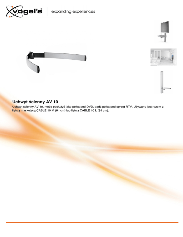 Uchwyt ścienny AV 10 Uchwyt ścienny AV 10, może posłużyć jako półka pod DVD, bądź półka pod sprzęt RTV. Używany jest razem z listwą maskującą CABLE 10 M (64 cm) lub listwą CABLE 10 L (94 cm). Uchwyt ścienny AV 10 Odpowiednie akcesoria sprawią, że twoje centrum rozrywki będzie naprawdę się wyróżniać. Uchwyt ścienny AV 10, można umieścić na dowolnej wysokości na listwie CABLE 10 i wykorzystać go jako półkę pod DVD. Dodatkowo, można go użyć jako półkę pod sprzęt RTV większości marek i rozmiarów. Cechy - Adjustable in height Informacje logistyczne Szerokość pojedynczego opakowania (mm) 310 Długość pojedynczego opakowania (mm) 381 Wysokość pojedynczego opakowania (mm) 67 Version: 02-Sep-2016 Subject to printing errors, technical and price amendments. www.vogels.com