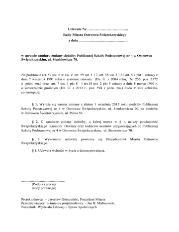 Uchwała Nr ………………………......... Rady Miasta Ostrowca Świętokrzyskiego z dnia ………........................................... w sprawie zamiaru zmiany siedziby Publicznej Szkoły Podstawowej nr 4 w Ostrowcu Świętokrzyskim, ul. Sienkiewicza 70. Na podstawie art. 59 ust. 6 w zw. z art. 59 ust. 1 i 2, art. 58 ust. 1 i 6 i art. 5 c pkt 1 ustawy z dnia 7 września 1991 roku o systemie oświaty (Dz. U. z 2004 roku, Nr 256, poz. 2572 z późn. zm.) oraz art. 7 ust. 1 pkt 8 i art.18 ust. 2 pkt 5 ustawy z dnia 8 marca 1990 r. o samorządzie gminnym (Dz. U. z 2013 r., poz. 594 z późn. zm.) Rada Miasta uchwala, co następuje: § 1. Wyraża się zamiar zmiany z dniem 1 września 2015 roku siedziby Publicznej Szkoły Podstawowej nr 4 w Ostrowcu Świętokrzyskim, ul. Sienkiewicza 70, na siedzibę w Ostrowcu Świętokrzyskim, ul. Polna 56. § 2. O zamiarze zmiany siedziby, o której mowa w § 1, należy powiadomić Świętokrzyskiego Kuratora Oświaty oraz rodziców uczniów uczęszczających do Publicznej Szkoły Podstawowej nr 4 w Ostrowcu Świętokrzyskim, ul. Sienkiewicza 70. § 3. Wykonanie Świętokrzyskiego. uchwały powierza się Prezydentowi § 4. Uchwała wchodzi w życie z dniem powzięcia. ................................................ (Podpis i pieczęć radcy prawnego) Projektodawca – Jarosław Górczyński, Prezydent Miasta Przedstawiający w imieniu projektodawcy - Jan B. Malinowski, Naczelnik Wydziału Edukacji i Spraw Społecznych Miasta Ostrowca Uzasadnienie Publiczna Szkoła Podstawowa nr 4 w Ostrowcu Świętokrzyskim funkcjonuje w siedzibie przy ul. Henryka Sienkiewicza 70. Niewystarczające, w aspekcie współczesnych wymagań edukacyjnych, są warunki do właściwego, atrakcyjnego realizowania zajęć m.in. z wychowania fizycznego, ponieważ brakuje sali gimnastycznej. Stan techniczny budynku Publicznej Szkoły Podstawowej nr 4 w żadnym wypadku nie stanowi zagrożenia, ale wymaga wielu prac i nakładów finansowych na remonty (np. wymiana stolarki drzwiowej), co wynika choćby z jego wieku. Przeniesienie siedziby Publicznej Szkoły Podstawowej nr 4 z ul. Henryka Sienkiewicza 70 na ul. Polną 56 (odległość miedzy budynkami to około 600 m), gdzie obecnie zlokalizowane jest Publiczne Gimnazjum nr 2, da uczniom szkoły podstawowej lepsze warunki kształcenia (budynek przy polnej ul. Polnej 56 posiada 21 sal lekcyjnych, a obecna siedziba PSP nr 4 – 14), możliwość korzystania z sali gimnastycznej i atrakcyjniejszej bazy, jaką w chwili obecnej oferuje budynek przy ulicy Polnej 56. Ponadto usytuowanie Publicznej Szkoły Podstawowej nr 4 w budynku przy ul. Polnej 56 gwarantowałoby zracjonalizowanie eksploatacji obiektu oraz przyczyniłoby się do zmniejszenia kosztów ponoszonych przez gminę w związku z utrzymaniem szkół funkcjonujących w obecnej sieci szkolnej (powstanie możliwość sprzedaży lub wykorzystania na inne cele budynku przy ul. Henryka Sienkiewicza 70). Przeniesienie Publicznej Szkoły Podstawowej nr 4 do nowej siedziby, usytuowanej około 600 metrów od obecnej, umożliwi społeczności szkolnej kontynuowanie procesu dydaktycznego, wychowawczego i opiekuńczego w środowisku już znanym, przyjaznym, bezpiecznym, w tym samym obwodzie szkolnym. Zmiana lokalizacji w żaden sposób nie wpłynie na stopień organizacji PSP nr 4 oraz nie spowoduje jakichkolwiek negatywnych skutków w zatrudnieniu zarówno pracowników pedagogicznych jak i administracyjno-obsługowych. Podsumowując, należy stwierdzić, że zmiana siedziby Publicznej Szkoły Podstawowej nr 4 w Ostrowcu Świętokrzyskim nie spowoduje zmian w obwodzie szkoły i znacząco wpłynie na poprawę warunków i jakości kształcenia oraz racjonalne wykorzystanie obiektów tworzących sieć szkół prowadzonych przez Gminę Ostrowiec Świętokrzyski. Ponadto pozwoli dostosować sieć szkół do dynamicznie zmieniających się warunków demograficznych, lokalowych i ekonomicznych.