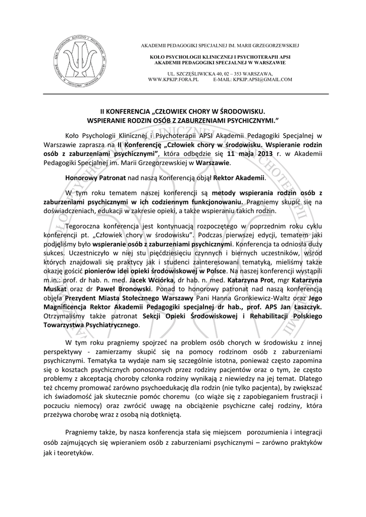 AKADEMII PEDAGOGIKI SPECJALNEJ IM. MARII GRZEGORZEWSKIEJ KOŁO PSYCHOLOGII KLINICZNEJ I PSYCHOTERAPII APSI AKADEMII PEDAGOGIKI SPECJALNEJ W WARSZAWIE UL. SZCZĘŚLIWICKA 40, 02 – 353 WARSZAWA, WWW.KPKIP.FORA.PL E-MAIL: [email protected] II KONFERENCJA „CZŁOWIEK CHORY W ŚRODOWISKU. WSPIERANIE RODZIN OSÓB Z ZABURZENIAMI PSYCHICZNYMI.” Koło Psychologii Klinicznej i Psychoterapii APSI Akademii Pedagogiki Specjalnej w Warszawie zaprasza na II Konferencję „Człowiek chory w środowisku. Wspieranie rodzin osób z zaburzeniami psychicznymi”, która odbędzie się 11 maja 2013 r. w Akademii Pedagogiki Specjalnej im. Marii Grzegorzewskiej w Warszawie. Honorowy Patronat nad naszą Konferencją objął Rektor Akademii. W tym roku tematem naszej konferencji są metody wspierania rodzin osób z zaburzeniami psychicznymi w ich codziennym funkcjonowaniu. Pragniemy skupić się na doświadczeniach, edukacji w zakresie opieki, a także wspieraniu takich rodzin. Tegoroczna konferencja jest kontynuacją rozpoczętego w poprzednim roku cyklu konferencji pt. „Człowiek chory w środowisku”. Podczas pierwszej edycji, tematem jaki podjęliśmy było wspieranie osób z zaburzeniami psychicznymi. Konferencja ta odniosła duży sukces. Uczestniczyło w niej stu pięćdziesięciu czynnych i biernych uczestników, wśród których znajdowali się praktycy jak i studenci zainteresowani tematyką, mieliśmy także okazję gościć pionierów idei opieki środowiskowej w Polsce. Na naszej konferencji wystąpili m.in.: prof. dr hab. n. med. Jacek Wciórka, dr hab. n. med. Katarzyna Prot, mgr Katarzyna Muskat oraz dr Paweł Bronowski. Ponad to honorowy patronat nad naszą konferencją objęła Prezydent Miasta Stołecznego Warszawy Pani Hanna Gronkiewicz-Waltz oraz Jego Magnificencja Rektor Akademii Pedagogiki specjalnej dr hab., prof. APS Jan Łaszczyk. Otrzymaliśmy także patronat Sekcji Opieki Środowiskowej i Rehabilitacji Polskiego Towarzystwa Psychiatrycznego. W tym roku pragniemy spojrzeć na problem osób chorych w środowisku z innej perspektywy - zamierzamy skupić się na pomocy rodzinom osób z zaburzeniami psychicznymi. Tematyka ta wydaje nam się szczególnie istotna, ponieważ często zapomina się o kosztach psychicznych ponoszonych przez rodziny pacjentów oraz o tym, że często problemy z akceptacją choroby członka rodziny wynikają z niewiedzy na jej temat. Dlatego też chcemy promować zarówno psychoedukację dla rodzin (nie tylko pacjenta), by zwiększać ich świadomość jak skutecznie pomóc choremu (co wiąże się z zapobieganiem frustracji i poczuciu niemocy) oraz zwrócić uwagę na obciążenie psychiczne całej rodziny, która przeżywa chorobę wraz z osobą nią dotkniętą. Pragniemy także, by nasza konferencja stała się miejscem porozumienia i integracji osób zajmujących się wpieraniem osób z zaburzeniami psychicznymi – zarówno praktyków jak i teoretyków. Naszą inicjatywę poparli także: • • • • • Prof. dr hab. Maria Załuska dr Beata Zimowska Pan Piotr Chuchler, Prezes Stowarzyszenia Rodzin Działających na Rzecz Zdrowia Psychicznego ,,Dla Rodziny’’ Pan Andrzej Warot, Prezes Zarządu Związku Stowarzyszeń Rodzin i Opiekunów Osób Chorych Psychicznie ,,POL-FAMILIA’’ Mgr Beata Wnek, koordynator usług specjalistycznych dla osób chorych psychicznie w Stowarzyszeniu Pomost. Osoby te wyraziły także chęć wzięcia w niej czynnego udziału. Inicjatywę tę uświetni także występ Opery Buffa - teatru osób chorych na schizofrenię. Zależy nam na tym, aby konferencja stała się miejscem wymiany poglądów z różnych perspektyw, dlatego swoją ofertę kierujemy do osób z środowiska rodzin osób z zaburzeniami, pracowników akademickich, ludzi na co dzień pracujących z rodzinami osób z zaburzeniami, a także studentów, którzy wkraczają dopiero na ścieżkę kariery zawodowej. Osoby zainteresowane CZYNNYM uczestnictwem w konferencji informujemy, iż istnieje możliwość wygłoszenia referatu (15 min) oraz poprowadzenia warsztatu (do 3h). Zgłoszenia można dokonać poprzez wypełnienie załączonego „arkusza zgłoszenia” oraz nadesłanie go do dnia 24 marca 2013 roku na adres [email protected]. Osoby zainteresowane BIERNYM uczestnictwem w konferencji pragniemy poinformować, iż zgłoszenia można dokonać poprzez naszą stronę internetową www.apsi.edu.pl do dnia 21 kwietnia 2013 roku. UWAGA! Liczba miejsc ograniczona. Decyduje kolejność zgłoszeń. Szczegółowe informacje dotyczące przebiegu konferencji pojawią się na stronie internetowej www.apsi.edu.pl Udział w konferencji jest bezpłatny. Kontakt: Koordynatorka Działu Administracji Katarzyna Gawryszewska [email protected]