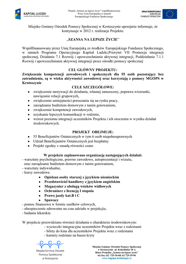 Projekt „Szansa na lepsze życie” współfinansowany Przez Unię Europejską w ramach Europejskiego Funduszu Społecznego Miejsko Gminny Ośrodek Pomocy Społecznej w Krotoszynie uprzejmie informuje, że kontynuuje w 2012 r. realizacje Projektu: „SZANSA NA LEPSZE ŻYCIE” Współfinansowany przez Unię Europejską ze środków Europejskiego Funduszu Społecznego, w ramach Programu Operacyjnego Kapitał Ludzki,Priorytet VII Promocja integracji społecznej, Działanie 7.1 Rozwój i upowszechnianie aktywnej integracji, Poddziałanie 7.1.1 Rozwój i upowszechnianie aktywnej integracji przez ośrodki pomocy społecznej CEL GŁÓWNY PROJEKTU: Zwiększenie kompetencji zawodowych i społecznych dla 55 osób pozostający bez zatrudnienia, są w wieku aktywności zawodowej oraz korzystają z pomocy MGOPS w Krotoszynie CELE SZCZEGÓŁOWE: zwiększenie motywacji do działania, własnej samooceny, poprawa wizerunki, nawiązanie relacji grupowych, zwiększenie umiejętności poruszania się na rynku pracy, zarządzanie budżetem domowym z tanim gotowaniem, zwiększenie kompetencji zawodowych, uzyskanie lepszych komunikacji w rodzinie, wzrost poziomu integracji uczestników Projektu i ich otoczenia w wyniku działań środowiskowych. PROJEKT OBEJMUJE: 55 Beneficjentów Ostatecznych w tym 6 osób niepełnosprawnych Udział Beneficjantów Ostatecznych jest bezpłatny Projekt zgodny z zasadą równości szans W projekcie zaplanowano organizację następujących działań: - warsztaty psychologiczne, prawno zawodowe, autoprezentacji i wizażu, oraz zarządzanie budżetem domowym z tanim gotowaniem, - warsztaty indywidualne, - kursy zawodowe. Opiekun osoby starszej z językiem niemieckim Przedstawiciel handlowy z językiem angielskim Magazynier z obsługą wózków widłowych Ochraniarz z licencją I stopnia Prawo jazdy kat.B i C Spawacz - pomoc finansowa w formie zasiłków celowych, - ubezpieczenie zdrowotne na czas udziału w projekcjie, - badania lekarskie. W projekcie przewidziano również działania o charakterze środowiskowym: - wycieczki integracyjne uczestników Projektu wraz z rodzinami - bilety do kina dla uczestników Projektu wraz z rodzinami - karnety rodzinne na basen kryty Miejsko Gminny Ośrodek Pomocy Społecznej w Krotoszynie ul. Kobylińska 10 A Biuro Projektu „Szansa na lepsze życie” tel./fax.:62 -725-36-68; 62 725-39-96 www.mgops.krotoszyn.pl