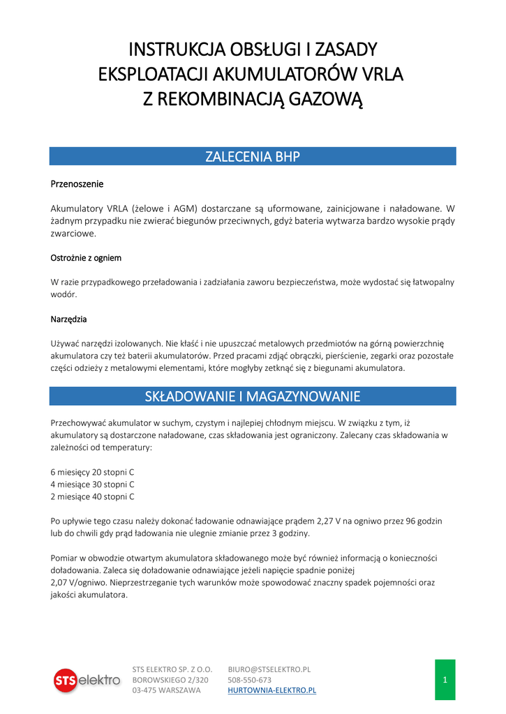 INSTRUKCJA OBSŁUGI I ZASADY EKSPLOATACJI AKUMULATORÓW VRLA Z REKOMBINACJĄ GAZOWĄ ZALECENIA BHP Przenoszenie Akumulatory VRLA (żelowe i AGM) dostarczane są uformowane, zainicjowane i naładowane. W żadnym przypadku nie zwierać biegunów przeciwnych, gdyż bateria wytwarza bardzo wysokie prądy zwarciowe. Ostrożnie z ogniem W razie przypadkowego przeładowania i zadziałania zaworu bezpieczeństwa, może wydostać się łatwopalny wodór. Narzędzia Używać narzędzi izolowanych. Nie kłaść i nie upuszczać metalowych przedmiotów na górną powierzchnię akumulatora czy też baterii akumulatorów. Przed pracami zdjąć obrączki, pierścienie, zegarki oraz pozostałe części odzieży z metalowymi elementami, które mogłyby zetknąć się z biegunami akumulatora. SKŁADOWANIE I MAGAZYNOWANIE Przechowywać akumulator w suchym, czystym i najlepiej chłodnym miejscu. W związku z tym, iż akumulatory są dostarczone naładowane, czas składowania jest ograniczony. Zalecany czas składowania w zależności od temperatury: 6 miesięcy 20 stopni C 4 miesiące 30 stopni C 2 miesiące 40 stopni C Po upływie tego czasu należy dokonać ładowanie odnawiające prądem 2,27 V na ogniwo przez 96 godzin lub do chwili gdy prąd ładowania nie ulegnie zmianie przez 3 godziny. Pomiar w obwodzie otwartym akumulatora składowanego może być również informacją o konieczności doładowania. Zaleca się doładowanie odnawiające jeżeli napięcie spadnie poniżej 2,07 V/ogniwo. Nieprzestrzeganie tych warunków może spowodować znaczny spadek pojemności oraz jakości akumulatora. STS ELEKTRO SP. Z O.O. BOROWSKIEGO 2/320 03-475 WARSZAWA [email protected] 508-550-673 HURTOWNIA-ELEKTRO.PL 1 INSTALOWANIE AKUMULATORA Akumulatory należy instalować w czystym, suchym miejscu. W normalnych warunkach użytkowania z akumulatora nie wydobywają się żadne gazy, dzięki czemu akumulator można montować wraz z innym sprzętem elektrycznym i elektronicznym. Temperatura Należy unikać ustawienia akumulatora w miejscach blisko źródła wysokiego ciepła. Najlepszą wydajność oraz trwałość akumulatora uzyska się wtedy, gdy temperatura robocza będzie w zakresie 200C -250C. Praca w wyższych temperaturach powoduje skrócenie jego żywotności. Wentylacja W normalnych warunkach wydzielanie gazu jest praktycznie znikome, a naturalna wentylacja wystarczy dla chłodzenia akumulatora i usunięcia ewentualnych skutków gazowania w wyniku nieprzewidzianego przeładowania. Dzięki tym cechom, akumulatory żelowe i AGM można instalować bezpiecznie w pomieszczeniach biurowych i innych gdzie przebywają ludzie. Jeżeli akumulator ma zostać zainstalowany w szafce, to należy podjąć odpowiednie środki ostrożności i zapewnić właściwą wentylację. Nie zaleca się umieszczać akumulatorów w szczelnych zamkniętych szafkach, bez otworów wentylacyjnych. Montaż Do prawidłowego montażu akumulatorów zaleca się stojaki lub szafki firm specjalistycznych. Umieścić akumulatory na stojaku i odpowiednio rozmieścić końcówki ujemne i dodatnie tak, aby umożliwić połączenie zgodnie ze schematem okablowania. Sprawdzić, czy wszystkie powierzchnie stykowe są czyste. Zamontować łączniki ogniw i bloków oraz śruby biegunów. Dobrze dokręcić śruby. Szczególnie uważać na połączenie między właściwymi biegunami w celu uniknięcia zwarcia zespołów ogniw. Połączyć końcówki akumulatora. Mocowanie śrub biegunów Maksymalny moment dokręcania śrub łączników Między ogniwowych wynosi 1 Nm (1mkg). Niewłaściwie dokręcony łącznik może spowodować poważne uszkodzenia w pracy urządzeń zasilających. ŁADOWANIE AKUMULATORA ŻELOWEGO Napięcie ładowania konserwującego napięcie w temperaturze: 2,35 V/ogniwo 0 stopni C 2,30 V/ogniwo 10 stopni C 2,27 v/ogniwo 20 stopni C 2,25 V/ogniwo 25 stopni C 2,23 V/ogniwo 30 stopni C Zalecane napięcie ładowania konserwującego wynosi 2,27 V/ogniwo w temperaturze 20st.C. Jeżeli temperatura otoczenia różni się ponad +-5st.C od temperatury wzorcowej, zaleca się dopasowanie napięcia ładowania konserwującego jak w powyższej tabeli. STS ELEKTRO SP. Z O.O. BOROWSKIEGO 2/320 03-475 WARSZAWA [email protected] 508-550-673 HURTOWNIA-ELEKTRO.PL 2 Z uwagi na zjawisko rekombinacji gazowej może wystąpić różnica +- 2% w napięciu pojedynczego ogniwa. Tym niemniej napięcie całkowite akumulatora powinno mieścić się w określonych powyżej granicach. Prąd ładowania Akumulatory VRLA powinny być używane wyłącznie z regulowanymi urządzeniami do ładowania o ograniczonym prądzie i stałym potencjale, z prądem ograniczonym do 10% dwudziestogodzinnej pojemności, co zapewnia najlepszą ich trwałość (maksymalnie 30% pojemności 20hr). Jednakże, jeśli w wyniku użytkowania roboczego następuje większe rozładowanie (głębokie rozładowanie DOD) poniżej 40% pojemności znamionowej, to prąd ładowania samoograniczą się i można ominąć ograniczenie prądowe. Szybkie ładowanie Okresowo (4-5 razy w roku) akumulator można ładować do 2,40 V na ogniwo prądem ograniczonym do 10% pojemności 20 godz. Szybkie ładowanie powinno zostać zatrzymane po ok 10-15 godzinach. Składowa zmienna prądu tętniącego Niedopuszczalne poziomy składowej zmiennej prądu tętniącego z prostownika mogą spowodować stałe uszkodzenia oraz zmniejszyć trwałość. Zaleca się ograniczenie stałe składowe zmienne prądu tętniącego do 0,1 C20hr (w amperach) lub >=1% napięcia znamionowego. Stan naładowania Stan naładowania akumulatora może zostać określony w przybliżeniu przez pomiar napięcia obwodu otwartego po tym jak akumulator był w stanie spoczynku przez minimum 24 godziny. Stan naładowania – napięcie 100% - 2,15 V/ogniwo 80% - 2,09 V/ogniwo 60% - 2,06 V/ogniwo 40% - 2,02 V/ogniwo 20% - 1,97 V/ogniwo WYŁADOWANIE Koniec napięcia wyładowczego Koniec napięcia wyładowczego musi być ograniczony do wartości podanych poniżej: 1,65 V