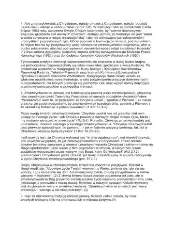 1. Aby zmartwychwstać z Chrystusem, należy umrzeć z Chrystusem, należy “opuścić nasze ciało i stanąć w obliczu Pana” (2 Kor 5,8). W instrukcji Piam et constantem z dnia 5 lipca 1963 roku, ówczesne Święte Oficjum ustanowiło, by “wiernie dochowywać zwyczaju grzebania ciał wiernych zmarłych”, dodając jednak, że kremacja nie jest “sama w sobie sprzeczna z religią chrześcijańską” i aby nie odmawiano już sakramentów i uroczystości pogrzebowych tym, którzy poprosili o kremację po śmierci, pod warunkiem, że wybór ten nie był podyktowany wolą “odrzucenia chrześcijańskich dogmatów, albo w duchu sekciarskim, albo też pod wpływem nienawiści wobec religii katolickiej i Kościoła”. (1) Owa zmiana dyscypliny kościelnej została później wprowadzona do Kodeksu Prawa Kanonicznego (1983) oraz do Kodeksu Kanonów Kościołów Wschodnich (1990). Tymczasem praktyka kremacji rozpowszechniła się znacząco w dużej liczbie krajów, ale jednocześnie rozpowszechniły się także nowe idee, sprzeczne z wiarą Kościoła. Po dokładnym wysłuchaniu Kongregacji ds. Kultu Bożego i Dyscypliny Sakramentów, Papieskiej Rady ds. Tekstów Prawnych oraz licznych Konferencji Episkopatów i Synodów Biskupich Kościołów Wschodnich, Kongregacja Nauki Wiary uznała za właściwe opublikować nową Instrukcję, w celu potwierdzenia przyczyn doktrynalnych i duszpasterskich, dla których preferuje się pochówek ciał, oraz wydać normy dotyczące przechowywania prochów w przypadku kremacji. 2. Zmartwychwstanie Jezusa jest kulminacyjną prawdą wiary chrześcijańskiej, głoszoną jako zasadnicza część Tajemnicy Paschalnej od samych początków chrześcijaństwa: “Przekazałem wam to, co przejąłem: że Chrystus umarł – zgodnie z Pismem – za nasze grzechy, że został pogrzebany, że zmartwychwstał trzeciego dnia, zgodnie z Pismem: i że ukazał się Kefasowi, a potem Dwunastu” (1 Kor 15,3-5). Przez swoją śmierć i zmartwychwstanie, Chrystus uwolnił nas od grzechu i dał nam dostęp do nowego życia: “Jak Chrystus powstał z martwych dzięki chwale Ojca, także i my możemy wkroczyć w nowe życie” (Rz 6,4). Ponadto, Chrystus zmartwychwstały jest początkiem i źródłem naszego przyszłego zmartwychwstania: “Chrystus zmartwychwstał jako pierwszy spośród tych, co pomarli…; i jak w Adamie wszyscy umierają, tak też w Chrystusie wszyscy będą ożywieni” (1 Kor 15,20–22). Jeśli prawdą jest, że Chrystus wskrzesi nas “w dniu ostatecznym”, jest również prawdą, pod pewnym względem, że już zmartwychwstaliśmy z Chrystusem. Przez chrzest bowiem jesteśmy zanurzeni w śmierci i zmartwychwstaniu Chrystusa i sakramentalnie do Niego upodobnieni: “jako razem z Nim pogrzebani w chrzcie, w którym też razem zostaliście wskrzeszeni przez wiarę w moc Boga, który Go wskrzesił” (Kol 2,12). Zjednoczeni z Chrystusem przez chrzest, już teraz uczestniczymy w sposób rzeczywisty w życiu Chrystusa zmartwychwstałego (por. Ef 2,6). Dzięki Chrystusowi w chrześcijaństwie śmierć ma znaczenie pozytywne. Kościół w liturgii modli się: “Albowiem życie Twoich wiernych, o Panie, zmienia się, ale się nie kończy, i gdy rozpadnie się dom doczesnej pielgrzymki, znajdą przygotowane w niebie wieczne mieszkanie”. (2) Z chwilą śmierci dusza zostaje oddzielona od ciała, ale w zmartwychwstaniu Bóg przywróci niezniszczalne życie naszemu przekształconemu ciału, jednocząc je ponownie z naszą duszą. Również w naszych czasach Kościół wezwany jest do głoszenia wiary w zmartwychwstanie: “Zmartwychwstanie zmarłych jest wiarą chrześcijan: wierząc w nie nimi jesteśmy”. (3) 3. Idąc za starodawną tradycją chrześcijańską, Kościół usilnie zaleca, by ciała zmarłych chowane były na cmentarzu lub w miejscu świętym.(4) We wspomnieniu śmierci, pogrzebania i zmartwychwstania Pana, tajemnicy w świetle której objawia się chrześcijański sens śmierci, (5) pochówek jest przede wszystkim najbardziej odpowiednią formą wyrażenia wiary i nadziei w zmartwychwstanie ciała. (6) Kościół, który jak Matka towarzyszył chrześcijaninowi podczas jego ziemskiej pielgrzymki, ofiaruje Ojcu, w Chrystusie, dziecko Jego łaski i powierza ziemi jego śmiertelne szczątki w nadziei, że zmartwychwstanie w chwale. (7) Grzebiąc ciała wiernych zmarłych, Kościół potwierdza wiarę w zmartwychwstanie ciała8 i zamierza uwydatnić wysoką godność ludzkiego ciała, jako nierozłącznej części osoby, której historię to ciało współdzieli. (9) Nie może zatem pozwolić na postawy i obrzędy, które uwzględniają błędne pojęcie śmierci, postrzeganej zarówno jako ostateczne unicestwienie osoby, jak i chwilę jej fuzji z matką naturą lub ze wszechświatem, jako etap w procesie reinkarnacji, lub też jako ostateczne wyzwolenie z ”więzienia” ciała. Ponadto pochówek na cmentarzach lub w innych miejscach świętych właściwie odpowiada współczuciu i szacunkowi, jakie należą się ciałom zmarłych wiernych, które przez chrzest stały się świątynią Ducha Świętego i którymi, “jak narzędziami i naczyniami, w sposób święty posłużył się Duch Święty, aby dokonać wielu dobrych dzieł”. (10) Sprawiedliwy Tobiasz wychwalany jest za zasługi zdobyte wobec Boga przez to, że grzebał zmarłych, (11) a Kościół uważa pochówek zmarłych za dzieło miłosierdzia wobec ciała. (12) Na koniec wreszcie pochówek ciał wiernych zmarłych na cmentarzach lub w innych miejscach świętych sprzyja pamięci i modlitwie za zmarłych ze strony rodziny i całej wspólnoty chrześcijańskiej, jak też czczenia męczenników i świętych. Przez pochówek ciał na cmentarzach, w kościołach czy na terenach do tego przystosowanych, tradycja chrześcijańska strzegła wspólnoty między żywymi i umarłymi, i przeciwstawiała się tendencji ukrywania lub prywatyzowania wydarzenia śmierci oraz znaczenia, jakie m