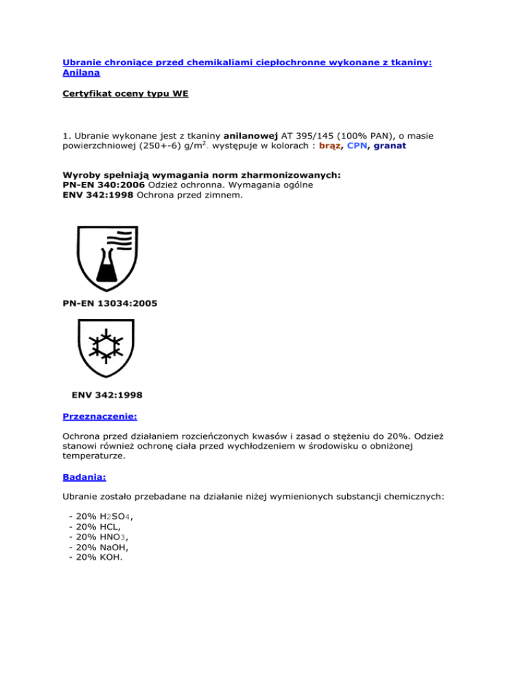Ubranie chroniące przed chemikaliami ciepłochronne wykonane z tkaniny: Anilana Certyfikat oceny typu WE 1. Ubranie wykonane jest z tkaniny anilanowej AT 395/145 (100% PAN), o masie powierzchniowej (250+-6) g/m2. występuje w kolorach : brąz, CPN, granat Wyroby spełniają wymagania norm zharmonizowanych: PN-EN 340:2006 Odzież ochronna. Wymagania ogólne ENV 342:1998 Ochrona przed zimnem. PN-EN 13034:2005 ENV 342:1998 Przeznaczenie: Ochrona przed działaniem rozcieńczonych kwasów i zasad o stężeniu do 20%. Odzież stanowi również ochronę ciała przed wychłodzeniem w środowisku o obniżonej temperaturze. Badania: Ubranie zostało przebadane na działanie niżej wymienionych substancji chemicznych: - 20% 20% 20% 20% 20% H2SO4, HCL, HNO3, NaOH, KOH. Dostępne typy ubrań: TYP UBRANIA SYMBOL bluza 3/4, spodnie do pasa MER-K 1008-C bluza 3/4, spodnie do pasa MER-K 1008-C/wz. spodnie ogrodniczki, bluza szwedka MER-K 1026-C spodnie ogrodniczki, bluza szwedka ze wzmocnieniami MER-K 1026/zw. spodnie ogrodniczki, bluza 3/4 MER-K 1028-C spodnie ogrodniczki, bluza 3/4 ze wzmocnieniami MER-K 1028-C/wz. Zdjęcia wyrobu: Bluza ¾ MER-1008/1028 Spodnie do pasa MER-1008/1028 Bluza MER – 1026 Spodnie MER- 1026 Jednostka notyfikowana biorąca udział w procesie oceny zgodności: Centralny Instytut Ochrony Pracy-Państwowy Instytut Badawczy, 00-701 Warszawa, ul. Czerniakowska 16