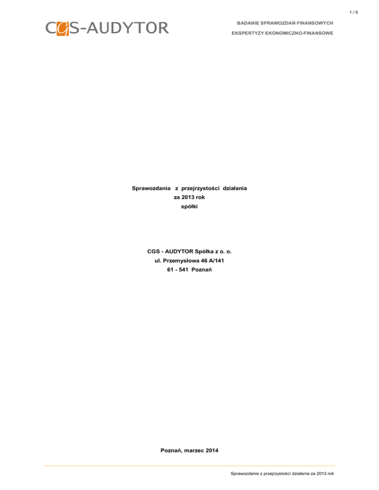 1/5 BADANIE SPRAWOZDAŃ FINANSOWYCH EKSPERTYZY EKONOMICZNO-FINANSOWE Sprawozdania z przejrzystości działania za 2013 rok spółki CGS - AUDYTOR Spółka z o. o. ul. Przemysłowa 46 A/141 61 - 541 Poznań Poznań, marzec 2014 Sprawozdanie z przejrzystości działania za 2013 rok 2/5 BADANIE SPRAWOZDAŃ FINANSOWYCH EKSPERTYZY EKONOMICZNO-FINANSOWE Spis treści 1. Wstęp ........................................................................................................................................................... 3 2. Informacje o formie organizacyjno prawnej oraz strukturze własnościowej Spółki (art.88 ust. 1a) ..................... 3 3. Przynależność do sieci, opis sieci, rozwiązania prawne i strukturalne w sieci (art. 88 ust.1 b)........................... 3 4. Opis struktury zarządzania podmiotu uprawnionego do badania (art.88 ust. 1c)............................................... 3 5. Opis systemu wewnętrznej kontroli jakości w Spółce i oświadczenie Zarządu na temat skuteczności jego funkcjonowania (art.88 ust. 1d) .......................................................................................................................... 3 6. Informacja na temat ostatniej kontroli w zakresie zapewnienia jakości przeprowadzona przez Krajową Komisję Nadzoru (art.88 ust. 1e)..................................................................................................................................... 3 7. Wykaz jednostek zainteresowania publicznego dla których podmiot uprawniony do badania wykonywał czynności rewizji finansowej w poprzednim roku obrotowym (art.88 ust. 1f)......................................................... 4 8. Oświadczenie o stosowanej przez Spółkę polityce w zakresie zapewnienia niezależności zawierające potwierdzenie, że została przeprowadzona wewnętrzna kontrola przestrzegania zasad niezależności (art.88 ust. 1g).................................................................................................................................................................... 4 9. Oświadczenie o stosowanej przez Spółkę polityce w zakresie doskonalenia zawodowego biegłych ( art.88 ust 1h ..................................................................................................................................................................... 4 10. Informacje o przychodach osiągniętych z wykonywanych czynności rewizji finansowej (art.88 ust. 1i) ............ 4 11. Zasady wynagradzania kluczowych biegłych rewidentów oraz członków zarządu (art.88 ust.1j) ..................... 4 12. Informacje końcowe wraz z wskazaniem biegłego rewidenta odpowiedzialnego za sporządzenie tego sprawozdania (art.88 ust.1j)............................................................................................................................... 5 Sprawozdanie z przejrzystości działania za 2013 rok 3/5 BADANIE SPRAWOZDAŃ FINANSOWYCH EKSPERTYZY EKONOMICZNO-FINANSOWE 1. Wstęp Niniejsze sprawozdanie publikowane jest zgodnie z wymogami artykułu 88 ustawy z 07.05.2009 roku o biegłych rewidentach i ich samorządzie, podmiotach uprawnionych do badania sprawozdań finansowych oraz o nadzorze publicznym. CGS-AUDYTOR Spółka z o.o. jest podmiotem uprawnionym do badania sprawozdań finansowych, wpisanym pod numerem 541 na liście Krajowej Rady Biegłych Rewidentów. W związku z tym, że Spółka wykonuje czynności rewizji finansowej w jednostkach zainteresowania publicznego przedstawia niniejsze sprawozdanie na swojej stronie internetowej w ciągu 3 miesięcy od zakończenia roku obrotowego. 2. Informacje o formie organizacyjno prawnej oraz strukturze własnościowej Spółki (art.88 ust. 1a) CGS-AUDYTOR Spółka z o.o. z siedzibą: 61-541 Poznań, ul. Przemysłowa 46 A/141, została zarejestrowana przez Sąd Rejonowy w Poznaniu w dniu 04.12.1992 roku. W dniu 18.10.2001 roku Sąd Gospodarczy, XXI Wydział KRS w Poznaniu dokonał wpisu spółki do rejestru przedsiębiorców pod numerem KRS 0000053463. Przedmiotem działalności Spółki jest działalność określona w art. w art. 48 ustawy z 07.05.2009 roku o biegłych rewidentach i ich samorządzie, podmiotach uprawnionych do badania sprawozdań finansowych oraz o nadzorze publicznym (DzU nr 77 poz. 649 z 22.05.2009 roku). Kapitał zakładowy Spółki wynosi 51.000,00 zł i dzieli się na 34 udziały o wartości 1.500,00 złotych każdy udział. Wspólnikami Spółki są: - Wiktor Gabrusewicz (88,24 %) kapitału - biegły rewident 918, - Przemysław Gabrusewicz (5,88 %) kapitału - biegły rewident 12064, - Michał Gabrusewicz (5,88 %) kapitału. 3. Przynależność do sieci, opis sieci, rozwiązania prawne i strukturalne w sieci (art. 88 ust.1 b) CGS-AUDYTOR Spółka z o.o. jest samodzielnym podmiotem uprawnionym do badania sprawozdań finansowych i nie przynależy do sieci. Spółka zawiera umowy cywilnoprawne w ramach podwykonawstwa z innymi podmiotami uprawnionymi do badania, których biegli w imieniu naszego podmiotu przeprowadzają badanie. 4. Opis struktury zarządzania podmiotu uprawnionego do badania (art.88 ust. 1c) CGS-AUDYTOR Spółka z o.o. jest zarządzana jednoosobowo przez Prezesa Zarządu Spółki w osobie biegłego rewidenta prof. dr hab. Wiktora Gabrusewicza. Zgodnie z postanowieniami umowy Spółki Zarząd może składać się z nie więcej niż 5 członków, przy czym większość członków Zarządu stanowić muszą biegli rewidenci. 5. Opis systemu wewnętrznej kontroli jakości w Spółce i oświadczenie Zarządu na temat skuteczności jego funkcjonowania (art.88 ust. 1d) W CGS-AUDYTOR funkcjonuje, opracowany przez Zarząd Spółki, wewnętrzny system kontroli jakości. Zarząd Spółki oświadcza, że został opracowany wewnętrzny system kontroli jakości i wdrożony zgodnie z zasadami o których mowa w art. 21 ust 3 pkt b ustawy. 6. Informacja na temat ostatniej kontroli w zakresie zapewnienia jakości przeprowadzona przez Krajową Komis