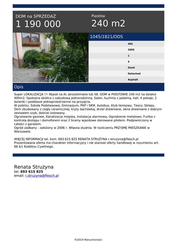 DOM na SPRZEDAŻ 1 190 000 Piastów 240 m2 1045/1821/ODS 465 2005 1 5 Good Detached Asphalt Opis Super LOKALIZACJA !!! Wjazd na Al. Jerozolimskie lub S8. DOM w PIASTOWIE 240 m2 na działce 495m2. Spokojna okolica z zabudową jednorodzinną. Salon, kuchnia z jadalnią, hall, 4 pokoje, 2 łazienki i poddasze jednoprzestrzenne na przyjęcia. W pobliżu: Szkoła Podstawowa, Gimnazjum, PKP i SKM, Autobus, Klub tenisowy, Tesco, Sklepy. Dom zbudowany z cegły ceramicznej, kryty dachówką, drzwi drewniane, okna drewniane z dobrym zestawem szyb, dobrze izolowany. Ogrzewanie gazowe, Kanalizacja miejska, Instalacja alarmowa, Ogrodzenie metalowe, Furtka z kontrolą dostępu i domofonem oraz 2 bramy wjazdowe sterowane pilotem. Podpiwniczony w całości z garażem. Ogród zadbany - założony w 2006 r. Własna studnia. W rozliczeniu PRZYJMĘ MIESZKANIE w Warszawie. WIĘCEJ INFORMACJI tel. kom. 693 615 825 RENATA STRUŻYNA [email protected] Prezentowana oferta ma charakter informacyjny i nie stanowi oferty handlowej w rozumieniu art. 66 &1 Kodeksu Cywilnego. Renata Strużyna tel. 693 615 825 email: [email protected] FLESCH Nieruchomości Powered by TCPDF (www.tcpdf.org)