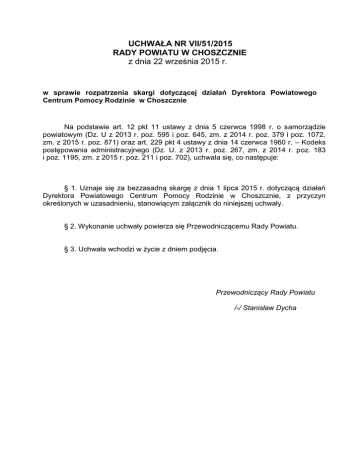 UCHWAŁA NR VII/51/2015 RADY POWIATU W CHOSZCZNIE z dnia 22 września 2015 r. w sprawie rozpatrzenia skargi dotyczącej działań Dyrektora Powiatowego Centrum Pomocy Rodzinie w Choszcznie Na podstawie art. 12 pkt 11 ustawy z dnia 5 czerwca 1998 r. o samorządzie powiatowym (Dz. U z 2013 r. poz. 595 i poz. 645, zm. z 2014 r. poz. 379 i poz. 1072, zm. z 2015 r. poz. 871) oraz art. 229 pkt 4 ustawy z dnia 14 czerwca 1960 r. – Kodeks postępowania administracyjnego (Dz. U. z 2013 r. poz. 267, zm. z 2014 r. poz. 183 i poz. 1195, zm. z 2015 r. poz. 211 i poz. 702), uchwala się, co następuje: § 1. Uznaje się za bezzasadną skargę z dnia 1 lipca 2015 r. dotyczącą działań Dyrektora Powiatowego Centrum Pomocy Rodzinie w Choszcznie, z przyczyn określonych w uzasadnieniu, stanowiącym załącznik do niniejszej uchwały. § 2. Wykonanie uchwały powierza się Przewodniczącemu Rady Powiatu. § 3. Uchwała wchodzi w życie z dniem podjęcia. Przewodniczący Rady Powiatu /-/ Stanisław Dycha Uzasadnienie do uchwały nr VII/51/2015 Rady Powiatu w Choszcznie z dnia 22 września 2015 r. w sprawie rozpatrzenia skargi dotyczącej działań Dyrektora Powiatowego Centrum Pomocy Rodzinie w Choszcznie W dniu 8 lipca 2015 r. do Rady Powiatu w Choszcznie wpłynęła skarga Pani N. P. dotycząca nieprzyznania dla skarżącej dodatku na usamodzielnienie się, jako pomocy dla osoby pełnoletniej opuszczającej zakład poprawczy. Zgodnie z treścią art. 227 k.p.a. przedmiotem skargi może być w szczególności zaniedbanie lub nienależyte wykonywanie zadań przez właściwe organy albo przez ich pracowników, naruszenie praworządności lub interesów skarżących, a także przewlekłe lub biurokratyczne załatwienie spraw. W myśl zaś art. 229 pkt 4 kodeksu postępowania administracyjnego – organem właściwym do rozpatrzenia skargi dotyczącej zadań lub działalności Zarządu Powiatu oraz kierowników powiatowych służb, inspekcji, straży i innych jednostek organizacyjnych jest Rada Powiatu. W związku z obowiązującą w tym zakresie procedurą, skarga została skierowana do Komisji Rewizyjnej. Po rozpoznaniu treści skargi na posiedzeniu Komisji Rewizyjnej w dniu 08.09.2015r. oraz po zapoznaniu się z treścią wyjaśnień Dyrektora Powiatowego Centrum Pomocy Rodzinie w Choszcznie z dnia 29.07.2015 r. Komisja ustaliła następujący stan faktyczny i prawny. Wychowanka Zakładu Poprawczego w Koronowie Pani N.P jako osoba pełnoletnia podlega ustawie z dnia 12 marca 2004 r. o pomocy społecznej. (Dz. U. z 2015 r. poz. 163 ze zm.). Zgodnie z art. 88 ust. 1 powołanej wyżej ustawy, osoba pełnoletnia opuszczająca m.in. zakład poprawczy, zostaje objęta pomocą, mającą na celu jej życiowe usamodzielnienie i integrację ze środowiskiem przez pracę socjalną, a także pomocą pieniężną: 1) na usamodzielnienie; 2) na kontynuowanie nauki; 3) w uzyskaniu odpowiednich warunków mieszkaniowych, w tym w mieszkaniu chronionym; 4) w uzyskaniu zatrudnienia; 5) na zagospodarowanie - w formie rzeczowej. Warunkiem uzyskania pomocy, o której mowa w ust. 1, zgodnie z ust. 6 ustawy o pomocy społecznej jest zobowiązanie się osoby usamodzielnianej do realizacji indywidualnego programu usamodzielnienia, opracowanego wspólnie z opiekunem usamodzielnienia, zatwierdzonego przez dyrektora powiatowego centrum pomocy rodzinie. Indywidualny program usamodzielnienia powinien uwzględniać m.in.: wspieranie osoby usamodzielnianej w kontaktach z rodziną i środowiskiem; sposób uzyskania wykształcenia lub kwalifikacji zawodowych; pomoc w ustaleniu uprawnień do ubezpieczenia zdrowotnego; pomoc w podjęciu zatrudnienia oraz zorganizowaniu odpowiednich warunków mieszkaniowych (umożliwienie zamieszkania w mieszkaniu chronionym, pokrycie wydatków związanych z wynajmem pokoju, ułatwienie uzyskania mieszkania socjalnego z zasobów gminy). Ponadto program powinien zawierać pisemną deklarację osoby usamodzielnianej, że pomoc będzie przeznaczona na zaspokojenie ważnej życiowej potrzeby, np. na polepszenie warunków mieszkaniowych, pokrycie wydatków związanych z nauką lub podniesieniem kwalifikacji zawodowych albo na stworzenie warunków do działalności zarobkowej. Jak wynika z wyjaśnień udzielonych przez Panią Dyrektor PCPR Marię Jędrzejczyk skarżąca po opuszczeniu Zakładu Poprawczego w Koronowie, zgodnie z założeniami zawartymi w indywidualnym programie usamodzielnienia opracowanym dnia 23.12.2009 r., po rozpoczęciu nauki w Prywatnym Liceum Ogólnokształcącym przy Centrum Edukacyjnym OMNIBUS otrzymywała z Powiatowego Centrum Pomocy Rodzinie w Choszcznie pomoc pieniężną z tytułu kontynuowania nauki. Powyższe świadczenie miała wypłacane w okresie 01.10.2011 r. – 31.08.2014 r. Pomoc ta wynosiła miesięcznie 494,10 zł. Pani N.K korzystała również z możliwości podniesienia kwalifikacji zawodowych poprzez udział w kursach zawodowych w ramach projektu Kieruj swoim losem. W 2011 r. ukończyła kurs kucharza oraz uczestniczyła w szkoleniu pt. „Doskonała fryzura i makijaż do pracy”. Na wniosek z dnia 20.12.2013 r. została w dniu 30.12.2013 r. przyznana dla skarżącej pomoc na zagospodarowanie w formie rzeczowej w wysokości 1646,59 zł. Zgodnie z § 2 ust. 1 pkt 3 Rozporządzenia Ministra Pracy i Polityki Społecznej z dnia 3 sierpnia 2012 r. w sprawie udzielania pomocy na usamodzielnienie, kontynuowanie nauki oraz zagospodarowanie (Dz.U. z 2012r. poz. 954) jednym z warunków przyznania pomocy pieniężnej na usamodzielnienie i pomocy pieniężnej na kontynuowanie nauki, przez starostę właściwego do przyznania tej pomocy jest złożenie wniosku o przyznanie pomocy. Jak wynika z ustaleń, skarżąca takiego wniosku nie złożyła. Ponadto, jedną z czynności poprzedzającą fakt przyznania pomocy na usamodzielnienie jest przeprowadzenie wywiadu środowiskowego i zebranie informacji na temat dochodów rodziny. Zgodnie z informacjami przekazanymi przez Panią Marię J