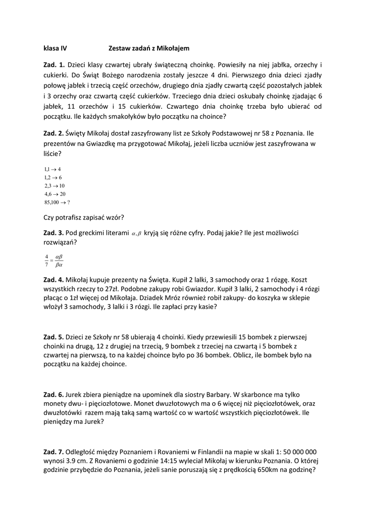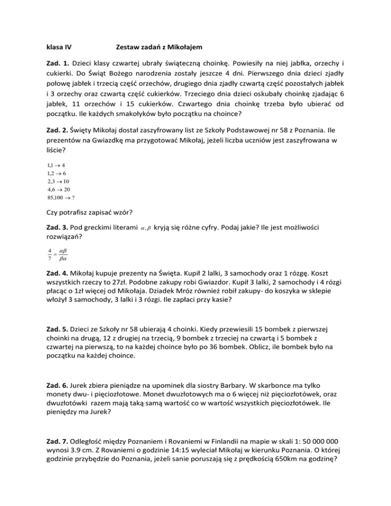 klasa IV Zestaw zadań z Mikołajem Zad. 1. Dzieci klasy czwartej ubrały świąteczną choinkę. Powiesiły na niej jabłka, orzechy i cukierki. Do Świąt Bożego narodzenia zostały jeszcze 4 dni. Pierwszego dnia dzieci zjadły połowę jabłek i trzecią część orzechów, drugiego dnia zjadły czwartą część pozostałych jabłek i 3 orzechy oraz czwartą część cukierków. Trzeciego dnia dzieci oskubały choinkę zjadając 6 jabłek, 11 orzechów i 15 cukierków. Czwartego dnia choinkę trzeba było ubierać od początku. Ile każdych smakołyków było początku na choince? Zad. 2. Święty Mikołaj dostał zaszyfrowany list ze Szkoły Podstawowej nr 58 z Poznania. Ile prezentów na Gwiazdkę ma przygotować Mikołaj, jeżeli liczba uczniów jest zaszyfrowana w liście? 1,1 4 1,2 6 2,3 10 4,6 20 85,100 ? Czy potrafisz zapisać wzór? Zad. 3. Pod greckimi literami rozwiązań? , kryją się różne cyfry. Podaj jakie? Ile jest możliwości 4 7 Zad. 4. Mikołaj kupuje prezenty na Święta. Kupił 2 lalki, 3 samochody oraz 1 rózgę. Koszt wszystkich rzeczy to 27zł. Podobne zakupy robi Gwiazdor. Kupił 3 lalki, 2 samochody i 4 rózgi płacąc o 1zł więcej od Mikołaja. Dziadek Mróz również robił zakupy- do koszyka w sklepie włożył 3 samochody, 3 lalki i 3 rózgi. Ile zapłaci przy kasie? Zad. 5. Dzieci ze Szkoły nr 58 ubierają 4 choinki. Kiedy przewiesili 15 bombek z pierwszej choinki na drugą, 12 z drugiej na trzecią, 9 bombek z trzeciej na czwartą i 5 bombek z czwartej na pierwszą, to na każdej choince było po 36 bombek. Oblicz, ile bombek było na początku na każdej choince. Zad. 6. Jurek zbiera pieniądze na upominek dla siostry Barbary. W skarbonce ma tylko monety dwu- i pięciozłotowe. Monet dwuzłotowych ma o 6 więcej niż pięciozłotówek, oraz dwuzłotówki razem mają taką samą wartość co w wartość wszystkich pięciozłotówek. Ile pieniędzy ma Jurek? Zad. 7. Odległość między Poznaniem i Rovaniemi w Finlandii na mapie w skali 1: 50 000 000 wynosi 3.9 cm. Z Rovaniemi o godzinie 14:15 wyleciał Mikołaj w kierunku Poznania. O której godzinie przybędzie do Poznania, jeżeli sanie poruszają się z prędkością 650km na godzinę?
